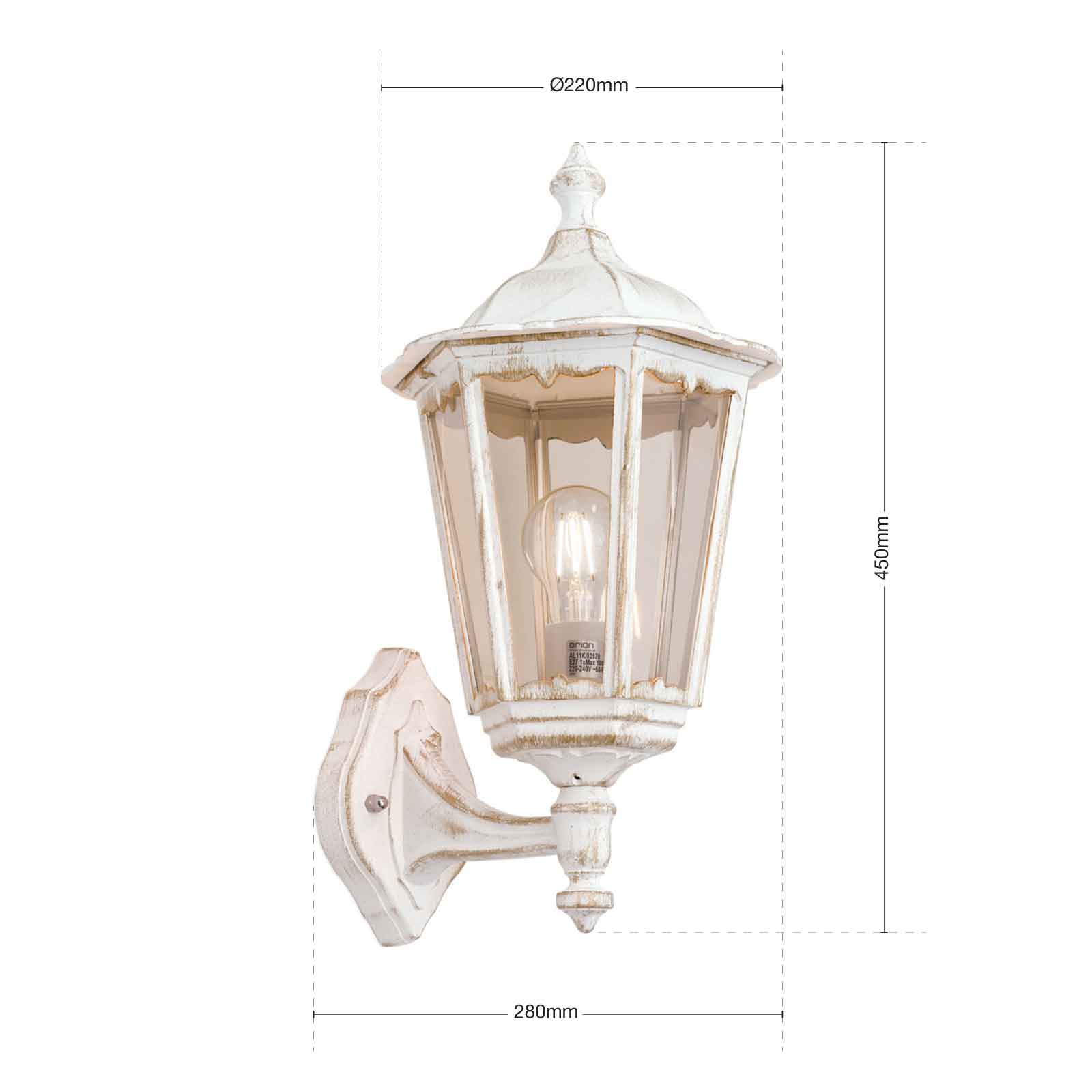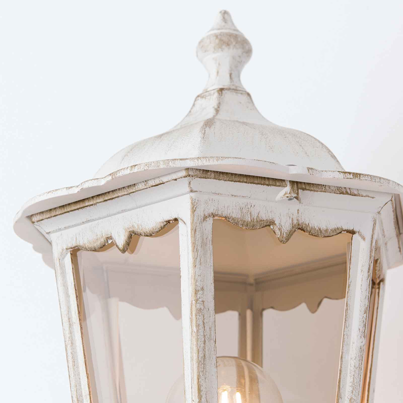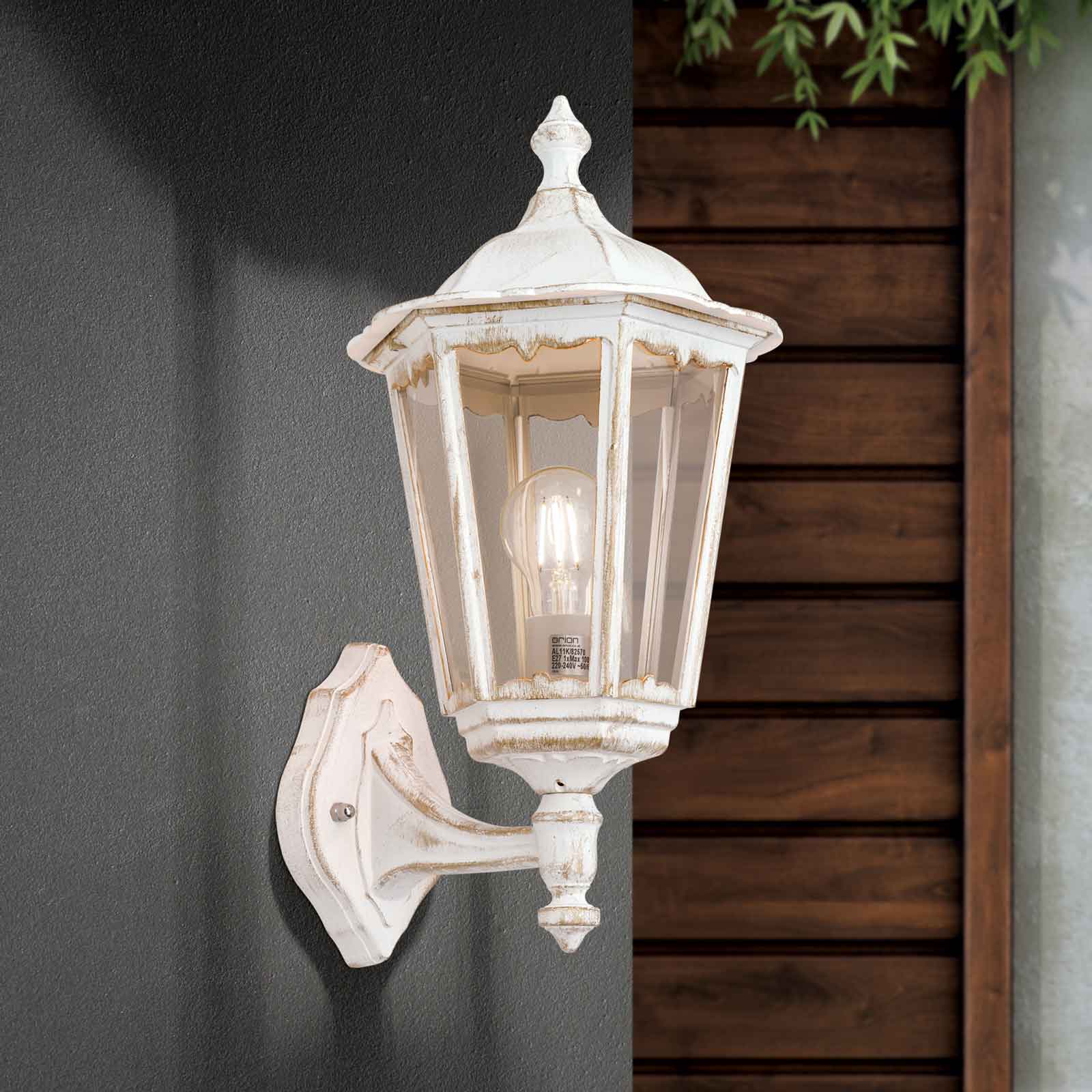Die weiß-goldenfarbene Restaurant Außenlampe antik aus unserer Leuchtenserie Graz besticht mit ihrem klassisch-antiken Flair im Rokoko-Stil. Die authentische Wandlaterne eignet sich als Blickfang im Hauseingang, als dekorative Terrassenbeleuchtung oder auch als stilvolle Außenbeleuchtung an Nebengelassen wie Schuppen oder Carport/Garage. Die formschöne Außenleuchte passt vom Design unter anderem optisch sehr gut zu weiß geklinkerten Häusern und einem klassischen Baustil. Das besondere Flair entsteht bei der Restaurant Außenlampe antik durch die Verbindung der klassischen Farben Weiß und Gold und die etwas verspielte Form.