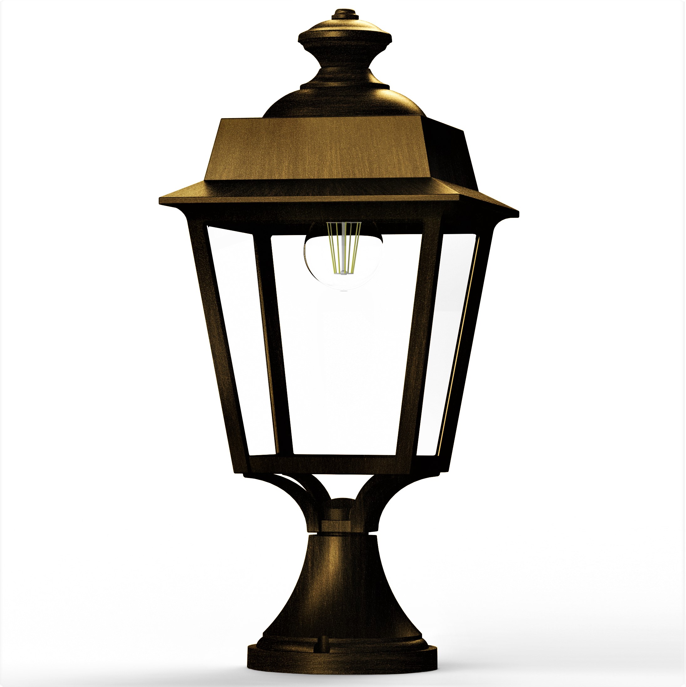 Die hochwertige Restaurant Sockelleuchte 48cm gehört zu unserer Modellserie Vogese 1 und überzeugt optisch mit einem klassischen Design. Die wetterfeste Gartenlaterne mit Sockel ist von ihren Maßen 48,4 cm hoch und 22 cm breit. Die hochwertig verarbeitete Designerleuchte wird aus Aluminium gefertigt. Bei der klassischen Sockellampe stehen Ihnen je nach Geschmack und örtlichen Vorgaben bis zu 8 verschiedene Farben/RAL-Farben zur Verfügung. Wählen Sie bei der Restaurant Sockelleuchte zwischen diversen Farben wie tiefschwarz (RAL 9005), weiß, schiefergrau, tannengrün (RAL 6009), sandsteinfarben, alt-rustikal, grün-Patina oder gold-Patina. Der französische Hersteller gibt ab Werk auf das beschichtete Aluminium eine 25-jährige Anti-Korrosionsgarantie*. Die vier Fenstereinsätze werden aus klarem oder aus opalfarbenen PMMA gefertigt. PMMA ist ein Kunststoff, der sich insbesondere durch seine Brillianz und Kratzfestigkeit auszeichnet. Wer ein blendfreies Licht bevorzugt, sollte sich für die Variante PMMA opalfarben entscheiden. Die absolut stilvolle Gartenleuchte Modell Vogese 1 entspricht der Schutzart IP 65 (absolut wasserbeständig) sowie der Schutzklasse 1. Bringen Sie mit der hochwertigen Sockelleuchte Licht ins Dunkle Ihrer Außenanlagen. Die dekorative Außenleuchte macht mit ihrem kleinen rundförmigen Sockel aber auch bei Tage eine gute Figur. Der Sockelfuß weist am Boden einen Durchmesser von 14 Zentimetern auf.