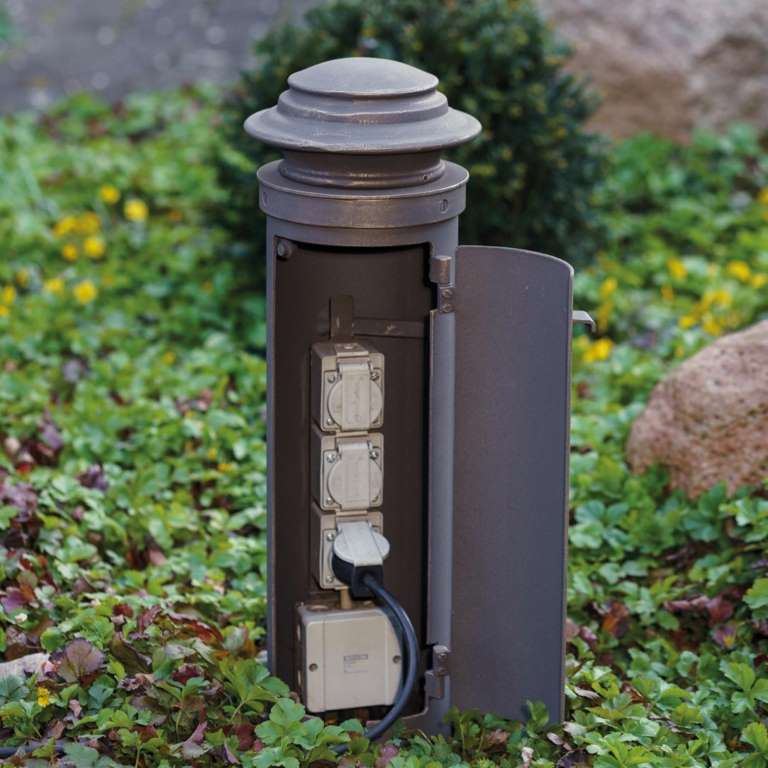 Der qualitativ sehr hochwertige Steckdosenpoller außen gehört zu unserer Leuchtenserie Modell Florenz. Das zeitlose bis klassische Design fügt sich sehr gut in eine moderne Architektur ein, passt aber auch sehr gut zu einem historischem Gebäude oder auch dem heute sehr beliebten Landhausstil. Die qualitativ hochwertige Gartensteckdose mit drei unsichtbar integrierten Steckdosen ist die ideale Ergänzung für jeden Garten, wo immer wieder mal extern eine Stromquelle benötigt wird. Hierbei wird einfach eine Klappe geöffnet, Stecker rein und Klappe zu- das Kabel findet unten durch eine smarte Öffnung seinen Weg nach Draußen- auch bei geschlossener Klappe/ Tür. Der im Design klassische Steckdosenpoller außen bietet die Möglichkeit, nach außen nicht sichtbar, schnell und unkompliziert elektrische Geräte, die Weihnachtsbeleuchtung oder andere strombenötigende Elemente zu aktivieren. Der dekorative Steckdosenpoller außen zeigt optisch Rundornamente am oberen Ende des Pollers. Die massiven Scharniere mit dem Türelement mit kleiner massiver Griffleiste schützen die Steckdosen nach außen und geben durch leichtes Öffnen schnell und praktisch die Möglichkeit in Sekunden ein elektrisches Gerät mit Schukostecker mit Strom zu versorgen. Der massive Poller mit seinen 3 Steckdosen wird unten direkt an ein vorhandenes Erdkabel angeschlossen. Das Finish in Alt Bronze verleiht der dekorativen Stromlösung einen klassisch-historischen Look, der sich harmonisch in jede Umgebung einfügt. Die hochwertigen Materialien feuerverzinkter Stahl und Aluminium sorgen für Langlebigkeit und Widerstandsfähigkeit gegen Witterungseinflüsse. Die Steckdosensäule ist von ihren Maßen 60 cm hoch und 20 cm breit. Das Gesamtgewicht beträgt 9 kg. Den stilvollen Steckdosenpoller außen gibt es auch in weiteren Finishes wie Terra, Eisen natur, Taverna, schwarz, schwarz-silber, Patina, Alt-Kupfer, Vintage, grün-antik und Steampunk. Der handgefertigte Poller wird in einer deutschen Leuchtenmanufaktur fachmännisch hergestellt. Den Strompoller gibt es auch mit Beleuchtung, unsere Aussenleuchte mit Steckdose.
