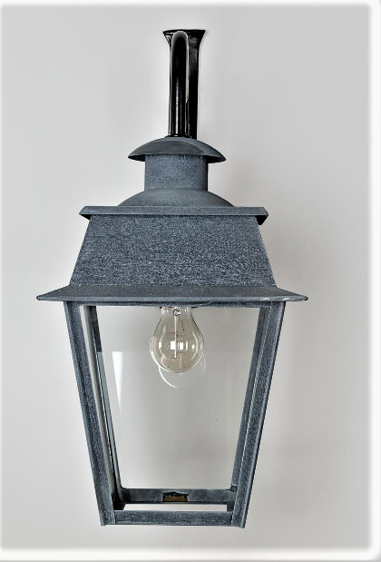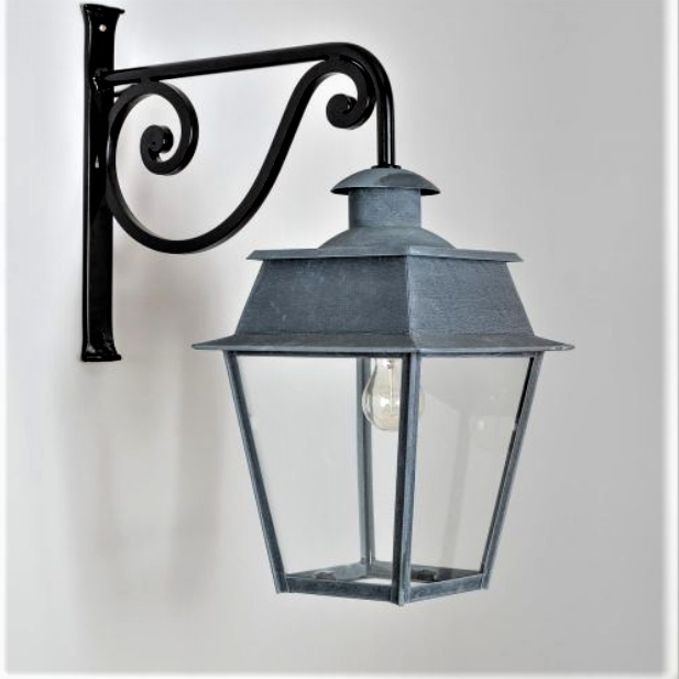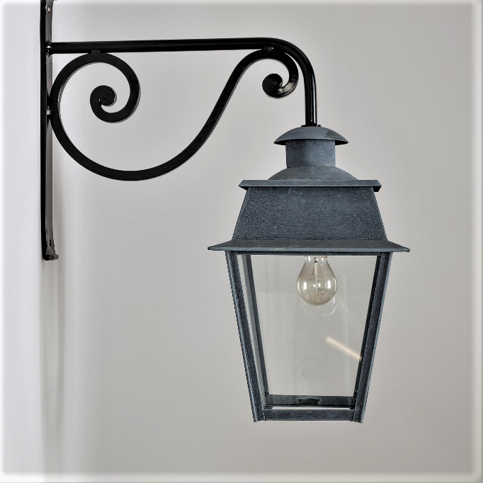 Die Vintage Wandleuchte der Serie Bordeaux ist 41 cm hoch und 27 cm breit. Die Fenstereinsätze bestehen bei der nostalgischen Aussenleuchte aus Echtglas. Leuchtmittel sind bei Lieferung nicht enthalten. In Schmiedeeisen oder Messing ist der galgenförmige Wandarm die notwendige Ergänzung zu Ihrerneuen Wandlaterne. Die Wahl der Größe dieses Galgens (Abstand von der Wand bis zur Achse der Laterne) hängt von der Größe der Laterne ab. Je größer die Laternen-Wandleuchte ist, desto mehr muss sie von der Wand abgesetzt werden. Die Galgen sind auch als Eckgalgen erhältlich. Der 50 cm tiefe Wandarm wird hier mit schwarzer Lackierung angeboten, ist auf Anfrage aber auch gern mit einem anderen Finish erhältlich. Suchen Sie eher eine große Laterne als Deckenbeleuchtung? Dann schauen Sie sich doch mal die 74 cm hohe Vintage Hängeleuchte der Serie Bordeaux an. Gern erstellen wir Ihnen ein persönliches Angebot zu der Wandleuchte im passendem Finish Alt-Zink.
