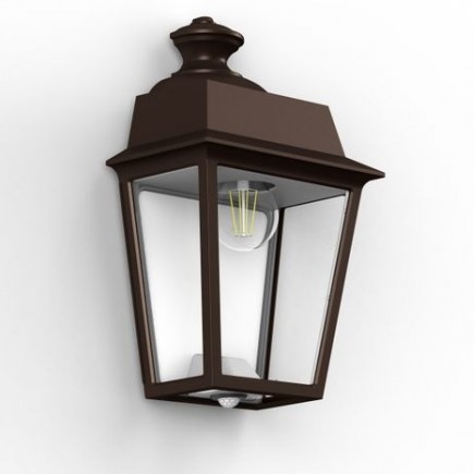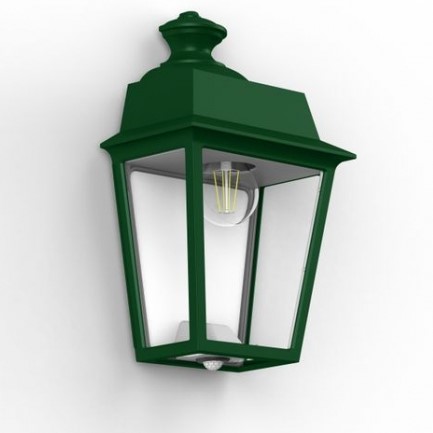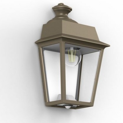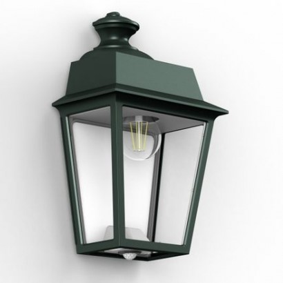 Die stilvolle Wandlampe außen mit Bewegungsmelder aus der Leuchtenserie Vogese 1 ist eine dreiseitige Wandlaterne, die direkt rückseitig an der Hausfassade angebracht wird. An der Unterseite der Wandleuchte ist ein Bewegungsmelder in der Leuchte integriert, der Bewegungen mit einer Reichweite bis zu 5 Metern erfasst und dann vollautomatisch die Beleuchtung aktiviert. Hierbei kann die Leuchtdauer von 5 Sekunden bis zu 30 Minuten individuell mithilfe einer beiliegenden Fernbedienung eingestellt werden. Die wetterfeste Außenwandleuchte ist hochwertig verarbeitet und von ihren Maßen 34 cm hoch, 21,6 cm breit und ganze 13,2 cm tief. Die Maße der Wandmanschette zur Befestigung an der Hauswand betragen eine Breite von 21,6 cm und eine Höhe von 34 cm. Mithilfe der sogenannten Boomerang-Wandbefestigung lässt sich die dekorative Wand-Außenleuchte recht schnell und einfach montieren. Die stilvolle Wandleuchte mit Bewegungsmelder Vogese 1 wird aus Aluminium gefertigt. Bei der im Design klassischen Hauswandbeleuchtung stehen Ihnen je nach Geschmack und örtlichen Vorgaben bis zu 8 verschiedene Farben/RAL-Farben zur Verfügung. Wählen Sie bei der dekorativen Wandlampe außen mit Bewegungsmelder zwischen den Farben tiefschwarz (RAL 9005), weiß, schiefergrau, tannengrün (RAL 6009), sandsteinfarben, alt-rustikal, grün-Patina oder gold-Patina. Der französische Hersteller Roger Pradier gibt ab Werk auf das beschichtete Aluminium eine 25-jährige Anti-Korrosionsgarantie*. Die drei Fenstereinsätze werden aus klarem oder opalfarbenen hochwertigem PMMA gefertigt, einem Kunststoff, der sich insbesondere durch seine Brillianz und Kratzfestigkeit auszeichnet. Wer es also absolut blendfrei benötigt, sollte sich für die Variante PMMA opalfarben entscheiden.