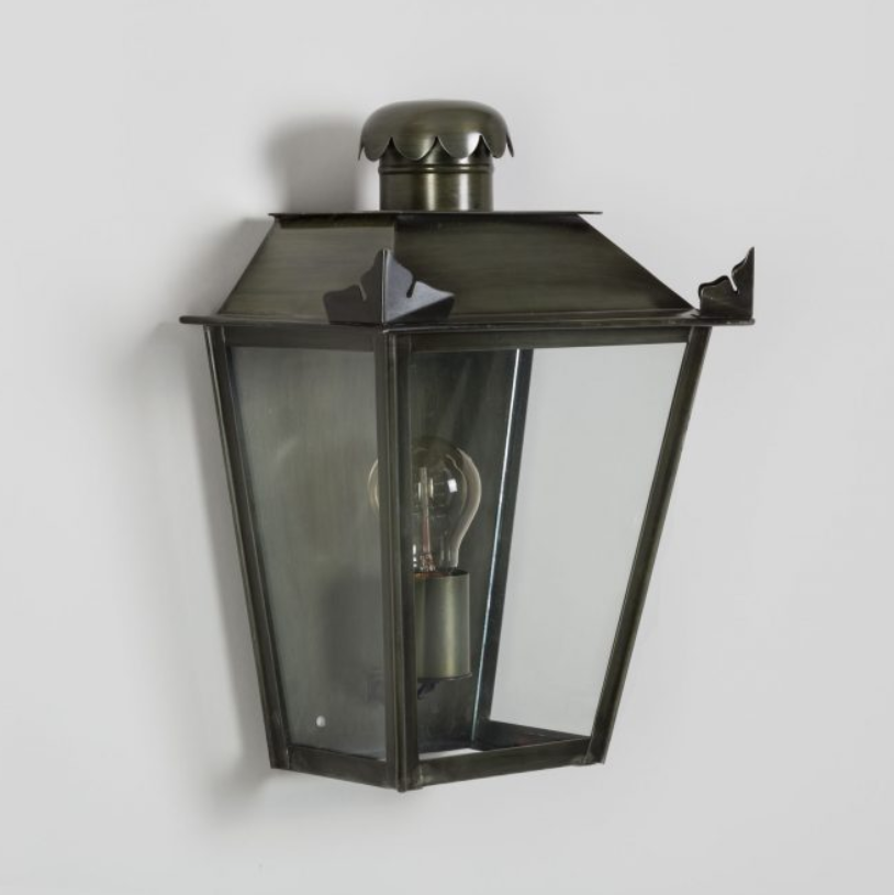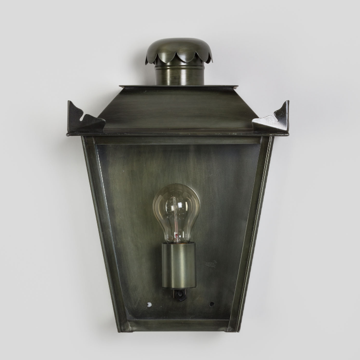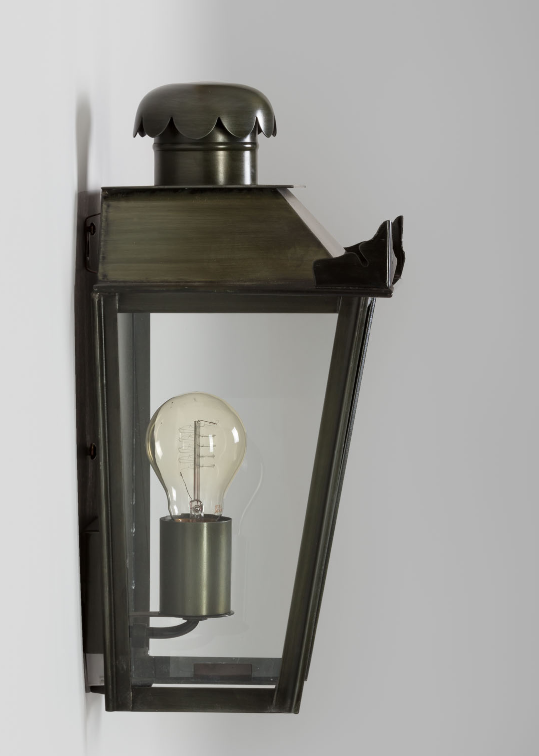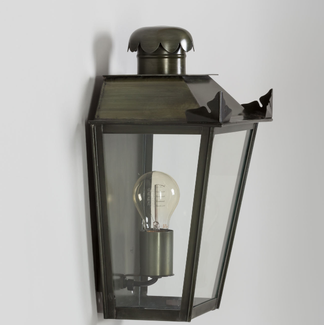 Die Wandlaterne eckig 34cm ist von den Maßen 34 cm hoch, 26 cm breit und 18 cm tief. Die Wandlaterne eckig aus der Modellserie "Petit Manoir" wurde im französischen Atelier Lumart entworfen, inspiriert nach Vorbildern aus dem französischen 18. Jahrhundert. Der zarte Fries des Schornsteinelements harmoniert dabei mit den eichenblattförmigen Ausschnitten an den Enden des Leuchtendaches. Obwohl diese vom Stil antik-nostalgische Wandleuchte für die Verwendung im Freien bestimmt ist, findet sie auch gern ihren Platz in einem Eingang, einem Flur, einem Korridor oder einer Galerie im Innenbereich eines Hauses. Die antik-nostalgische Wandlampe für den Außenbereich lässt sich auch sehr schön im Haustürbereich als Lichtquelle einplanen. Die Wandlaterne eckig 34cm trägt eine Fassung der Größe E 27 und wird mit Leuchtmitteln bis 75 Watt Leistung bestückt. Für eine für die Augen angenehme Beleuchtung empfehlen wir Leuchtmittel mit warm-weißem Licht (z.B. 2700 Kelvin). Leuchtmittel im Retrolook passen dabei optisch besonders gut zu dem nostalgischn Style der Wandleuchte. Die Wandlaterne eckig aus der der Kollektion Petit Manoir wird aus massivem Zink mit dem Finish Zink patiniert in echter Handarbeit individuell angefertigt.
