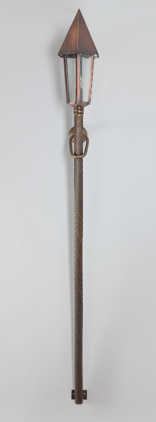 Die Wandleuchte Landhausstil 190cm aus der Modellserie Castel überzeugt mit ihrem außergewöhnlichen Design. Daie dekorative Aussenbeleuchtung erinnert an die Hofbeleuchtung von Schlössern und Burgen aus früheren Zeiten. Schaffen Sie mit der 1,90 Meter langen Wandleuchte ein altertümliches Ambiente der besonderen Art. Das massive Messing der vom Stilantik-rustikalen Aussenleuchte ist säurepatiniert, ebenso das bei der Leuchtenherstellung verarbeitete Kupfer. Der Wandabstand beträgt bei dieser Fackelleuchte etwa 22 cm. Die Außenwandleuchte hat eine Gesamttiefe von 35 cm. Die Wandleuchte Landhausstil 190cm passt sehr schön in den Eingangsbereich, als Gartenbeleuchtung an Nebengelassen oder auch seitlich von Einfahrten.