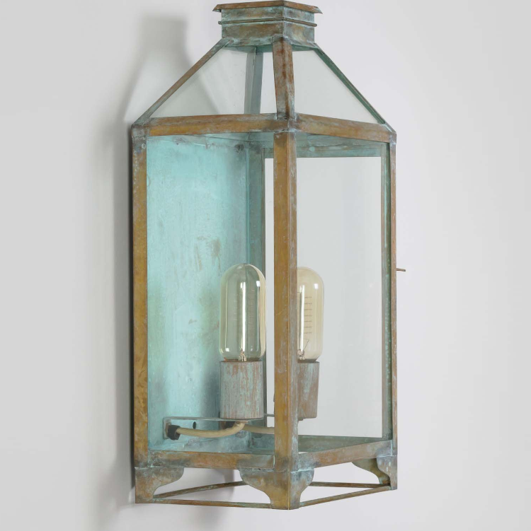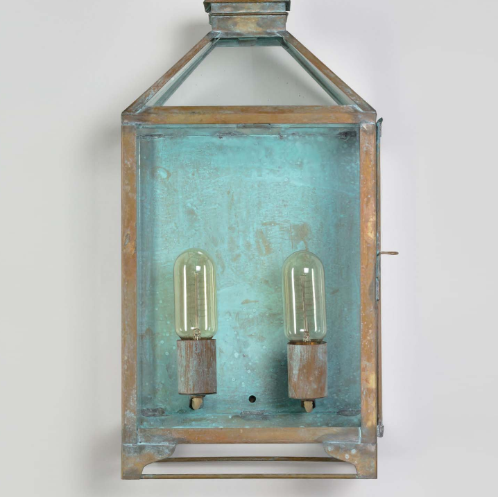 Die Wandleuchte Landhausstil 50cm wirkt als stilvolle Außenleuchte recht transparent. Die nostalgische Aussenleuchte aus der Modellserie Aix vermittelt alte Traditionen und einem Hauch von französischen Charme. Die vom Design antik-rustikal-nostalgische Gartenbeleuchtung zeigt klare Linien und zieht mit ihren besonderen Farben und der Grünspan-Oberfläche sicherlich so manche Blicke auf sich. Patina bezeichnet korrekt den natürlichen Vorgang der Verwitterung von Messing-und Kupferlegierungen durch Umwelteinflüsse. Bei dieser Leuchte wird der Effekt fachmännisch mit besonderen Techniken künstlich erzeugt. Die dekorative Aussenwandleuchte stammt sowohl vom Design als auch der Herstellung aus einer französischem Leuchtenmanufaktur. Die Wandleuchte Landhausstil 50cm ist von den Maßen 50 cm hoch, 26 cm breit und hat eine Tiefe von 19 cm.
