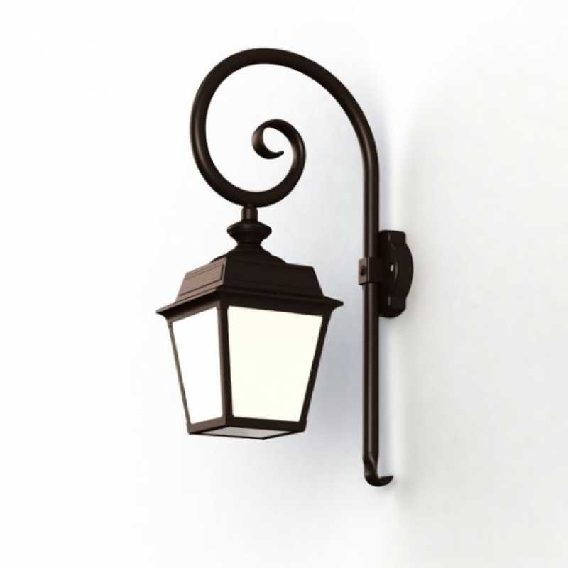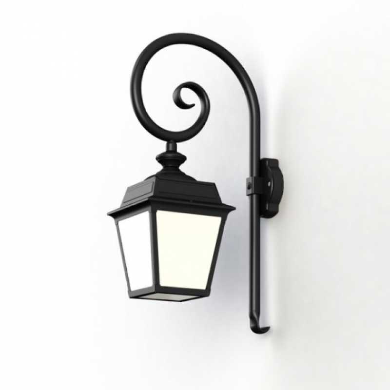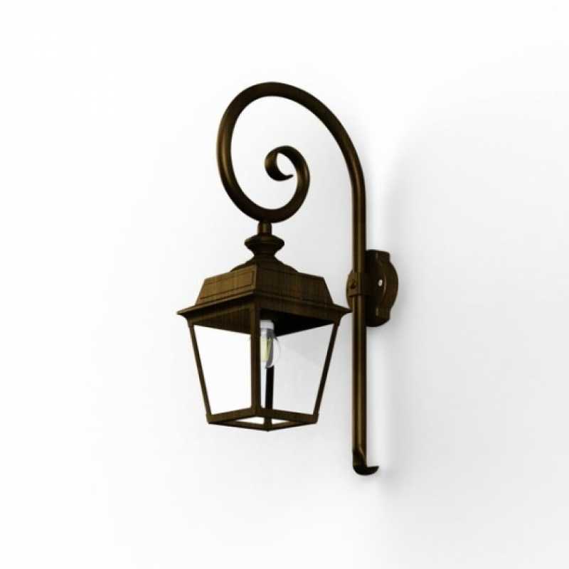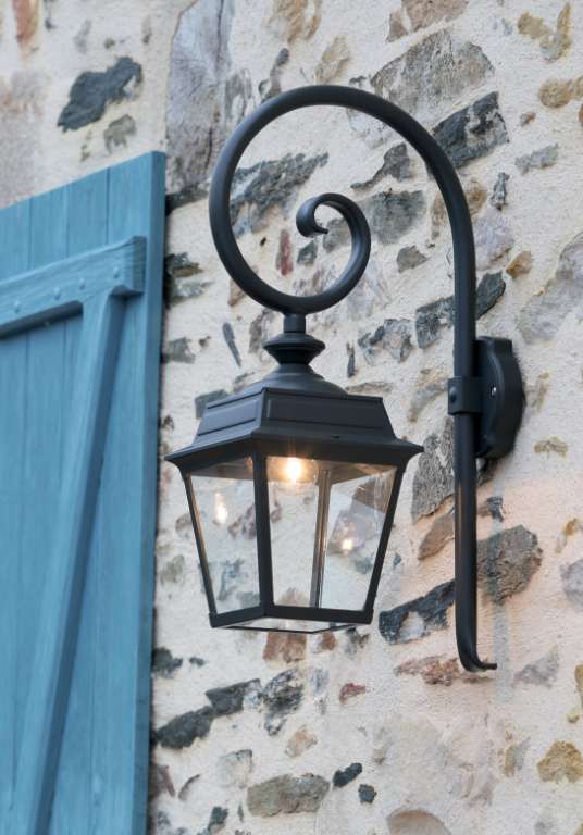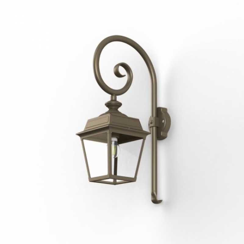 Klassisch- nostalgisch- Landhausdesign und dennoch modern, die hochwertige Wandleuchte für Draußen Modell Vogese zeigt sich hier mit abwärts gerichteter Laterne am dekorativem Bischofsstab als Wandarm. Der spiralenförmig geschwungene Wandarm hat seinen ganz besonderen eigenen Charme. Würdevoll trägt er die Leuchte mit nach unten und allseitig strahlendem Licht. Die vierseitige Laternenhaube ist allein 32,9 cm hoch und 21,4 cm breit. Die stilvolle Außenwandleuchte ist von ihren Maßen insgesamt 68,5 cm hoch, 21,4 cm breit und ist 37,1 cm tief. Die wetterfeste Wandleuchte wird hier in der Ausführung mit Aluminium oder wahlweise auch mit Messing angeboten. Die Variante Messing wird in Kombination mit schwarzem Wandarm gefertigt. In der Ausführung mit Aluminium stehen Ihnen bei der Wandleuchte für Draußen bis zu 8 verschiedene Farben/RAL-Farben in der Auswahl zur Verfügung. Wählen Sie bei der dekorativen Außenbeleuchtung zwischen tiefschwarz (RAL 9005), weiß, schiefergrau, tannengrün (RAL 6009), sandsteinfarben, alt-rustikal (rostbraun) Grünspan-Patina oder goldfarbener Patina. Der französische Hersteller gibt ab Werk auf das beschichtete Aluminium eine 25-jährige Anti-Korrosionsgarantie*. Die vier Glaseinsätze werden aus Echtglas gefertigt. Alternativ bietet der französische Hersteller Klarglas oder Mattglas (Milchglas) an. Wer es also absolut blendfrei benötigt, sollte sich für Mattglas entscheiden. Der Bischofsstab-Wandarm wird mithilfe der Wandmanschette (11,4 cm breit und 14 cm hoch) an der Fassade oder Hauswand befestigt. Die hochwertig verarbeitete Wandleuchte für Draußen Modell Vogese entspricht der Schutzart IP 44 sowie der Schutzklasse 1.