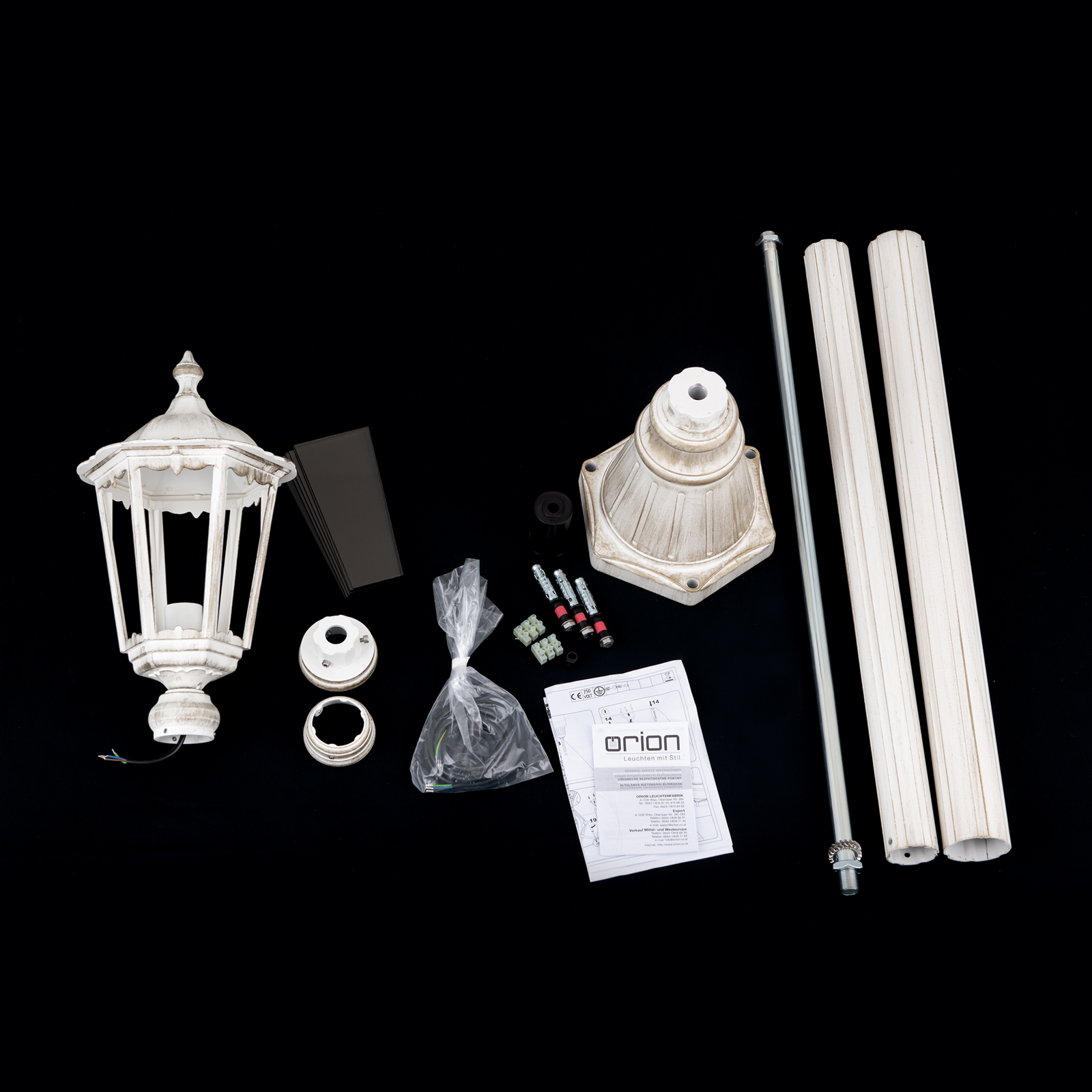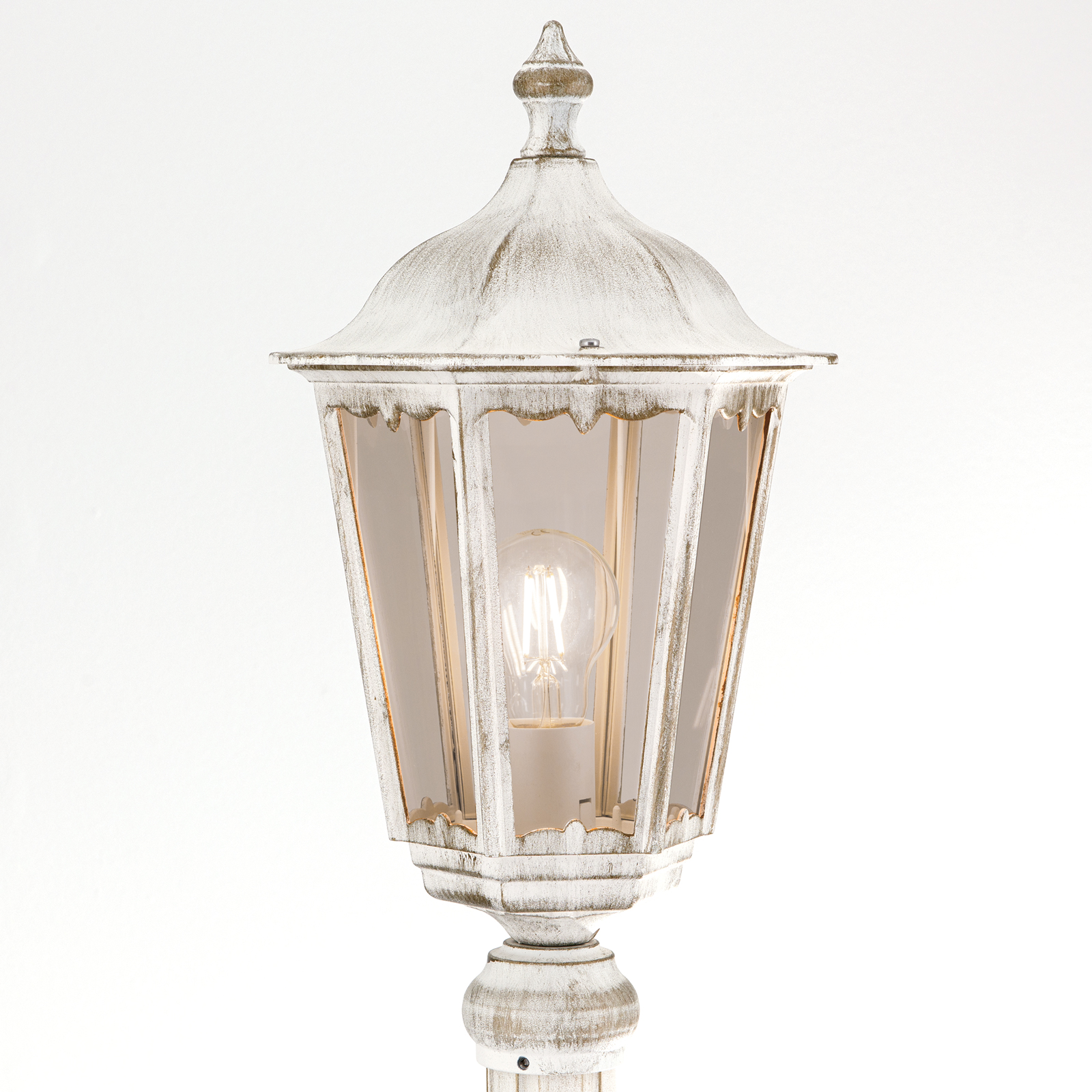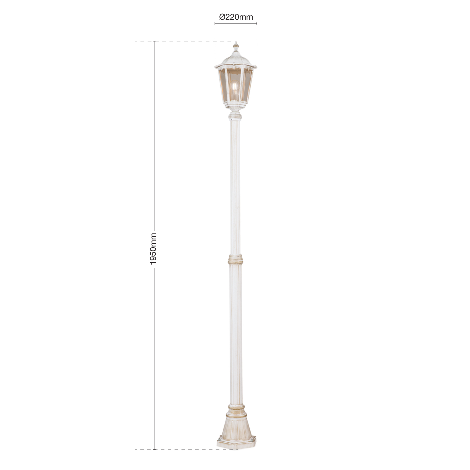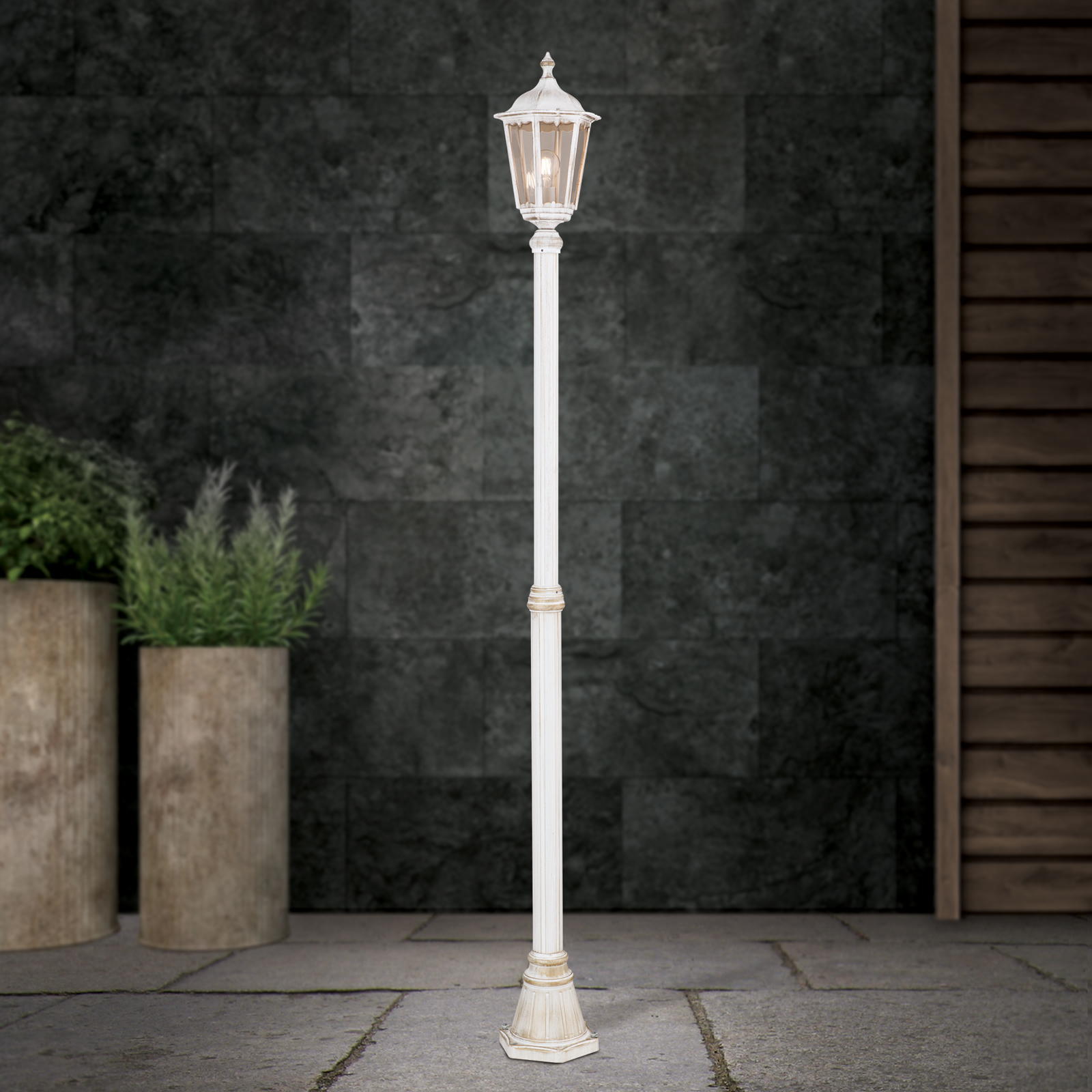Die dekorative weiße Wegeleuchte antik aus unserer Leuchtenserie Graz ist von ihren Maßen 2,11 Meter hoch. Der authentische Leuchtenkopf hat einen Durchmesser von 22 Zentimetern und ist mit sechs hochwertigen Rauchglas-Fenstereinsätzen bestückt. Die vom Design eher verspielt elegante Außenbeleuchtung erinnert einen an den italienischen Rokoko-Stil. Die verspielte Form passt sehr schön zu weiß verklinkerten Immobilien im klassischen auch mediterranen Baustil. Die hochwertige weiße Wegeleuchte antik besticht mit ihrem besonderen Antlitz, einem Farb-Melange aus Weiß und Gold. Die stilvolle Gartenbeleuchtung wird aus Siluminguss hergestellt, einer besonders widerstandsfähigen Aluminiumguss-Legierung aus Aluguss in Verbindung mit Silicium. Silicium wird z.B. auch im Flugzeugbau verwendet. Die klassisch-nostalgische Standleuchte gibt es in dieser Ausführung auch mit 2,49 Metern Gesamthöhe und einer etwas größeren Laterne, unsere klassische Wegeleuchte weiß.
