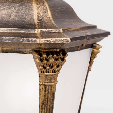 Die antike Aussenleuchte Wand Modell Bregenz ist von den Maßen 47 cm hoch, 23 cm breit und 29 cm tief. Setzen Sie mit der aufwärts ausgerichteten Wandlaterne Ihren Hauseingangsbereich oder auch Nebengelasse stilvoll in Szene. Die klassisch-nostalgische Optik entsteht bei der antiken Aussenleuchte Wand durch verschiedenen Verzierungen und die klassische Laternenform. Die Laterne ist hierbei auf einer dekorativen Montageplatte zur Wandbefestigung montiert. Die antik-messingfarbene Wandlaterne ist Teil unserer Außenleuchtenserie Bregenz. Charakteristisch ist für diese Leuchtenserie ihr Schmiede-Designs mit filigranen Zierelementen und kannelierter Montur. Die viereckige Laterne wird von einem ebenso verziertem geschwungenem Wandarm getragen. Eine einbrennlackierte, handgewischte Patinafarbe veredelt den Siluminguss, der besonders korrosionsbeständig ist und verleiht ihr ein antikes Aussehen. Die antik rustikale Wandlampe Bregenz sollte mit der Schutzart IP 23 eher an etwas geschützteren Orten angebracht werden, zum Beispiel als Beleuchtung im vorderen Hauseingangsbereich unter dem Dachkasten. Die antike Aussenleuchte Wand ist mit weiß satiniertem Echtglas versehen. Das satinierte Glas bewirkt dazu eine absolut blendfreie Außenbeleuchtung. Mit einer Höhe von knapp einem halben Meter eignet sie sich für den Einsatz repräsentativer Eingänge und Terrassen. Die Wandlaterne Bregenz hat eine E27-Fassung mit einer maximalen Leistung von 60 Watt. Je nach Bestimmungsort und Erforderlichkeit wählen Sie die für Sie passenden Leuchtmittel. Ob LED-Leuchtmittel oder auch Energiesparlampe, ob warmweißes Licht für eine stimmungsvolle Beleuchtung oder lieber eher kaltweißes Licht (höhere Kelvinzahl) für mehr Helligkeit, Sie bestimmen mit der Leuchtmittelwahl die Lichtwirkung Ihrer neuen Außenbeleuchtung. Leuchtmittel sind bei der Lieferung daher nicht enthalten.