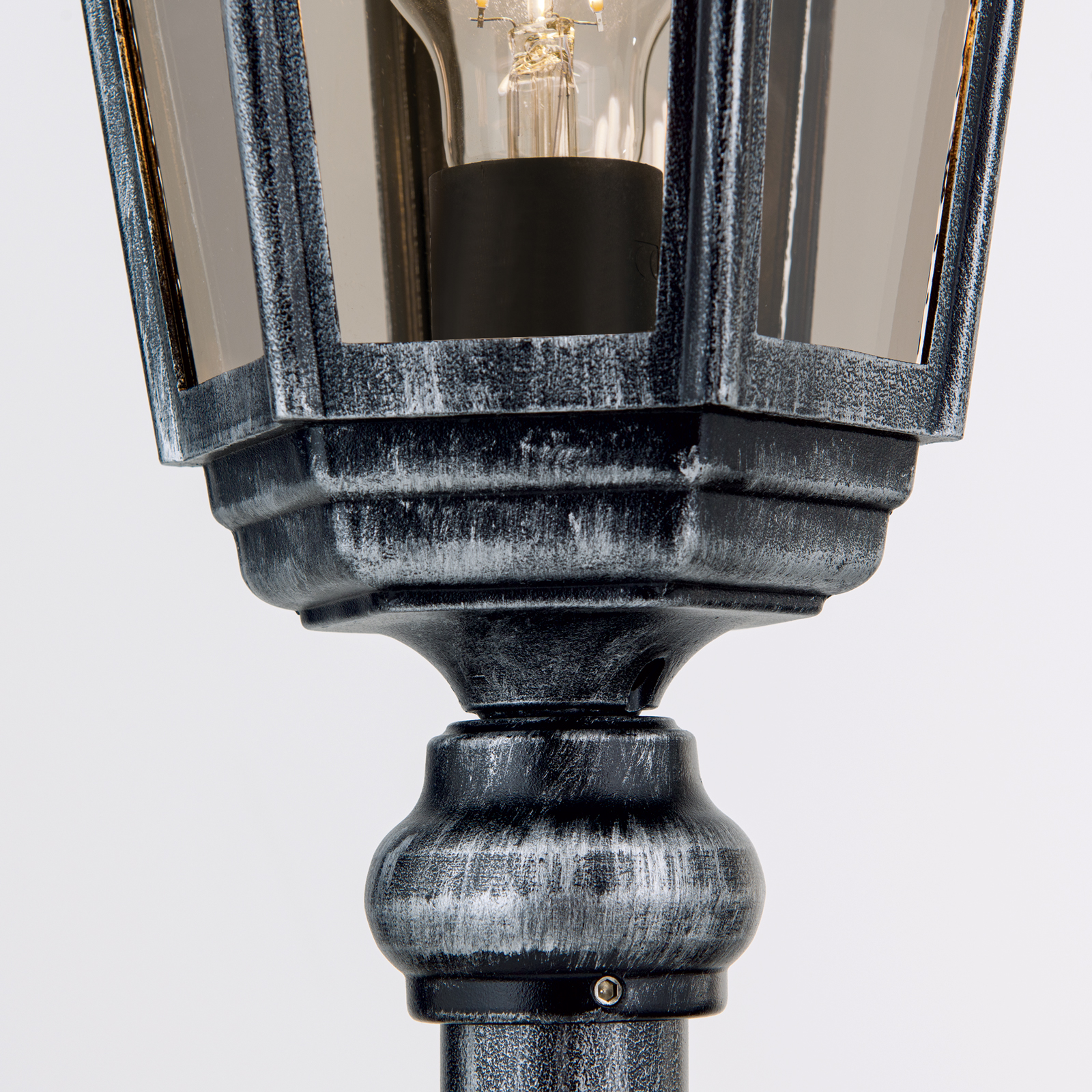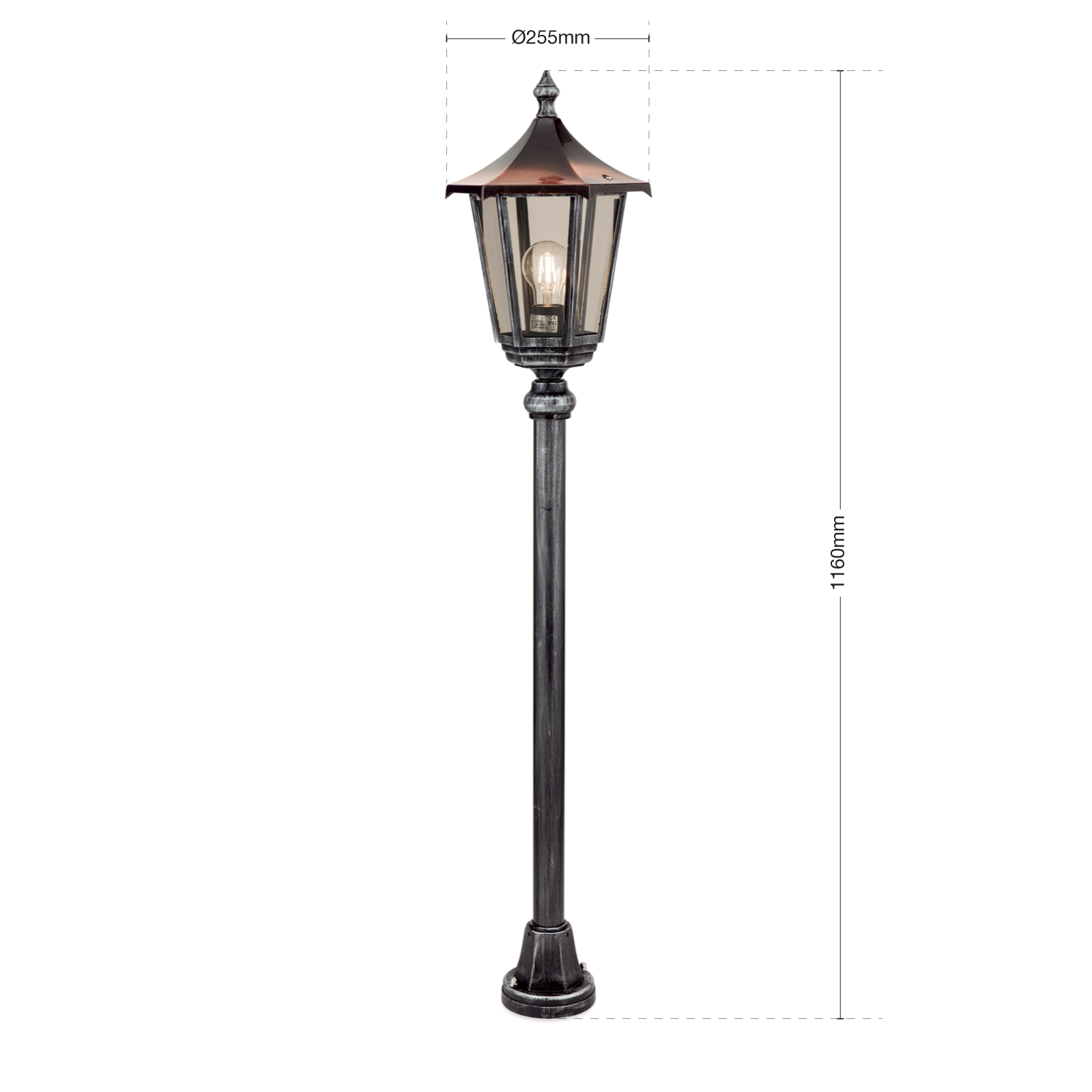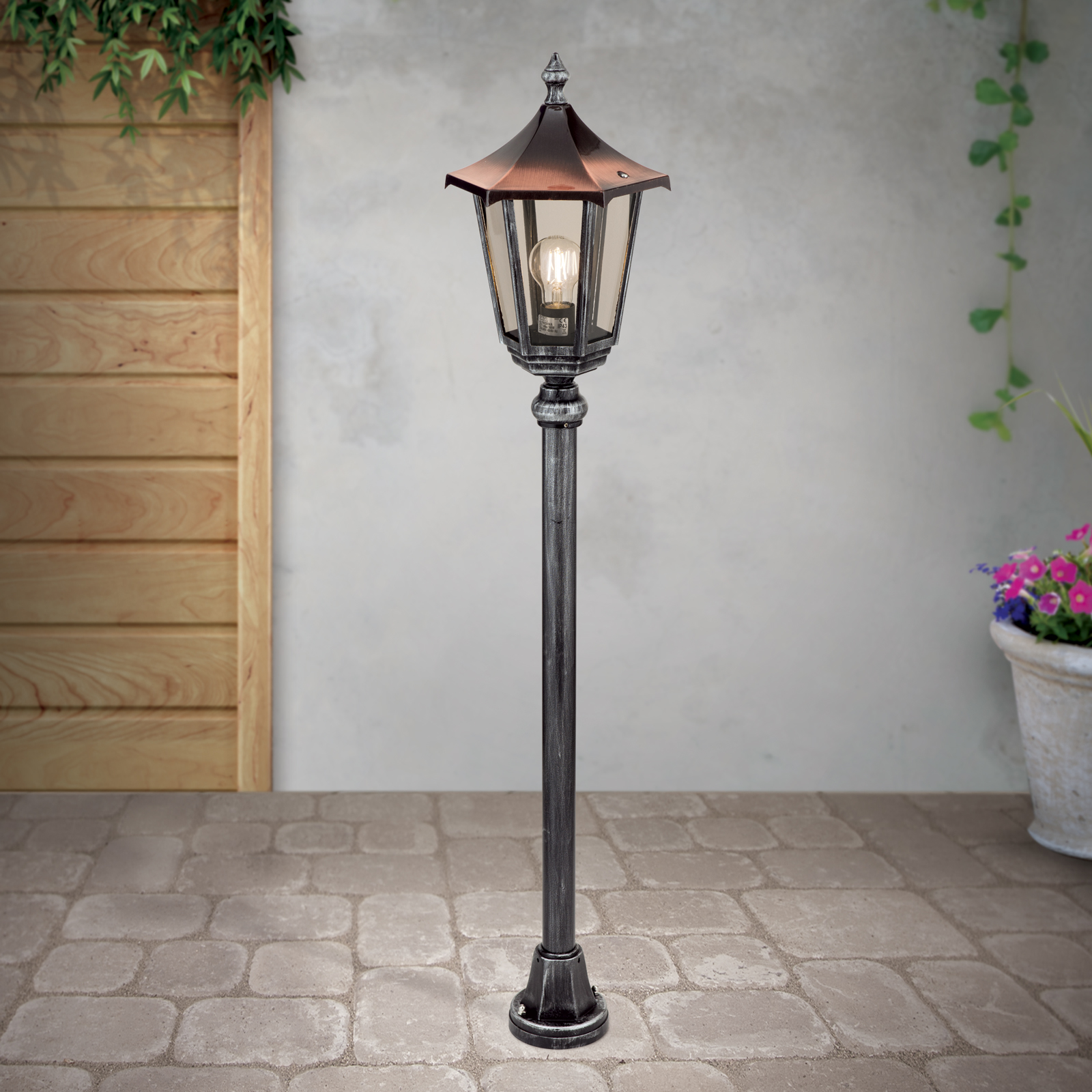 Die antike Aussenleuchte für Gastronomie gehört zu unserer im Design klassisch antiken Leuchtenserie Ischgl. Die hochwertige Gartenlaterne eignet sich besonders als dekorative Gastronomiebeleuchtung oder auch für andere Betriebe wie zum Beispiel kleinere Hotels, Pensionen oder auch Ferienhausvermietungen. Setzen Sie mit der Gartenlaterne Ischgl stilvoll tolle Lichtakzente. Das kupferfarbene Leuchtendach besticht dazu mit seiner extravaganten Form. Die schwarz-silber-kupferfarbene Außenleuchte eignet sich als dekorative Wegeleuchte, als Terrassenbeleuchtung oder auch als kreative Beetbeleuchtung. Die antike Aussenleuchte für Gastronomie ist insgesamt 116 Zentimeter hoch. Die sechseckige Laternenhaube zeigt eine Breite von 25,5 Zentimetern. Die Fenstereinsätze der Laterne werden aus hochwertigem Rauchglas gefertigt. Rauchglas erfreute sich schon bereits in den sechziger Jahren in der Beleuchtung großer Beliebtheit und ist auch heute wieder en vogue. Die stilvolle Außenbeleuchtung kommt vom österreichischen Hersteller Orion-Leuchten und wird aus Siluminguss hergestellt, einer besonders widerstandsfähigen Aluminiumgusslegierung aus Aluguss in Verbindung mit Silicium. Silicium wird z.B. auch im KfZ- und Flugzeugbau als Material verwendet.