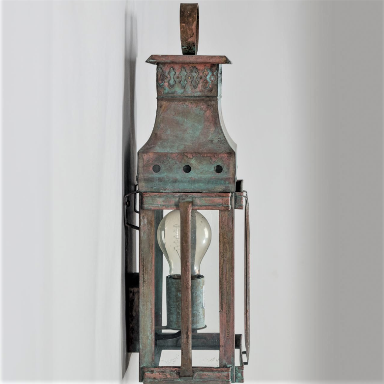 Die antike Wandleuchte 40cm aus der Modellserie "Ramatuelle" wurde im französischen Atelier Lumart nahe Paris entworfen, inspiriert nach Vorbildern aus dem französischen 19. Jahrhundert. Die Aussenwandleuchte mit französischem Anmut wird aus Messing gefertigt und vermittelt mit ihrer Surface im Vert de gris-Finish (Grünspan-Optik) detailvoll ein nostalgisch-antikes Ambiente mit einem Hauch Romantik. Die antike Wandleuchte 40cm der Kollektion Ramatuelle ist von den Maßen 40 cm hoch, 21 cm breit und schmale 13 cm tief.