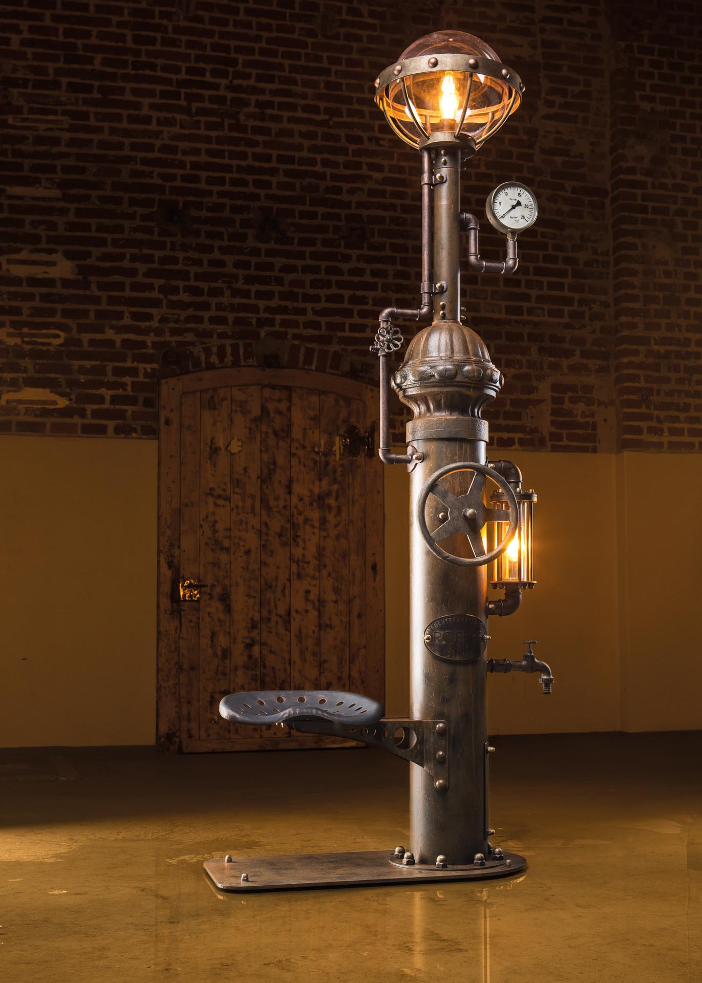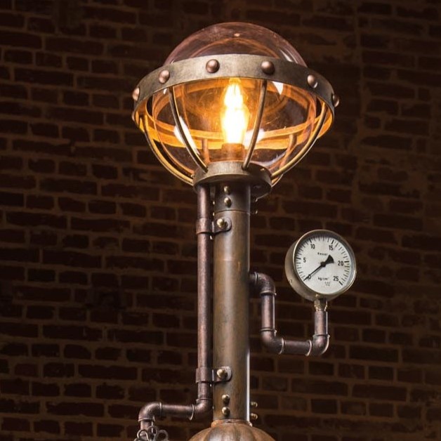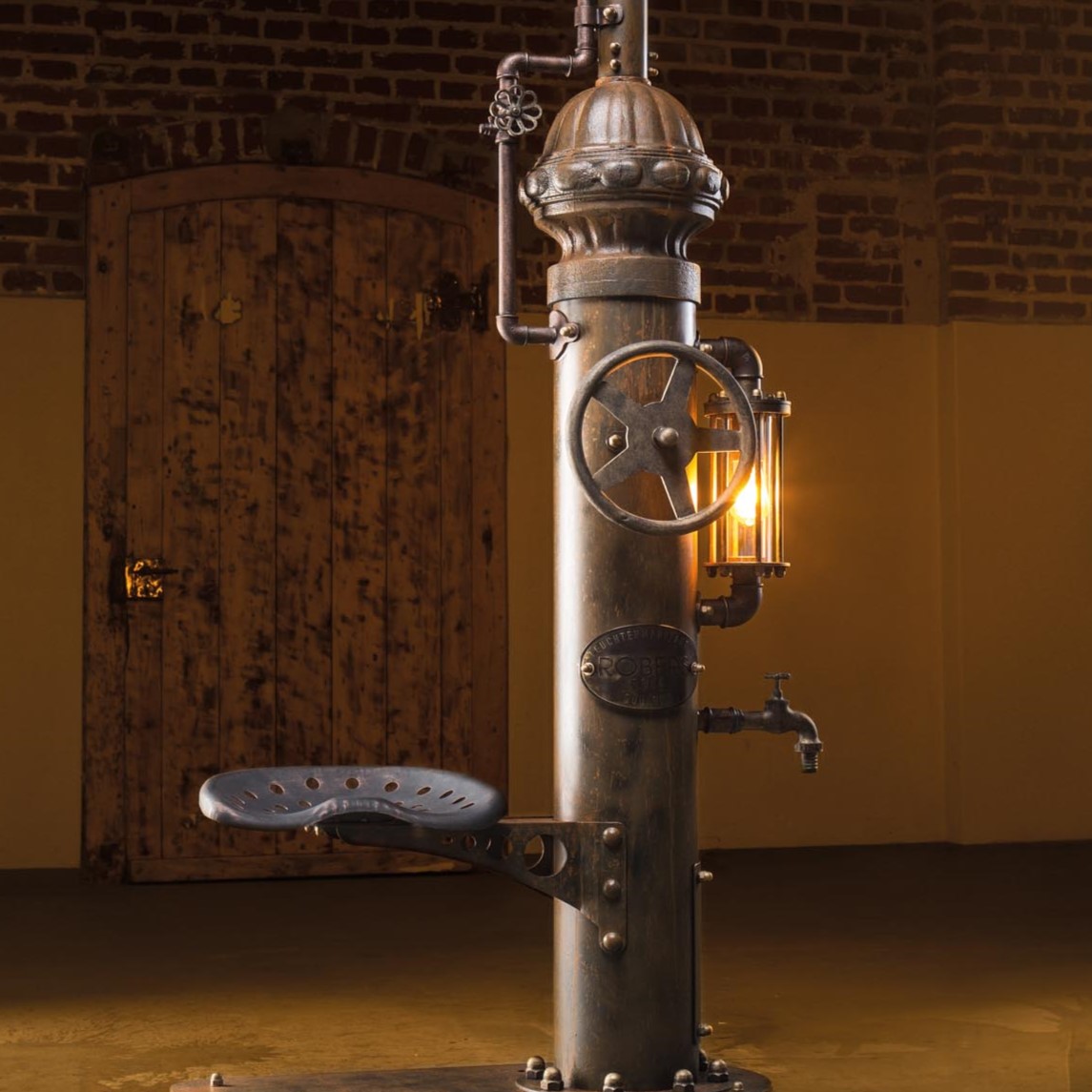 Diverse Muttern in verschiedenen Größen und die massive Bauweise unterstreichen den robusten Charakter und die hochwertige Verarbeitung dieses Kunstwerks. Die ausgefallene Außenbeleuchtung geht weit über das reine Licht hinaus. Sie integriert einen funktionalen Sitzplatz, der zum Verweilen einlädt. Rohrleitungen mit Manometern, ein großes, funktionales Drehrad, diverse Beipässe und ein dekoratives Absperrventil verleihen der Leuchte eine markante industrielle Note. Das elliptische Schild mit der Aufschrift „Robers“ bestätigt die Herkunft der außergewöhnliche Restaurant Außenbeleuchtung Modell Nautica. Die kunstvoll geschmiedeten Eisenelemente der „Nautica“ bestehen für eine lange Haltbarkeit aus verzinktem Stahl und sind auf einer stabilen Stahlbodenplatte montiert, was für hohe Standfestigkeit sorgt und gleichzeitig der Beleuchtung eine markante Präsenz verleiht. Dieses Meisterwerk aus Schmiedeeisen, Stahl und Echtglas ist nicht nur ein funktionales Beleuchtungselement, sondern auch ein faszinierendes Designobjekt, das in jedem Außenbereich zum echten Blickfang wird. Neben dem Finish (Oberfläche) Steampunk erhalten Sie die Außenleuchte auch in weiteren Finishes wie Alt-Kupfer, Alt-Bronze, Taverna, schwarz, schwarz-silber, Patina, Terra, grün-antik und Eisen Natur. Die Farbauswahl finden Sie für diesen Hersteller auch unter dem vorstehenden Link.