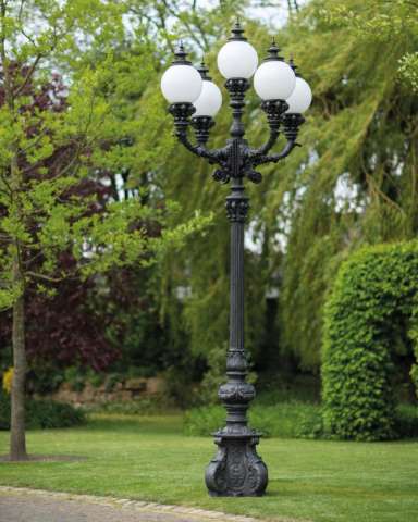 Der außergewöhnliche Kandelaber aus unserer Modellserie Jardin ist ein wahres Meisterwerk für die anspruchsvolle Gartengestaltung und urbane Beleuchtung. Mit einer imposanten Höhe von 4,60 Metern und fünf kunstvoll verzierten Leuchtenarmen setzt dieser exklusive Kandelaber markante Akzente in weitläufigen Außenbereichen. Ob auf repräsentativen Plätzen, in luxuriösen Gartenanlagen oder entlang eleganter Alleen – diese nostalgische 5-flammige Außenlaterne verbindet eindrucksvolle Ästhetik mit erstklassiger Funktionalität.