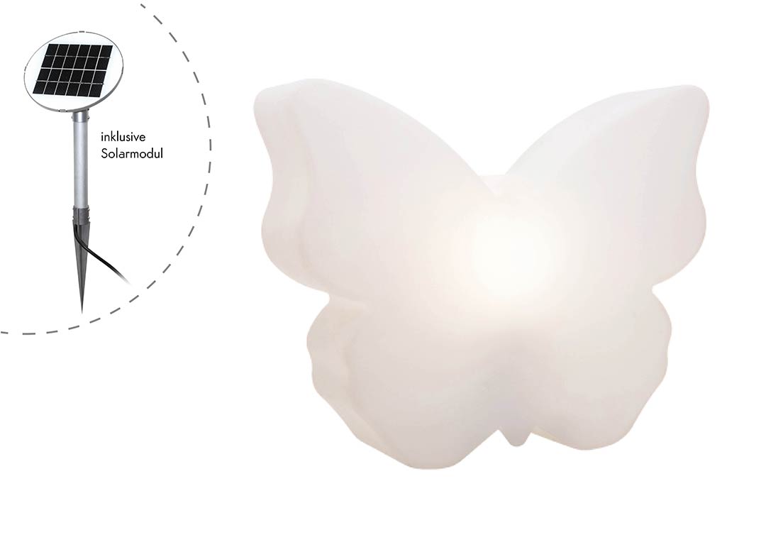Ob zum Anlaß eines Events, kleinerer und größerer Feiern oder einfach als den Abend begleitendes stimmungsvolles Lichtambiente, die dekorative Aussenleuchte mit Solar im Design eines Schmetterlings erweckt Ihre Außenanlagen mit aufkommender Dunkelheit mit Fröhlichkeit zum Leben. Bringen Sie mit den beleuchteten Solar-Motivleuchten im modernen Design das Gefühl einer gewissen Leichtigkeit in Ihren Garten und auf Ihre Party. Wir bieten die beleuchteten Design-Schmetterlingen hier im Zweier-Set an. Einzeln oder als kleines Ensemble platziert-lassen Sie Ihrer Kreativität freien Lauf. Die wetterfeste Gartenleuchte hat einen Durchmesser von 40 cm und misst eine Höhe von 32 cm und Tiefe von 10 cm. Die dekorativen Aussenleuchten mit Solar werden aus hochwertigem Polyethylen gefertigt und sind daher auch im Außenbereich robust gegen Sonne, Schnee und Frost gut platzierbar. Die weißen Aussenleuchten entsprechen der Schutzart IP 44 und sind damit allseitig spritzwassergeschützt. Mit den kreativen Outdoor-Motivleuchten setzen Sie warmweiße Lichtakzente in Ihren Beeten, auf der Terrasse, im vorderen Eingangsbereich oder auch an Wegesrändern.