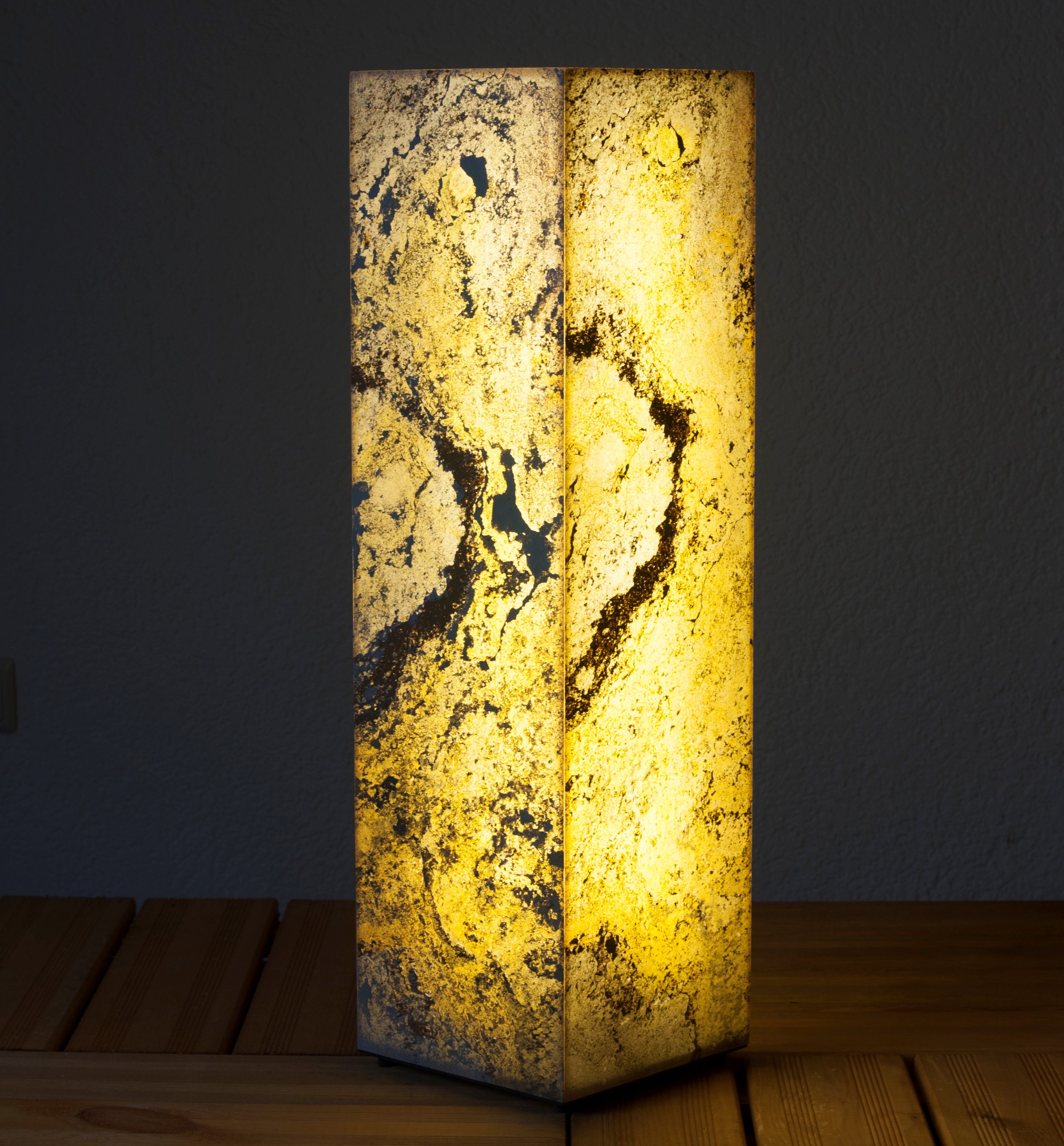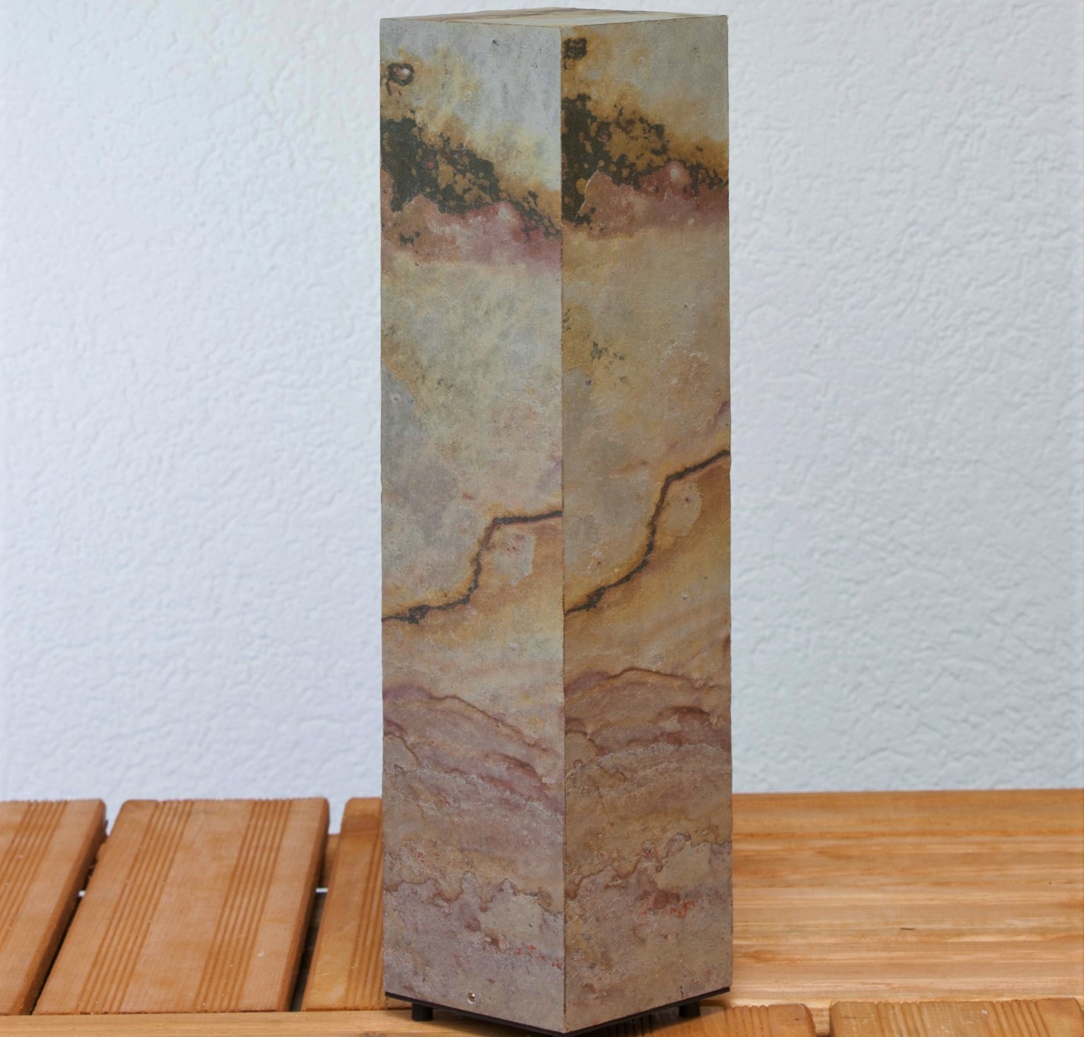 Die quaderförmige exklusive LED-Aussenleuchte Canyon ist 70 cm hoch. Die ortsfeste, freistrahlende Säulenleuchte aus Naturschiefer sorgt mit ihrer umlaufenden, strukturierten Lichtstärkenverteilung für ein besonderes Lichterlebnis. Die außergwöhnliche Außenbeleuchtung Modell Canyon spendet mit einem Lichtaustritt von 360° ein blendfreies und ungerichtetes Licht als Beleuchtung von Flächen und Wegen im öffentlichen als auch im privaten Bereich. Der Säulenboden ist von den Maßen 20 cm tief und 20 cm breit. Der Hersteller verwendet bei der Herstellung ausschließlich hochwertige Materialien sowie für die Montage der exklusiven LED-Aussenleuchte aus Gründen der Witterungsbeständigkeit witterungsresistente Edelstahlschrauben. Die dekorative Gartenleuchte besteht aus echtem, 1μ bis 1mm dicken Naturschiefer. Die in Handarbeit gefertigte Schieferleuchte wird in der Herstellung versiegelt und mit Gießharz und Glasfaser verstärkt. Die authentische Schieferleuchte entspricht der Schutzart IP 45 und ist seewasserbeständig als auch beständig gegen chlorhaltiges Schwimmbadwasser. Auf Wunsch ist die exklusive LED-Aussenleuchte auch mit einer Durchgangsverdrahtung lieferbar. Die in der hochwertigen Gartenleuchte langlebigen LEDs sind aus Gründen der Nachhaltigkeit später austauschbar. Sie wählen bei der Säulenleuchte zwischen drei verschiedenen LED-Ausführungen: