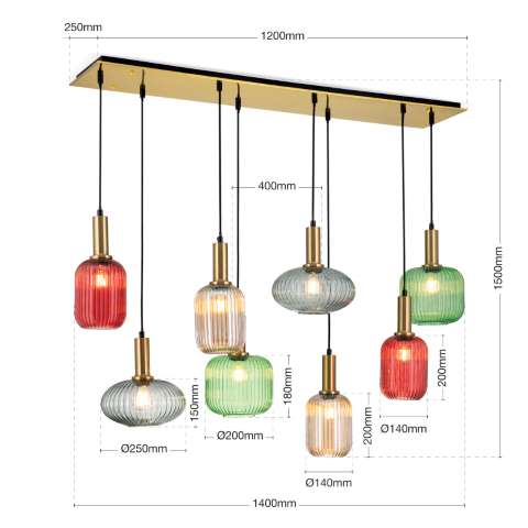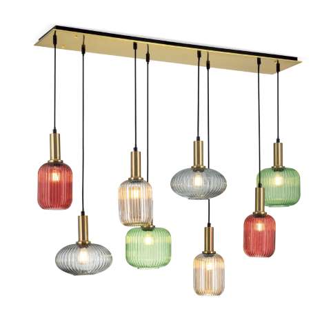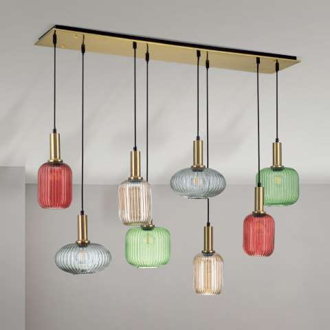 Bringen Sie mit der farbigen Hängeleuchte CARNEVAL Farbe und modernes Design in Ihr Zuhause! Diese außergewöhnliche 8-flammige Pendelleuchte vereint kreative Formen, hochwertige Materialien und ein einzigartiges Lichtspiel. Die kunstvoll gestalteten Glaslampenschirme in verschiedenen Farben und Formen setzen stilvolle Akzente und sorgen für eine lebendige, warme Atmosphäre in Ihren Räumlichkeiten.