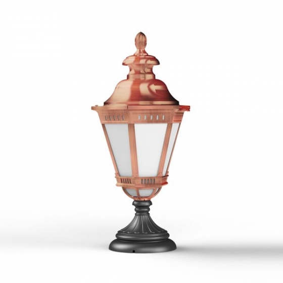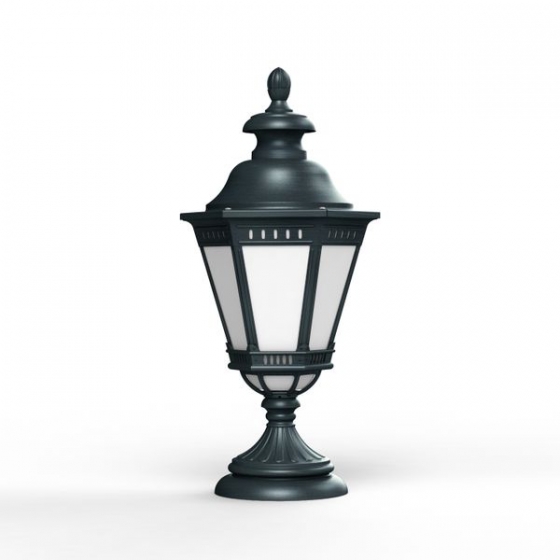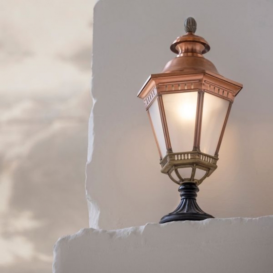 Die große Sockellaterne Citadelle überzeugt mit ihrem klassischen, voluminösen Design und einer hochwertigen Verarbeitung. Die sechsseitige Laterne steht auf einem kunstvoll verzierten, runden Sockelfuß und sorgt mit ihren Opalglas-Fenstereinsätzen für eine blendfreie und stilvolle Gartenbeleuchtung. Die außergewöhnliche Sockelleuchte wird aus langlebigem Aluminium gefertigt und ist dank der Schutzart IP66 absolut wetterfest. Sie ist in drei Farbvarianten erhältlich: Tiefschwarz (RAL 9005), Grün-Patina oder Gold-Patina. Alternativ ist die absolut wetterfeste mit einer patinierten Kupferoberfläche (unlackiert) verfügbar, die durch eine spezielle Beschichtung auf schwarz lackiertem Aluminium entsteht und einen edlen Kupfer-Finish-Effekt erzeugt.