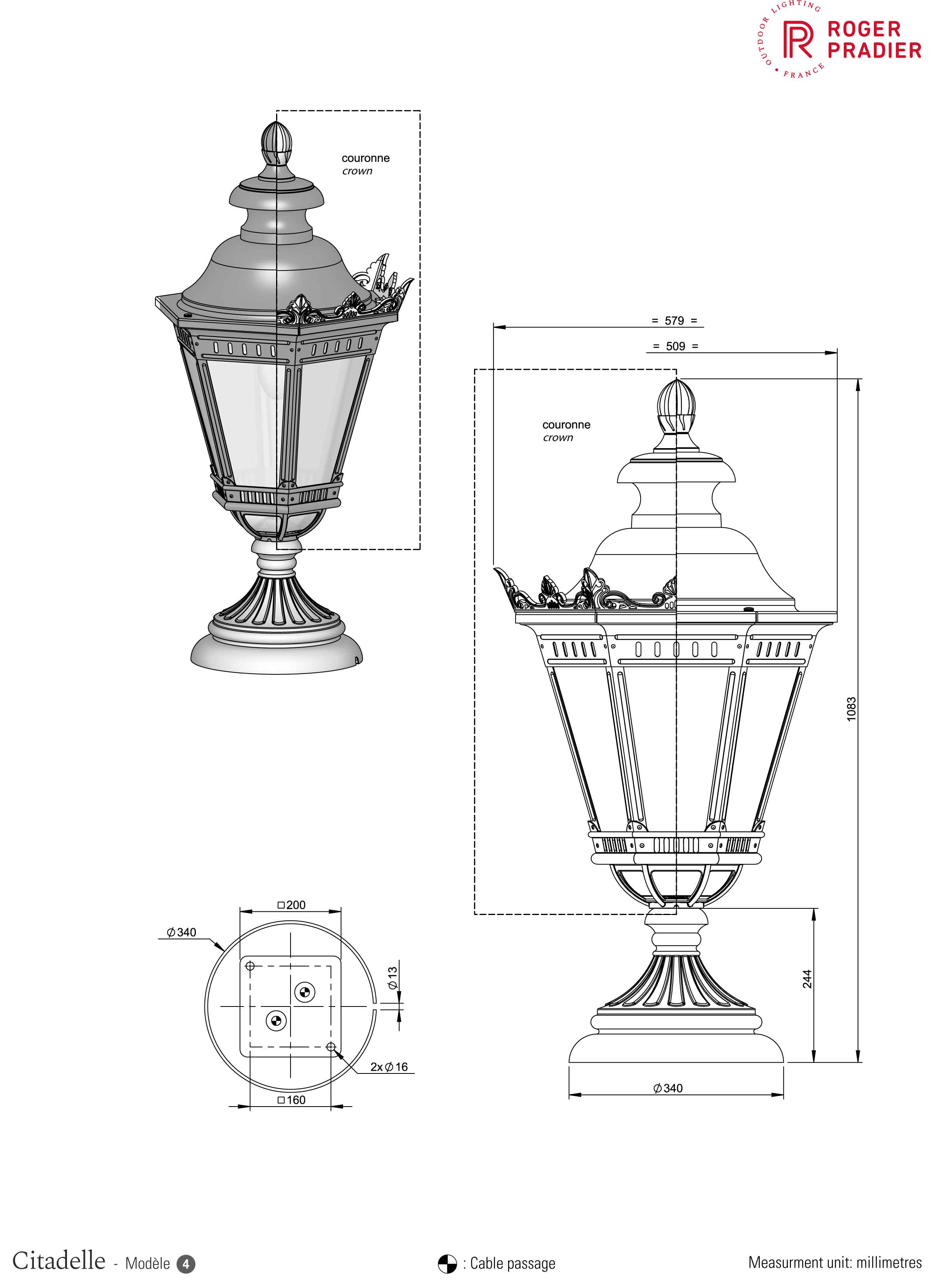 Der renommierte französische Hersteller Roger Pradier gewährt auf die große Sockellaterne Citadelle eine 25-jährige Anti-Korrosionsgarantie auf das beschichtete Aluminium (schwarz) sowie eine 3-jährige Garantie auf Patina-Farben. Alle Leuchten werden mit einer zusätzlichen 3-jährigen technischen Garantie ausgeliefert. Die exklusive Metallkuppel auf dem Leuchtendach, diverse filigrane Verzierungen sowie der zur eckigen Laterne im Kontrast stehend rundförmige Sockelfuß geben dieser Leuchte ihre ganz besondere Note. Auf Wunsch kann die große Außenleuchte mit Sockelfuß zusätzlich mit einer kronenartigen Verzierung für eine noch klassischere Optik bestellt werden.