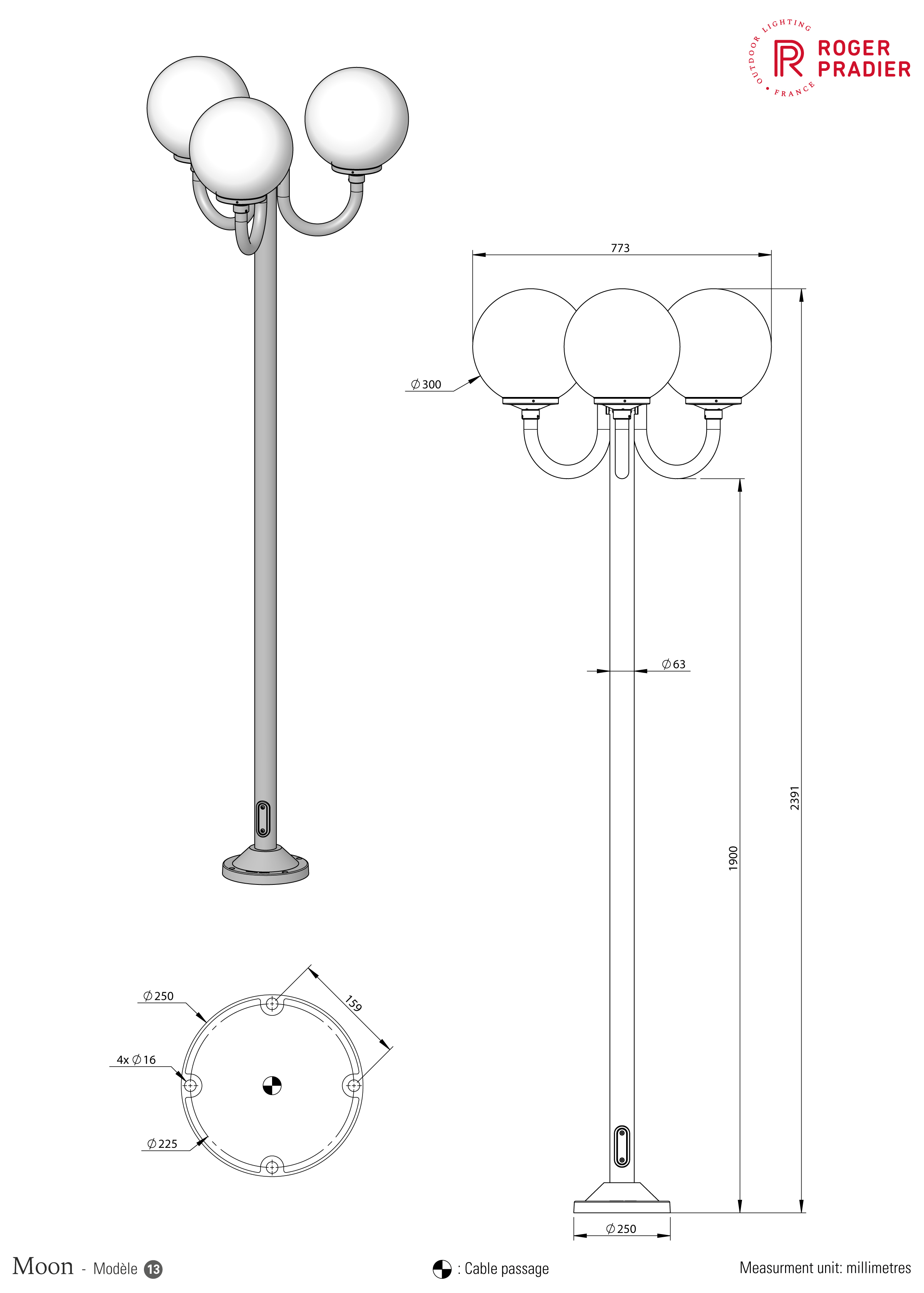 Alle Leuchten des Herstellers Roger Pradier verlassen die Manufaktur mit einer zusätzlichen technischen Garantie von 3 Jahren. Der französische Hersteller gibt ab Werk auf das beschichtete Aluminium eine 25-jährige Anti-Korrosionsgarantie*. Weitere Leuchtenarten wie eine Wand-Kugelleuchte aufwärts oder abwärts gerichtet, weitere Sockelleuchten und verschiedene Mastleuchten- auch 2-flammig oder 4-flammig, runden das Leuchtensortiment der Leuchtenserie Moon ab. Befestigungsmaterial für die Montage ist bei der Lieferung inklusive. Wer die Kugelhauben lieber in Rauchglas-Optik bevorzugt findet die gleiche Gartenleuchte in vierflammiger Ausführung mit etwas kleineren Kugeln (Ø 20 cm) entsprechend unter dem folgenden Link Designer Aussenleuchte 4-flammig.