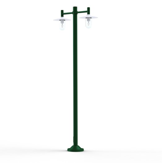 Die grüne Aussenleuchte zweiflammig Modell Montana überzeugt mit ihren zwei modernen Schirmleuchten sowohl optisch als auch funktional. Bei dieser zweiflammigen Gartenbeleuchtung werden Mast und die Verteiler in der Farbe tannengrün (RAL 6009) lackiert. Die beiden Leuchtenschirme werden alternativ in Aluminium weiß lackiert oder in Kupfer natur lackiert angeboten. Sie erhalten die Mastleuchte Montana zum Beispiel auch mit einem Kupferdach und grauschwarzem Wandarm als Kontrast. Die im Design moderne 2-flammige Gartenleuchte stammt aus einer französischen Leuchtenmanufaktur und ist hochwertig verarbeitet. Die stilvolle Designer Aussenleuchte zweiflammig wird aus Aluminium und Stahl gefertigt. Der Leuchtenmast besteht aus Stahl. Der französische Hersteller gibt ab Werk auf das beschichtete Aluminium eine 25-jährige Anti-Korrosionsgarantie*. Alle Leuchten des Herstellers Roger Pradier verlassen die Manufaktur mit einer zusätzlichen technischen Garantie von 5 Jahren.
