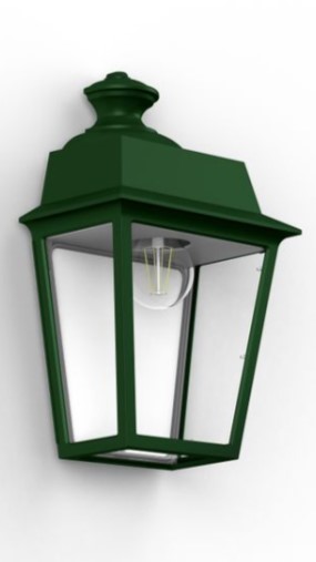 Die wetterfeste grüne Außenwandlampe aus unserer Leuchtenserie Vogese 1 ist von ihren Maßen 34 cm hoch, 21,6 cm breit und ganze 13,2 cm tief. Die dreiseitige grüne Wandlaterne wird direkt rückseitig an der Hausfassade angebracht. Die Wandmanschette zur Befestigung an der Hauswand ist 21,6 cm breit und eine 34 cm hoch. Mithilfe der sogenannten Boomerang-Wandbefestigung lässt sich die dekorative Außenwandleuchte recht schnell und einfach montieren. Die stilvolle Designerleuchte wird aus Aluminium gefertigt. Bei der im Design klassischen grünen Wandleuchte für Außen stehen Ihnen die Farben tannengrün (RAL 6009) und patinagrün zur Verfügung. Sie erhalten die Leuchte auch in der Farbe dunkelgrün (RAL 6009). Vermerken Sie dies einfach am Ende der Bestellung unter Anmerkungen. Die drei Fenstereinsätze werden aus klarem oder alternativ opalfarbenen PMMA angeboten. PMMA ist ein Kunststoff, der sich insbesondere durch seine Brillianz und Kratzfestigkeit auszeichnet. Wer es also absolut blendfrei benötigt, sollte sich für die Variante PMMA opalfarben entscheiden. Der französische Hersteller Roger Pradier gibt ab Werk auf das beschichtete Aluminium eine 25-jährige Anti-Korrosionsgarantie*. Die hochwertig verarbeitete grüne Außenwandlampe entspricht der Schutzart IP 65 sowie der Schutzklasse 1.