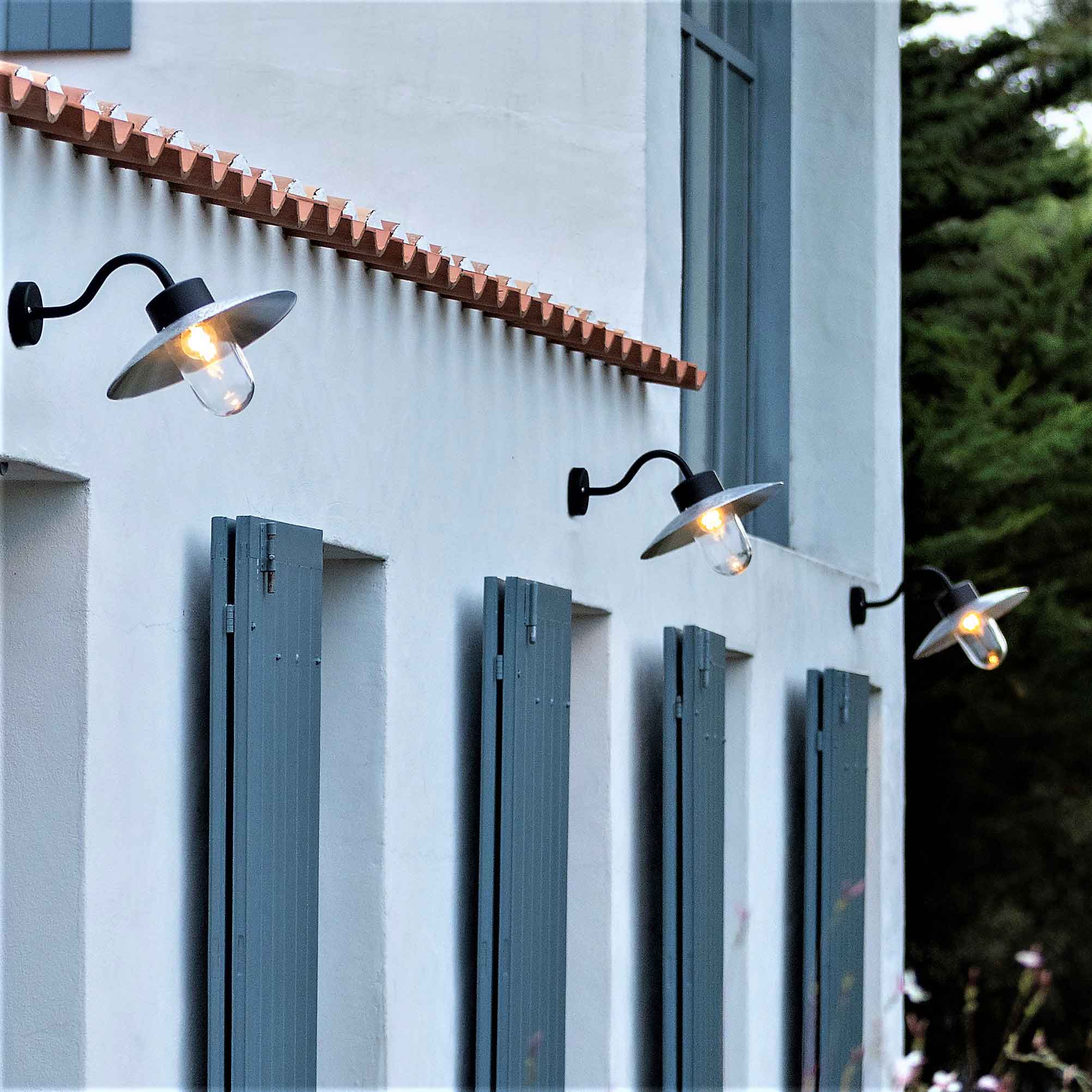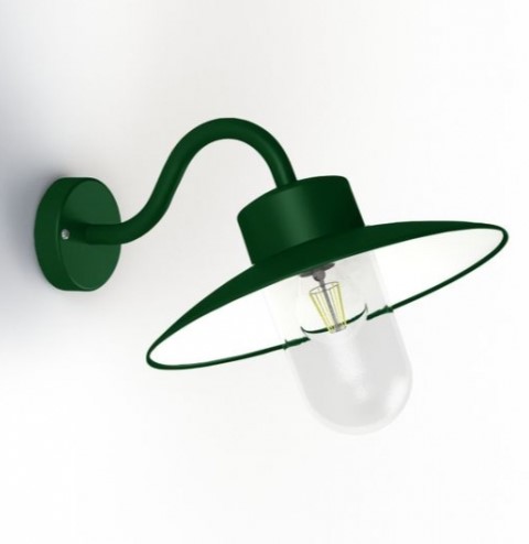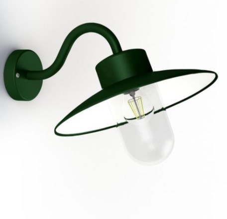 Die grüne Hofleuchte klassisch gehört zu unserer französischen Leuchtenserie Belcour. Die Wandleuchte ist von ihren Maßen 26,7 cm hoch, 32 cm breit und 41,9 cm tief. Der Neigungswinkel beträgt bei der stilvollen Hoflampe 67 Grad. Mit ihrem klassisch-nostalgischen Design überzeugt die wetterfeste Außenwandleuchte optisch als auch funktional. Die geblasene Glasabdeckung wird aus Klarglas gefertigt, ist auf Anfrage aber auch mit mattiertem Glas erhältlich. Die dekorative Wandleuchte Belcour lässt sich sehr schön als Außenbeleuchtung für Landhäuser, Architektenhäuser, als grüne Hofleuchte klassisch für Gehöfte oder auch als stilvolle Hoflampe in der Gastronomie und dem Gewerbe einsetzen. Die hochwertige Schirmleuchte ist in verschiedenen Materialausführungen erhältlich. Wer es farbig mag, hat bei der grünen Hofleuchte klassisch viel Spielraum für eine kreative Farbgestaltung seiner Außenanlagen. In der farbigen Ausführung (mit Aluminium als Material) ist die Schirm-Innenseite für eine gute Reflexion des Lichts in weiß gehalten. Die grüne Hoflampe ist hier in den verschiedenen Grüntönen dunkelgrün, tannengrün (RAL 6009) oder gelbgrün (RAL 6018) erhältlich. Außerdem gibt es die klassisch bis moderne Designerleuchte auch in den Farben schwarz (RAL 9005), schiefergrau, metallgrau, weiß, ampelrot (RAL 3020), azurblau matt (RAL 5009), sandsteinfarben oder alt-rustikal (braun-schwarz). Auf die farbigen Ausführungen mit Aluminium als Material gibt der Hersteller eine 25-jährige Korrosionsschutz-Garantie. Die dekorative Außenleuchte ist zusätzlich aber auch mit gebürstetem und lackiertem Kupfer oder auch gebürstetem Zink erhältlich. Die Halterung und der Wandarm sind in der Farbe samtschwarz gehalten. Die Wandmanschette hat einen Durchmesser von 10 Zentimetern. Die Wandleuchte für den Außenbereich entspricht der Schutzart IP 44 und ist damit allseitig gegen Spritzwasser aus allen Richtungen geschützt. Die E 27-Lampenfassung wird bei der wetterfesten Außenwandleuchte mit Leuchtmitteln bis 60 Watt Leistung bestückt. Wir empfehlen für eine besondere Optik moderne Retro-Leuchtmittel mit rundem Glaskörper. Aus okönomischen und ökologischen Gründen sind LED-Leuchtmittel oder auch Energiesparlampen empfehlenswert. Befestigungsmaterial ist bei der Lieferung enthalten. Leuchtmittel sind bei der Lieferung nicht enthalten. Wir empfehlen Ihnen im ähnlichen Design auch die Hoflampe Cheverny, die es ebenfalls mit verschiedenen Oberflächen gibt. Klicken Sie für weitere Details dazu einfach auf den vorstehenden Link.