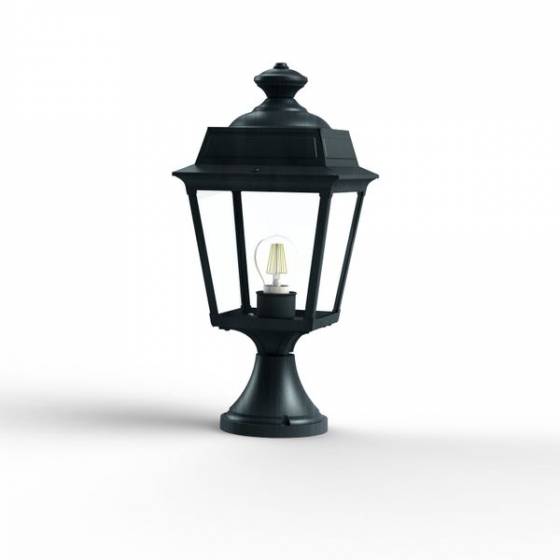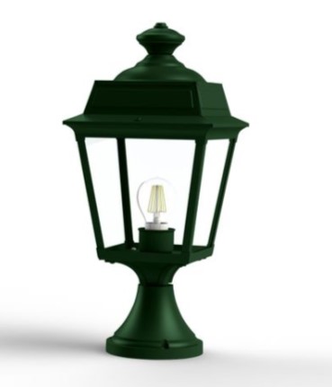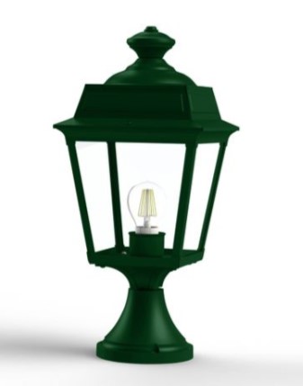 Unsere grüne Sockelleuchte klassisch ist die kleinere Sockellampe unserer Leuchtenserie Vogese. Die wetterfeste Gartenbeleuchtung ist hochwertig verarbeitet und von ihren Maßen 47,3 cm hoch und 21,4 cm breit. Die vierseitige Laternenhaube ist allein 32,9 cm hoch und 21,4 cm breit. Der Boden des rundförmigen Sockelbodens ist im Durchmesser 14 cm tief. Die grüne Sockelleuchte klassisch wird hier in der Ausführung mit Aluminium angeboten. Bei der im Design klassischen Designerleuchte stehen Ihnen 3 verschiedene Grüntöne zur Verfügung. Wählen Sie bei der dekorativen Außenleuchte zwischen tannengrün (RAL 6009), dunkelgrün (RAL 6009) oder patinagrün. Der französische Hersteller gibt ab Werk auf das beschichtete Aluminium eine 25-jährige Anti-Korrosionsgarantie*. Die vier Glaseinsätze werden aus Echtglas gefertigt. Alternativ bietet der französische Hersteller Klarglas oder Mattglas (Milchglas) an. Wer es also absolut blendfrei benötigt, sollte sich eher für Mattglas entscheiden. Die grüne Sockelleuchte klassisch entspricht der Schutzart IP 44 sowie der Schutzklasse 1. Setzen Sie mit der dekorativen grünen Sockelleuchte klassisch Ihren Eingangsbereich, Terrassenbereich, Mauerabsätze, Zaunpfosten oder Treppenabsätze stilvoll in Szene. Natürlich eignet sich die Gartenleuchte Vogese auch sehr gut als Gastronomie-Außenbeleuchtung. Begeistern Sie Ihre Gäste mit einer ansprechenden Beleuchtung. Die grüne Gartenbeleuchtung Modell Voges wird mit einer E 27-Lampenfassung gefertigt. Sie bestücken die grüne Außenleuchte mit Leuchtmitteln bis zu 75 Watt Leistung. Leuchtmittel sind bei der Lieferung nicht enthalten. Wir empfehlen aus optischen Gründen auch die Bestückung mit sogenannten Retro-Leuchtmitteln. Die Lichtfarbe Warmweiß (z.B. 2700 Kelvin) sorgt für eine eher stimmungsvolle Lichtatmosphäre, während kaltweißes Licht generell mehr Helligkeit erzeugt. Setzen Sie mit der grünen Außenleuchte Vogese in Ihrem Außenbereich tolle Lichtakzente. Alle Leuchten des Herstellers Roger Pradier verlassen die Manufaktur mit einer zusätzlichen technischen Garantie von 3 Jahren. Weitere Leuchtenarten wie eine Outdoor-Hängeleuchte, Wandlaternen und Wegeleuchten sowie auch eine zweiflammige Mastlaterne runden das Leuchtensortiment der Modellserie Vogese ab. Befestigungsmaterial für die Montage ist bei der Lieferung inklusive. Wir empfehlen Ihnen als Ergänzung dazu auch die grüne Außenlampe klassisch, eine klassische Außenwandleuchte zur direkten Befestigung an Ihrer Hausfassade.