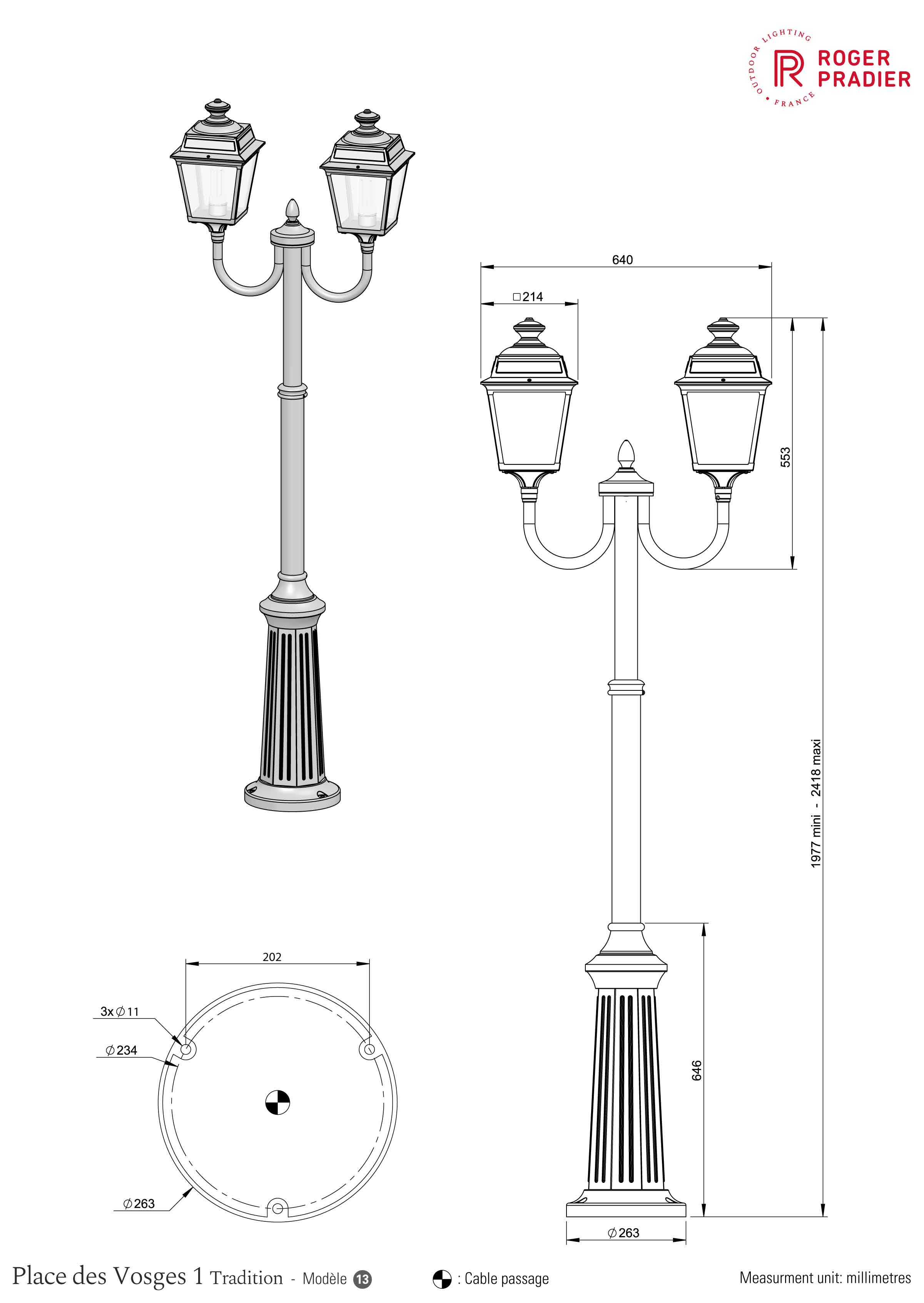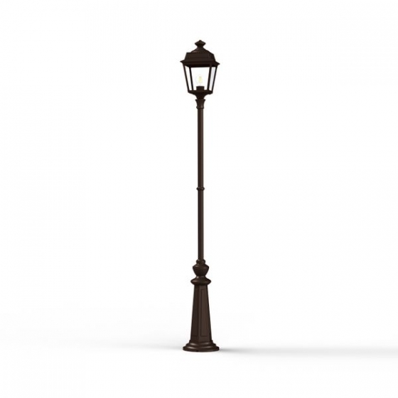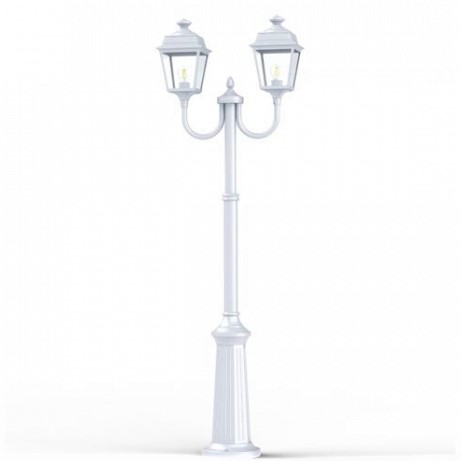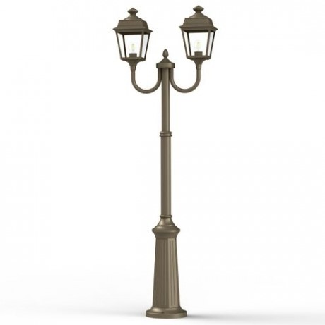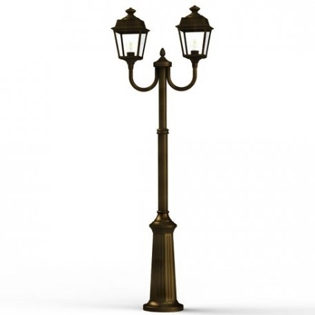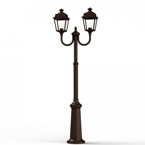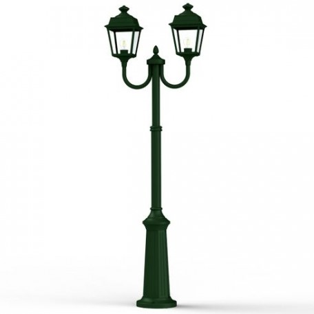 Die im Design klassische Aussenleuchte 2-flammig gehört zu unserer Leuchtenserie Vogese. Die zweiflammige Mastleuchte überzeugt dabei nicht nur im Design, sondern lässt sich mit ihrem teleskopischen Mast vor Ort in der Höhe perfekt einstellen. Dank eines Inbusschlüssels ist die teleskopische Mastleuchte höhenverstellbar- je nach Bedarf zwischen den Höhen 197,7 cm und 241,8 cm. Eine vierseitige Leuchtenhaube ist allein 32,9 cm hoch und 21,4 cm breit. Die im Design klassisch-antike Gartenleuchte ist hochwertig verarbeitet und von ihren Maßen 64 cm breit und 26,3 cm tief. Das untere Sockelelement weist allein eine Höhe von 64,6 Zentimetern aus. Der rundförmige Boden des Sockelfußes ist messtechnisch im Durchmesser 26,3 cm tief. Die Mastleuchte im klassisch-antiken Design ist im Sockelbereich von dekorativen Verzierungen geprägt, ebenso die Laternenhauben. Die U-förmig geschwungenen Verteilerelemente und die mittige Verzierung in der Form eines Zapfens lassen die Gartenleuchte stilvoll und besonders elegant wirken. Der zwei-flammige Kandelaber wird hier in der Ausführung mit Aluminium oder wahlweise auch mit Messing angeboten. Bei der dekorativen klassischen Aussenleuchte 2-flammig stehen Ihnen je nach Geschmack bis zu 8 verschiedene Farben/RAL-Farben zur Verfügung. Wählen Sie bei der dekorativen Außenbeleuchtung zwischen tiefschwarz (RAL 9005), weiß, schiefergrau, tannengrün (RAL 6009), dunkelgrün (auf Anfrage), sandsteinfarben, alt-rustikal (rostbraun), Grünspan-Patina oder goldfarbener Patina. Der französische Hersteller gibt ab Werk auf das beschichtete Aluminium eine 25-jährige Anti-Korrosionsgarantie*. Die vier Glaseinsätze werden aus Echtglas gefertigt. Alternativ bietet der französische Hersteller Klarglas oder Mattglas (Milchglas) an. Wer es also absolut blendfrei benötigt, sollte sich bei der Glasauswahl Mattglas wählen. Die stilvolle klassische Aussenleuchte 2-flammig entspricht der Schutzart IP 44 sowie der Schutzklasse 1.