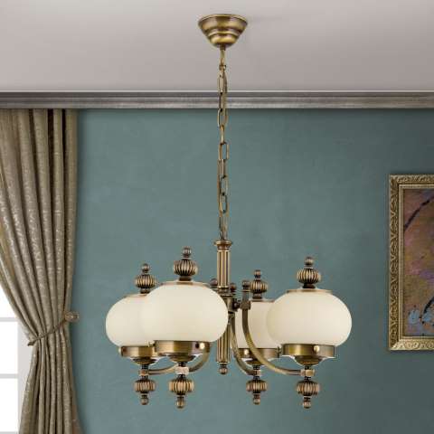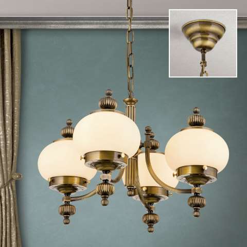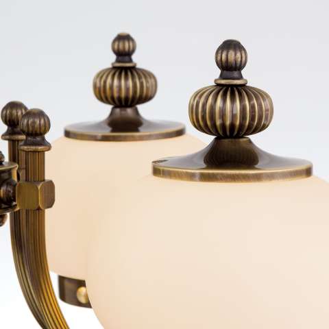 Die detailreichen Verzierungen und geschwungenen Linien verleihen der klassischen Deckenleuchte Belvedere ihre unverwechselbare Optik. Die dekorativen Messingelemente mit aufwendig gestalteten Zierkugeln spiegeln die Pracht klassischer Beleuchtungskunst wider, während die weichen Konturen der Glasschirme das Licht sanft im Raum verteilen.