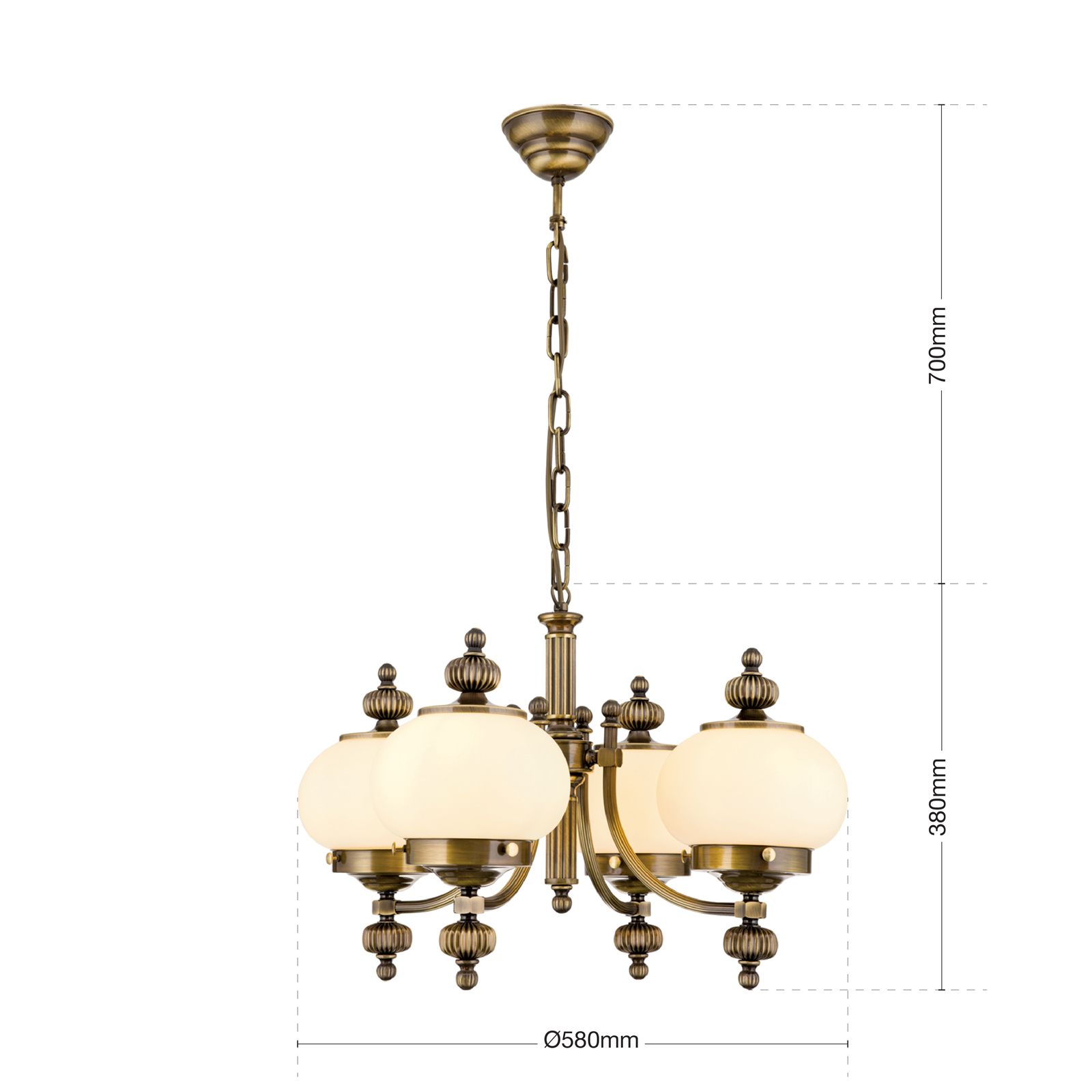 Die stilistisch klassische Deckenleuchte bringt den Charme vergangener Epochen in Ihr Zuhause. Inspiriert vom eleganten Jugendstil, vereint dieser 4-flammige Kronleuchter kunstvolle Verzierungen mit funktionaler Beleuchtung. Das hochwertige Messing in Patina-Optik und die edlen champagne matten Glasschirme sorgen für eine stilvolle und warme Lichtstimmung – perfekt für Wohnräume mit klassischer oder nostalgischer Einrichtung.