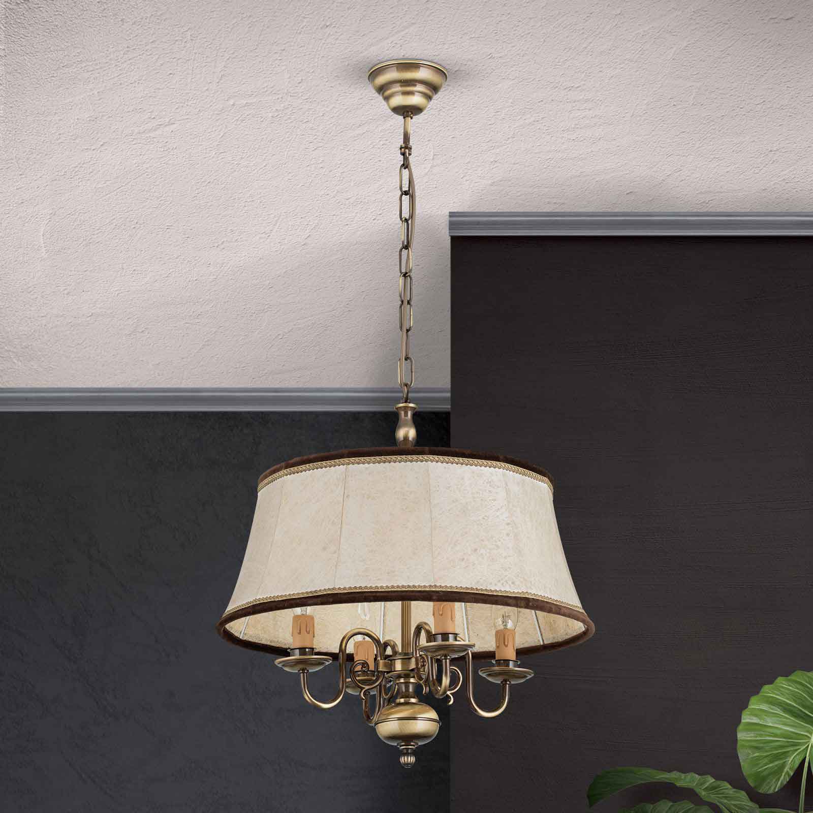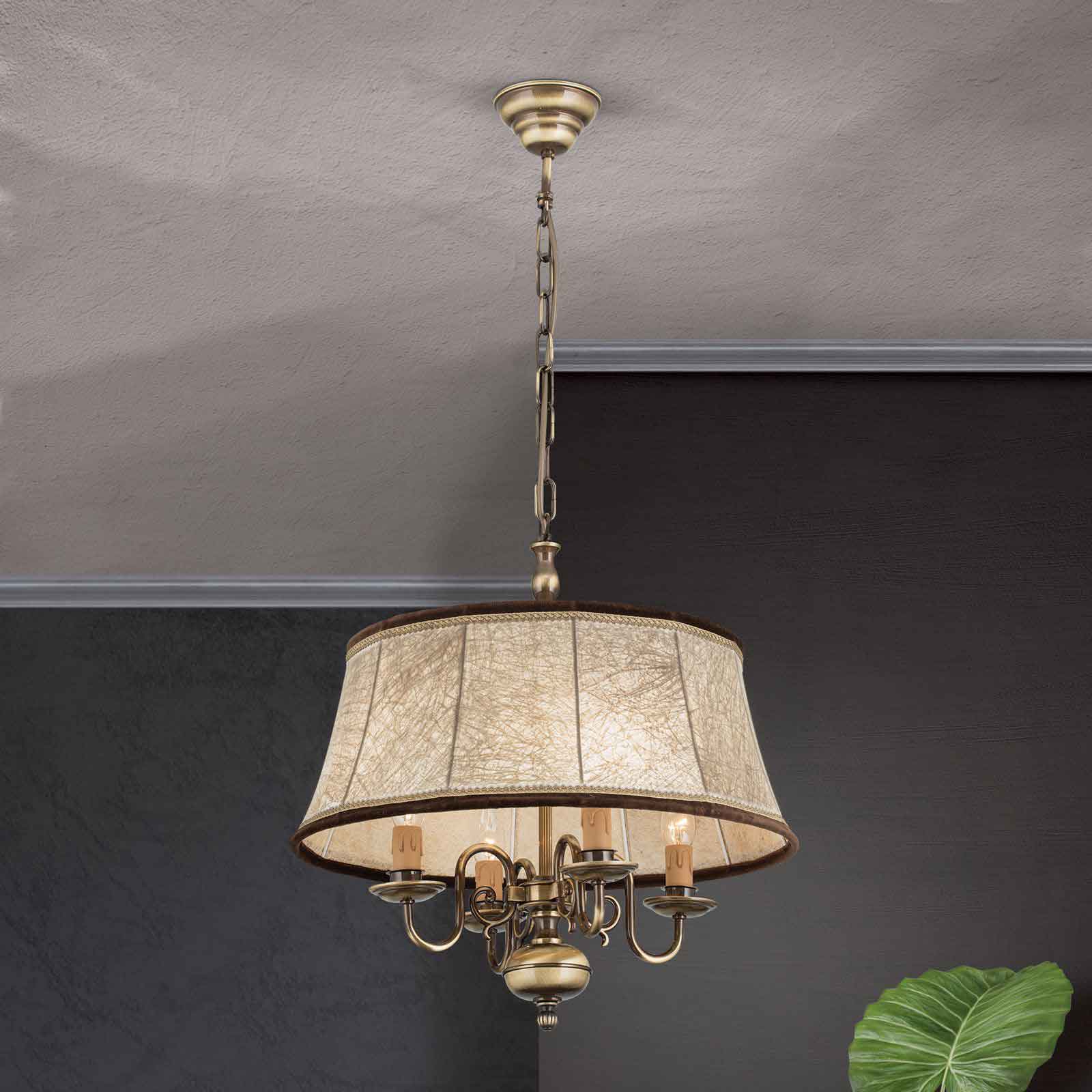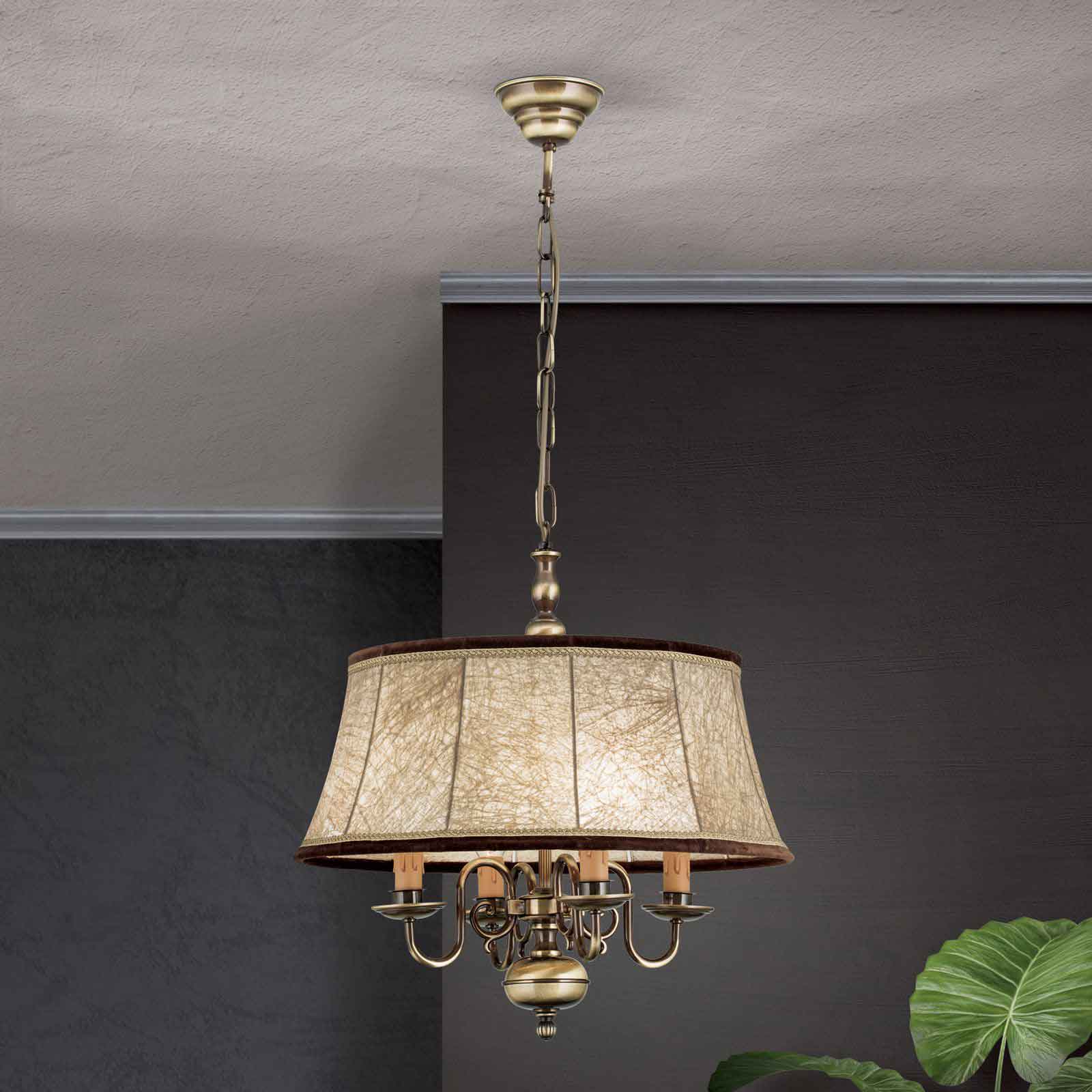 Die klassische Hängeleuchte mit Kerzen hat eine Korpushöhe vonm 45 cm. Die Länge der Abhängung beträgt 70 cm. Die 4-flammige Kerzen-Hängelampe ist den flämischen Barocklustern nachempfunden. Das Leuchtengestell wird in Österreich aus solidem Messing sorgsam in Handarbeit gefertigt. Der Schirm aus edlem Leder ergänzt die Pendelleuchte um die zusätzliche Funktion eines weichen und gleichmäßig gestreuten Lichtes. Die einzelnen Lampenfassungen sind in Kerzenoptik gestaltet. Die Tropfschalen werden kunstvoll über S-bogenförmige Arme mit der Mittelsäule verbunden. Zurückhaltend-gediegene Verzierungen, Ranken und Kanneluren runden das antikisierende Bild ab. Parkettböden, gedeckte Farben, fließende Stoffe, weiche Teppiche und das warme Licht dieser Hängeleuchte Licht bilden eine wohlig-entspannte Einheit. Lassen Sie mit dieser klassischen Hängeleuchte mit Kerzen aus unserer Leuchtenserie Kira ein besonders angenehmes Licht in Ihren Innenräumen entstehen. Die Leuchte verfügt über vier E14-Fassungen zu je maximal 40 Watt. Energieeffiziente LED-Lampen helfen Strom und Kosten zu sparen. Sie bekommen die klassische Hängeleuchte mit Kerzen Modell Kira bei uns inklusive LED-Leuchtmittel geliefert. Schließlich soll Ihre neue Beleuchtung sofort nach der Installation einsatzbereit sein. Für die individuelle Anpassung Ihrer Lichtverhältnisse sorgt die Dimmbarkeit der Deckenleuchte. Setzen Sie mit der richtigen Beleuchtung tolle Lichtakzente und untermalen Sie die Schönheit Ihrer Innenräume. Lassen Sie stilgerecht Ihr antikes Mobiliar in einem bezauberndem Licht erstrahlen. Schließlich sorgt eine angenehme Lichtatmosphäre für Wohlbehagen- sowohl bei Ihnen als auch Ihren Gästen. Die klassische Hängeleuchte mit Kerzen entspricht der Schutzart IP 20 und ist damit ausschließlich für Innenräume als Beleuchtung geeignet. Wir empfehlen Ihnen als perfekte Ergänzung aus der gleichen Leuchtenserie unseren Kronleuchter klassisch 8-flammig. Bringen Sie stilgerecht Licht in Ihre Räumlichkeiten.