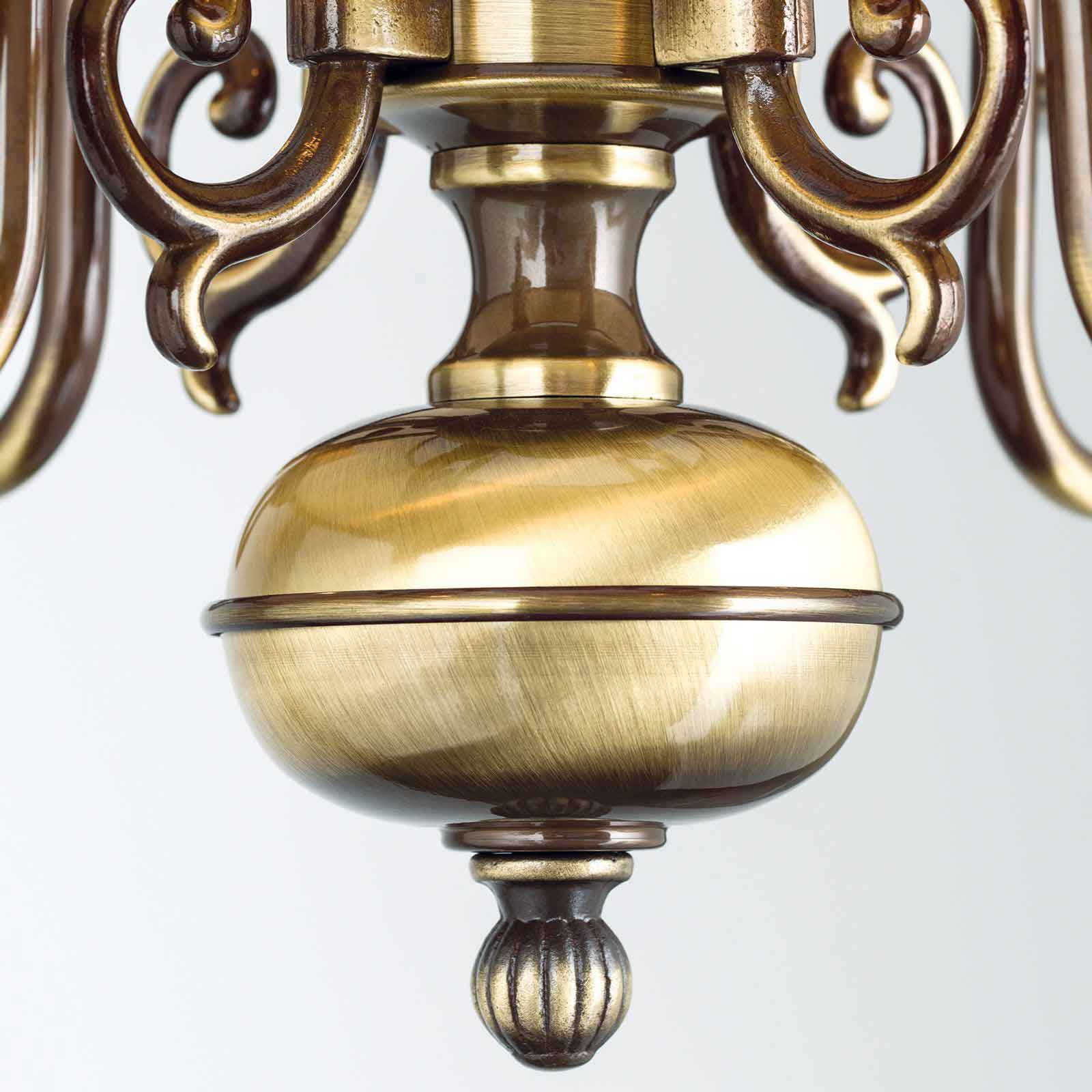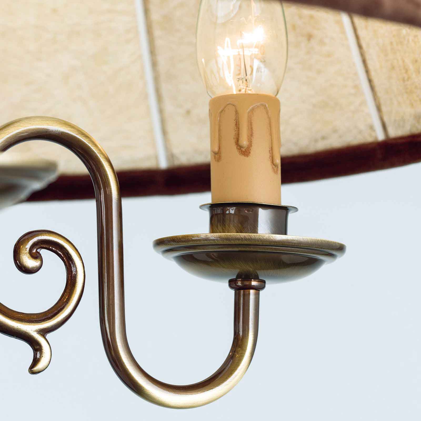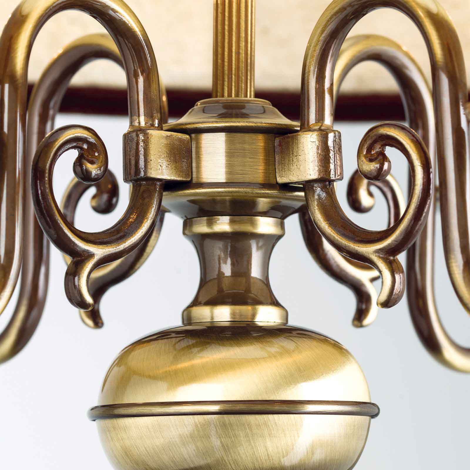Die klassische Hängeleuchte mit Kerzen hat eine Korpushöhe vonm 45 cm. Die Länge der Abhängung beträgt 70 cm. Die 4-flammige Kerzen-Hängelampe ist den flämischen Barocklustern nachempfunden. Das Leuchtengestell wird in Österreich aus solidem Messing sorgsam in Handarbeit gefertigt. Der Schirm aus edlem Leder ergänzt die Pendelleuchte um die zusätzliche Funktion eines weichen und gleichmäßig gestreuten Lichtes. Die einzelnen Lampenfassungen sind in Kerzenoptik gestaltet. Die Tropfschalen werden kunstvoll über S-bogenförmige Arme mit der Mittelsäule verbunden. Zurückhaltend-gediegene Verzierungen, Ranken und Kanneluren runden das antikisierende Bild ab. Parkettböden, gedeckte Farben, fließende Stoffe, weiche Teppiche und das warme Licht dieser Hängeleuchte Licht bilden eine wohlig-entspannte Einheit. Lassen Sie mit dieser klassischen Hängeleuchte mit Kerzen aus unserer Leuchtenserie Kira ein besonders angenehmes Licht in Ihren Innenräumen entstehen. Die Leuchte verfügt über vier E14-Fassungen zu je maximal 40 Watt. Energieeffiziente LED-Lampen helfen Strom und Kosten zu sparen. Sie bekommen die klassische Hängeleuchte mit Kerzen Modell Kira bei uns inklusive LED-Leuchtmittel geliefert. Schließlich soll Ihre neue Beleuchtung sofort nach der Installation einsatzbereit sein. Für die individuelle Anpassung Ihrer Lichtverhältnisse sorgt die Dimmbarkeit der Deckenleuchte. Setzen Sie mit der richtigen Beleuchtung tolle Lichtakzente und untermalen Sie die Schönheit Ihrer Innenräume. Lassen Sie stilgerecht Ihr antikes Mobiliar in einem bezauberndem Licht erstrahlen. Schließlich sorgt eine angenehme Lichtatmosphäre für Wohlbehagen- sowohl bei Ihnen als auch Ihren Gästen. Die klassische Hängeleuchte mit Kerzen entspricht der Schutzart IP 20 und ist damit ausschließlich für Innenräume als Beleuchtung geeignet. Wir empfehlen Ihnen als perfekte Ergänzung aus der gleichen Leuchtenserie unseren Kronleuchter klassisch 8-flammig. Bringen Sie stilgerecht Licht in Ihre Räumlichkeiten.