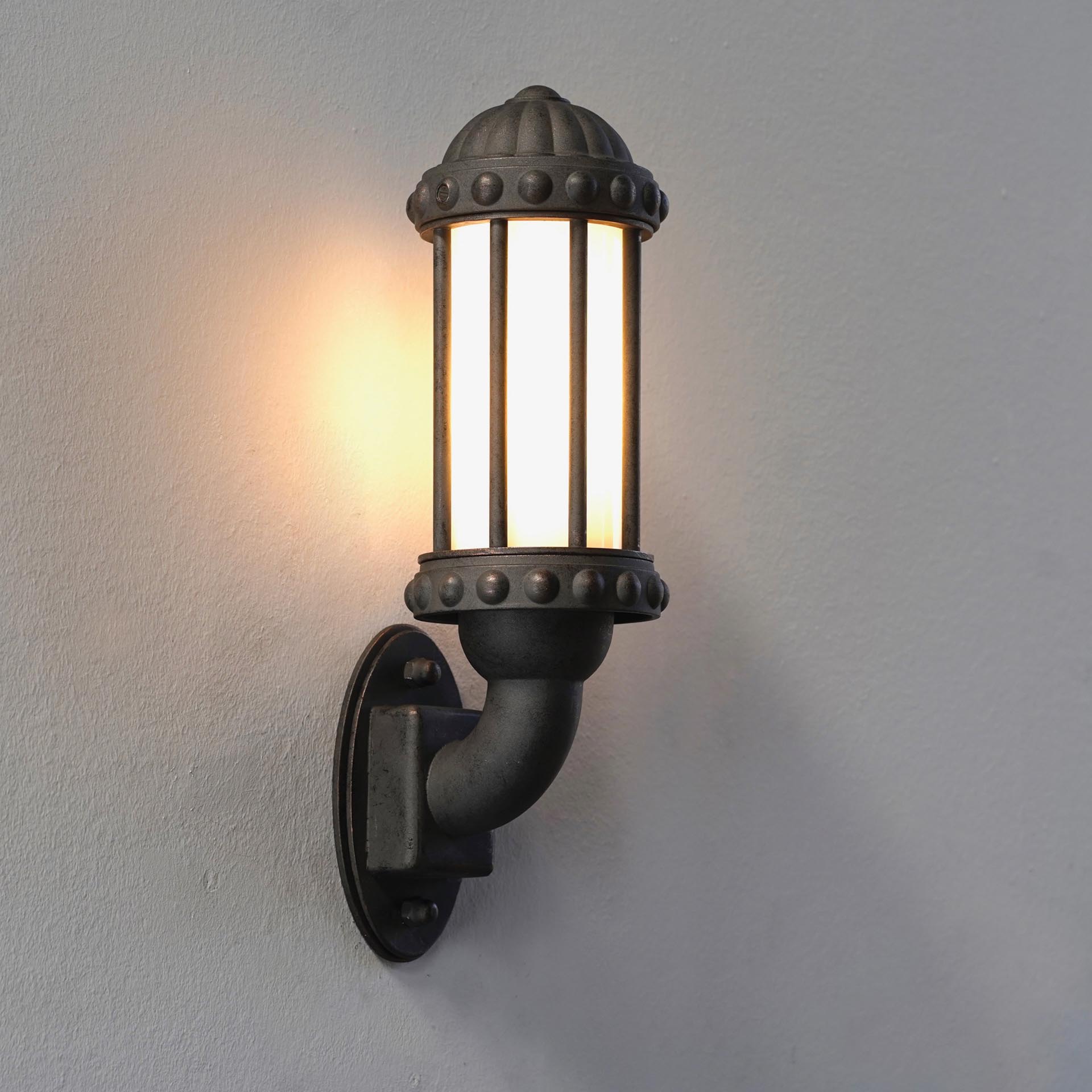 Die klassische Säulen Wandleuchte Modell Prato eignet sich mit ihrem schmiedeeisernen Look in der Farbe Alt-Kupfer und dem länglichen zylinderförmigen Opalglas für die Beleuchtung von Hausfassaden mit historischem Flair. Die aus hochwertigen Materialien gefertigte Außenleuchte wird für eine besondere Langlebigkeit aus feuerverzinktem Stahl und Aluminium hergestellt. Die im Design klassisch-historische Aussenleuchte lässt mit ihrer länglichen Form tolle Lichtakzente an Hausfassaden im Hauseingangsbereich oder auch auf der Terrassenseite entstehen. Die klassische Säulen Wandleuchte Prato ist von ihren Maßen 40 cm hoch, 12 cm breit und zeigt einen Wandabstand von lediglich 14,6 cm. Wer also eine klassische Außenwandleuchte sucht, die weniger ausladend von der Größe ist, trifft hiermit sicherlich eine gute Wahl. Die Wandmanschette ist 15,6 cm hoch und 8,6 cm breit. Das Finish Alt-Kupfer verleiht der exklusiven Außenwandleuchte einen authentischen Look, der sich harmonisch in jede Umgebung einfügt. Die hochwertige Qualitätsleuchte besteht aus dem massiven schmiedeeisernen aufrechten Wandarm mit ovalförmiger Wandmanschette und einer rundförmigen Leuchtenhaube ebenfalls aus robustem feuerverzinktem Stahl und dem mundgeblasenen echten Opalglas in der Form eines Zylinderglases. Die schmalen Längsstreben aus Schmiedeeisen geben der klassischen Säulen Wandleuchte den besondern optischen Schliff. Dabei wird in der deutschen Leuchtenmanufaktur viel Wert auf eine detailgetreue und fachmännische Herstellung gelegt. Die verwendete E27-Lampenfassung wird mit Leuchtmitteln bis 60 Watt Leistung bestückt. Wir empfehlen als Lichtfarbe warmweißes Licht (2900 bis 3200 Kelvin). Leuchtmittel sind bei der Lieferung nicht enthalten. Detailreich-klassisch-historisch überzeugt diese klassische Säulen Wandleuchte mit einem mittelalterlichem Touch. Jede Leuchte ist ein Unikat, das durch traditionelle Schmiedekunst und ein kreatives Design besticht. Die Leuchte gibt es je nach Geschmack auch in weiteren Finishes: Neben dem Finish Alt-Kupfer erhalten Sie die Wandleuchte auch in Eisen natur, Alt-Bronze, Taverna, schwarz, schwarz-silber, Patina, Terra, grün-antik und Steampunk. Das Gesamtgewicht beträgt 4 kg. Die Liebe zum Detail macht diese Wandleuchte dabei zu etwas ganz Besonderem. Alternativ empfehlen wir Ihnen auch die außergewöhnliche Designer Außenwandleuchte Rustica.