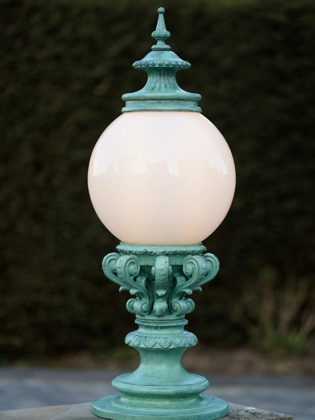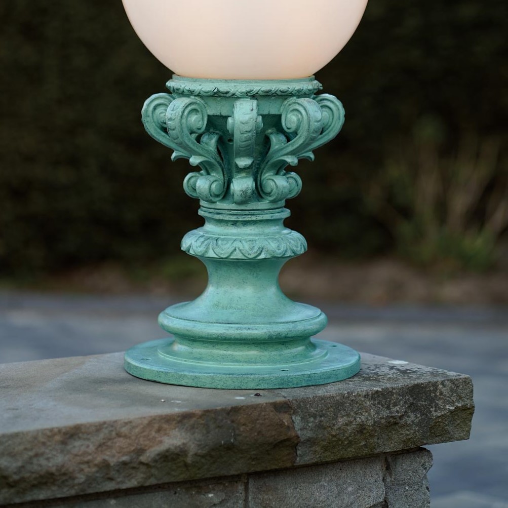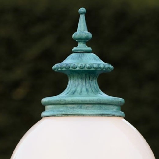 Diese romantisch klassische Sockelleuchte steht ihren antiken Vorbildern in nichts nach. Sie eignet sich insbesondere als Beleuchtung von Podesten, Mauerabsätzen, Treppenabsätzen oder auch Zaunpfählen. Jedes ornamentale Detail wird in traditioneller Weise in der deutschen Leuchtenmanufaktur Robers-Leuchten handgeschmiedet. Die einzigartige Gartenleuchte wird nach dem Schmieden feuerverzinkt und mit dem Finish Liberty (Spanisch-grün) oder einem Finish Ihrer Wahl behandelt. Sollten Ihrerseits noch Wünsche bestehen, sprechen Sie uns gern darauf an. Zahlreiche optisch spielerische Ornamente und geschwungene Bögen, kombiniert mit einer weißen Opalglas-Kugelhaube, verleihen ihr eine einzigartige Ausstrahlung. Die Perfektion erhält die dekorative Kugel-Sockelleuchte durch den stilreichen Aufsatz mit Pickelspitze.