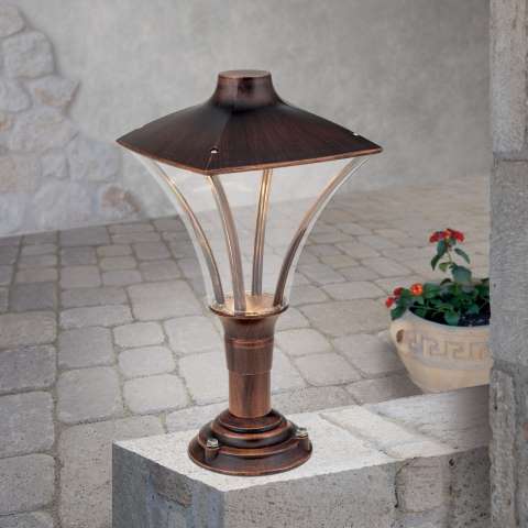 Die im Design antik klassische Sockelleuchte mit LED Modell Villach zeigt sich mit einer antik schwarz-kupferfarbenen Lackierung. Ausgehend von einem breiten Sockel mit rundförmigen Sockelfuß in Stufenoptik öffnet sich am Ende des Stiels ein Glasschirm in Laternenoptik. Der Laternenschirm ist ganz klassisch in antike Metallstreben gefasst und spielt dennoch durch die gebogene Formöffnung mit neuen Zugängen. Besonders ist auch, dass die in der Abdeckung eingebauten LED Platinen auf den ersten Blick nicht sichtbar sind und für das Auge des Betrachters somit die Formgebung der Leuchte im Vordergrund steht. Das warmweiße Licht wird angenehm über die vier Seiten der Laterne abgegeben, ohne zu blenden. Die LED Sockelleuchte ist von ihren Maßen 54 cm hoch und 28 cm sowohl breit als auch lang. Das quadratische Leuchtendach ist optisch gleichmäßig abfallend. Dabei spielt die stilvolle Außenbeleuchtung mit klassischen Elementen wie dem klassisch antiken Finish und kombiniert sie mit einer erfrischend gebogenen Laternenform. So schafft die klassische Sockelleuchte LED sowohl dezent zu agieren, als auch auffallend zu einer wohnlichen Atmosphäre beizutragen.