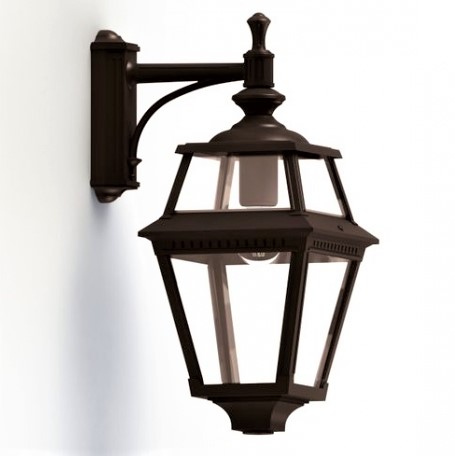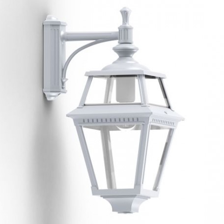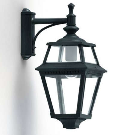Die klassische Wandlaterne Modell Vogese 2 ist eine stilvolle besonders transparente Außenwandleuchte, im Design absolut stilvoll und authentisch. Acht trapezförmige Glaseinsätze auf zwei Ebenen sorgen für die entsprechende Lichtdurchlässigkeit der Wandleuchte. Die abwärts gerichtete Outdoorleuchte ist hochwertig verarbeitet und von ihren Maßen 54,9 cm hoch, 24 cm breit und 33,7 cm tief. Die hochwertige klassische Wandlaterne aus unserer Leuchtenserie Vogese 2 wird in einer französischen Leuchtenmanufaktur in echter Handarbeit aus Aluminium gefertigt. Bei der exklusiven Außenbeleuchtung stehen Ihnen je nach Geschmack und örtlichen Vorgaben bis zu 6 verschiedene Farben/RAL-Farben zur Verfügung. Damit lässt sich die dekorative Wandleuchte für Draußen in vielen Bereichen und Farbumgebungen platzieren. Wählen Sie bei der dekorativen Außenleuchte zwischen tiefschwarz (RAL 9005), weiß, alt-rustikal (braun), grün-Patina oder gold-Patina. Die Leuchte wird auch mit einem edlen Messing-Finish angeboten. Hierbei dient schwarz lackiertes Aluminium als Basismaterial, auf das eine Messing-Patina gelegt wird, um den Messing-Finish-Effekt zu erzeugen. Der französische Hersteller gibt ab Werk auf das beschichtete Aluminium eine 25-jährige Anti-Korrosionsgarantie*. Die acht Fenstereinsätze werden aus echtem Klarglas gefertigt. Setzen Sie mit der klassischen Wandlaterne Ihren Eingangsbereich, Terrassenbereich oder andere Nebengelasse stilvoll in Szene. Natürlich eignet sich die Außenleuchte auch sehr gut als exklusive Gastronomie-Außenbeleuchtung. Begeistern Sie Ihre Gäste mit einer ansprechenden Beleuchtung. Die Designerleuchte wird mit einer E 27-Lampenfassung gefertigt. Sie bestücken die hochwertige Außenleuchte mit Leuchtmitteln bis zu 105 Watt Leistung. Leuchtmittel sind bei der Lieferung nicht enthalten. Wir empfehlen aus optischen Gründen auch die Bestückung mit sogenannten Retro-Leuchtmitteln. Die Lichtfarbe Warmweiß (z.B. 2700 Kelvin) sorgt für eine eher stimmungsvolle Lichtatmosphäre, während kaltweißes Licht generell mehr Helligkeit erzeugt. Die klassische Wandlaterne Modell Vogese 2 entspricht der Schutzart IP 44 sowie der Schutzklasse 1. Setzen Sie mit dieser tollen Leuchte im Außenbereich tolle Lichtakzente.