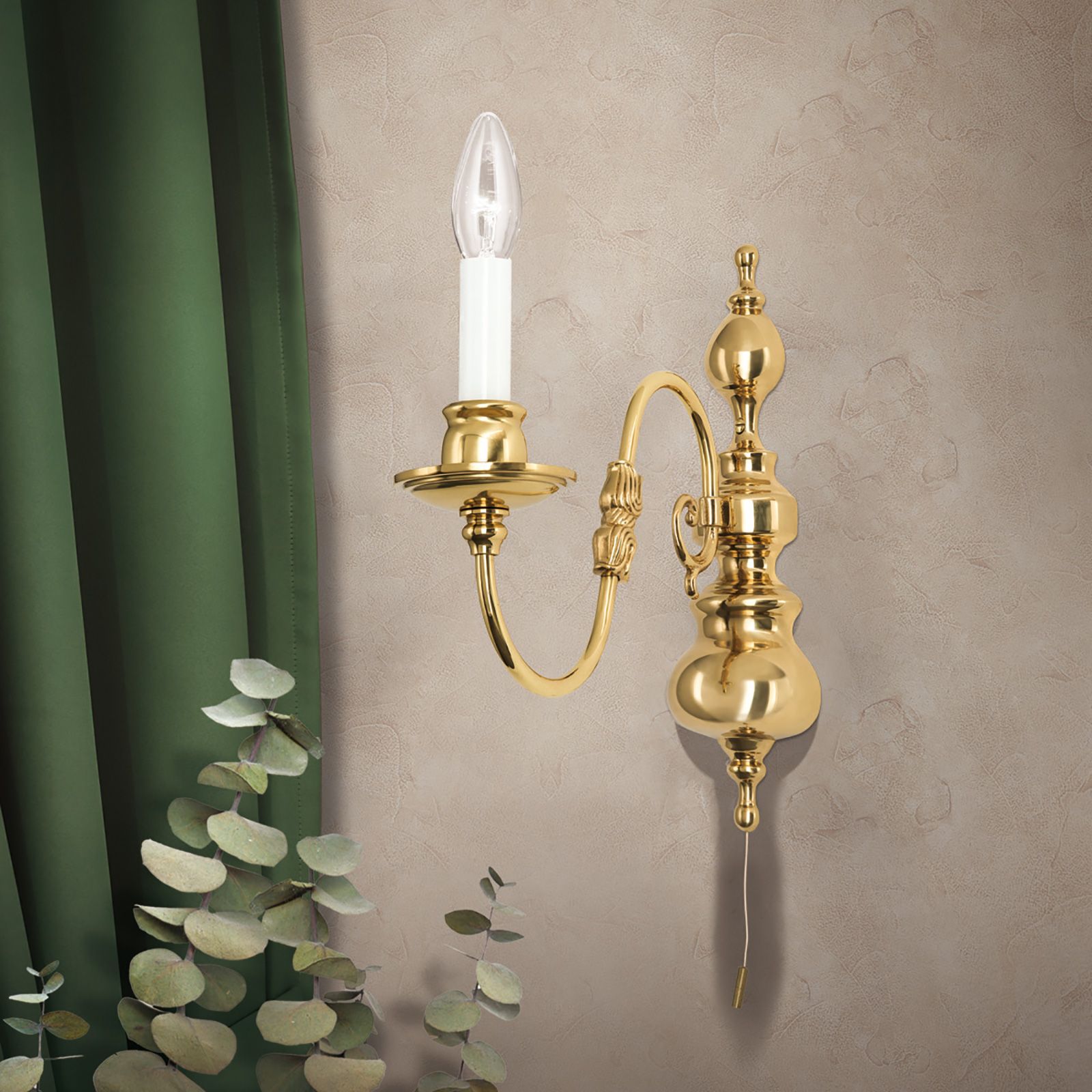 Unsere ein-flammige klassische Wandleuchte Messing ist mehr als nur eine Lichtquelle – sie schafft eine einladende und intime Atmosphäre in großzügigen Räumen. Diese elegante Innenbeleuchtung eignet sich ideal, um gemütliche Rückzugsorte zu gestalten, sei es in Kombination mit Polstermöbeln, kleinen Tischen oder Vorhängen. Gleichzeitig kann sie als stilvolles Dekorationselement dienen, das die Wirkung eines klassischen Möbels unterstreicht.