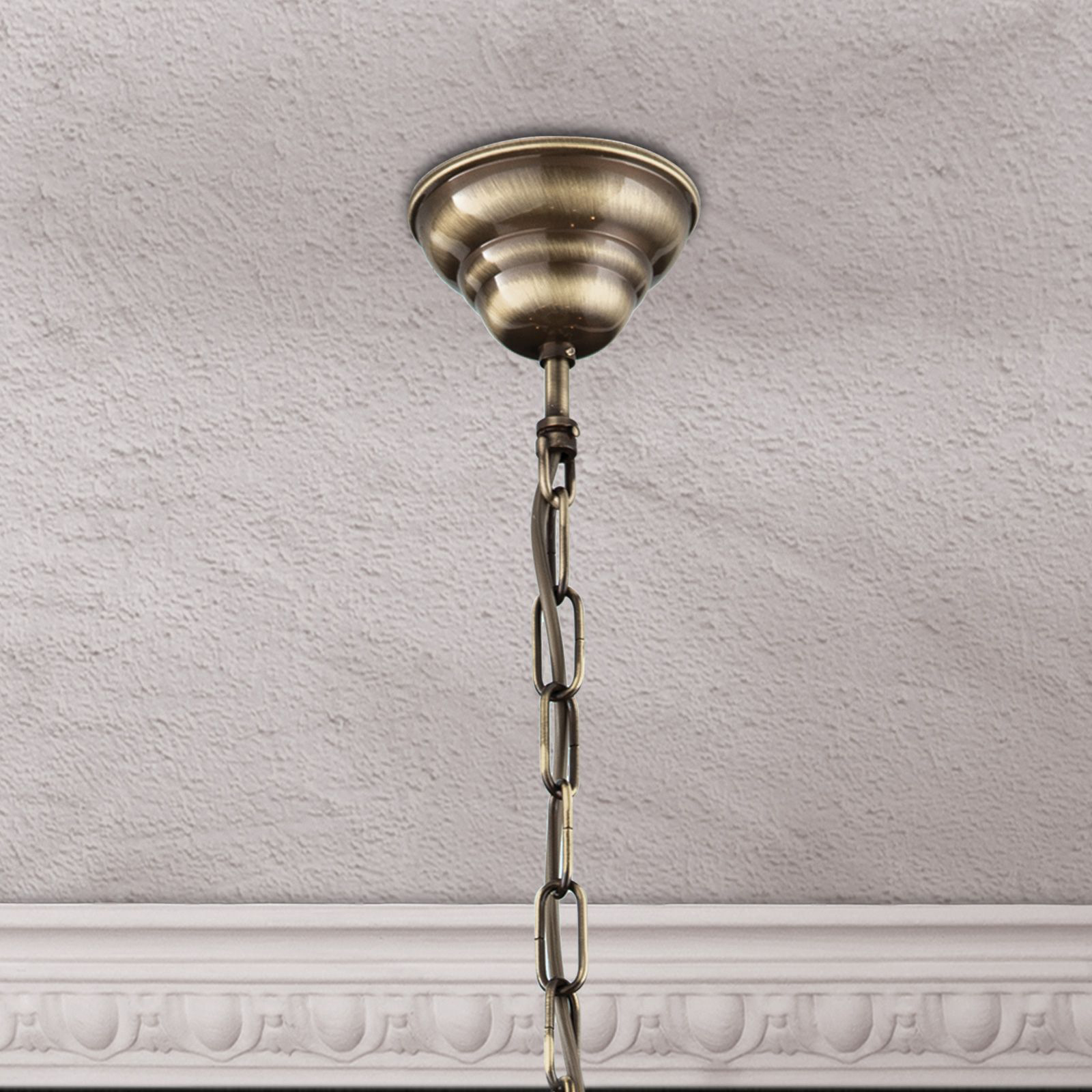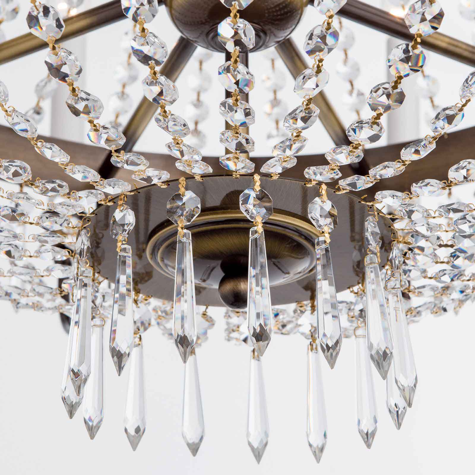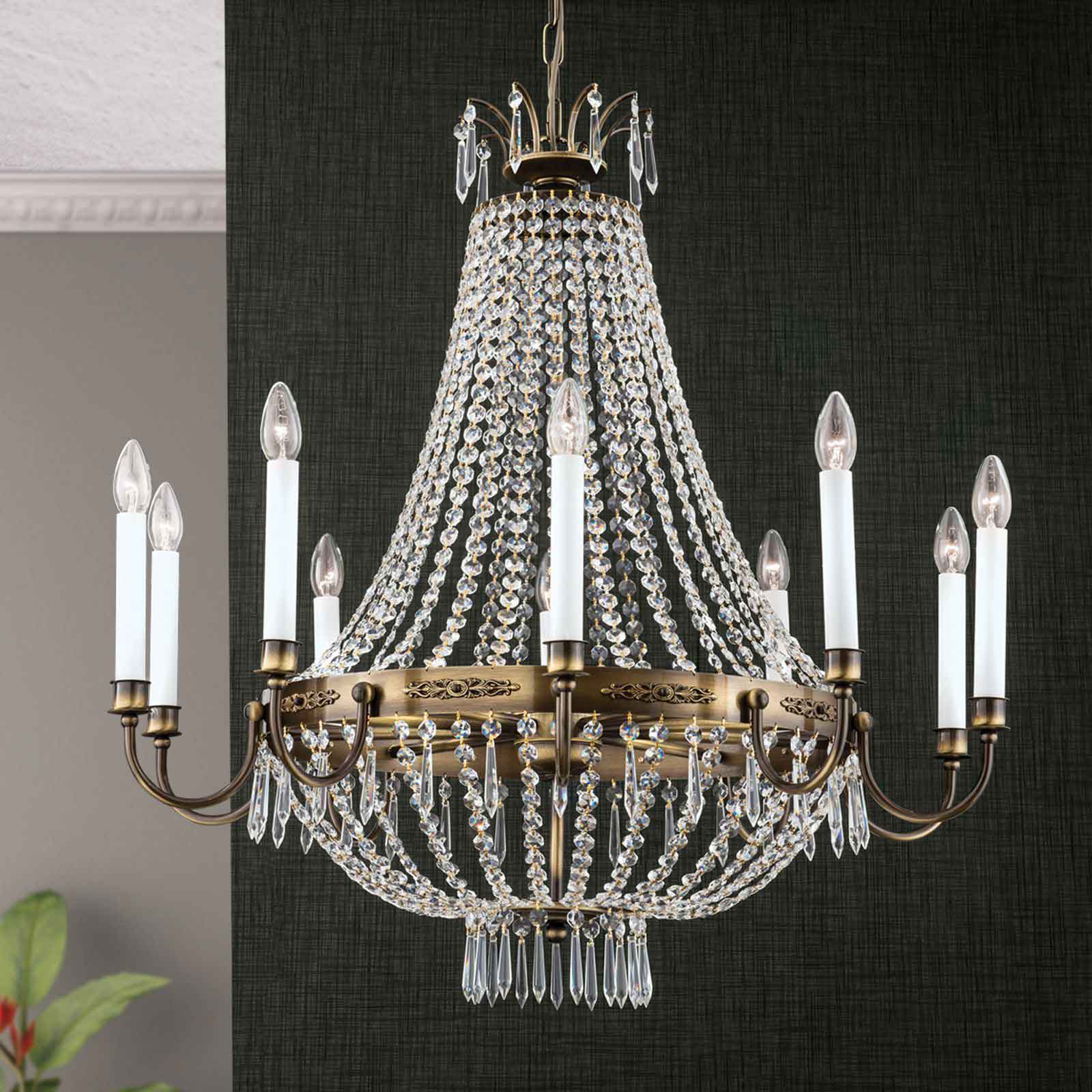 In der klassischen Form eines Korblüsters besteht das Gestell des klassischen Kronleuchters aus Vollmessing mit einer Oberfläche in Patina sowie einem schön geprägten Zierband, an dem die Leuchtarme befestigt sind. Zu Ketten verbundene Kristalle aus dem Hause Asfour in Koppenform formen den Schirm des Gestells, das mit zusätzlichen mit Kristallen in Tropfenform an der oberen sowie unteren Schale und unterhalb des Zierbandes geschmückt ist. Der klassische Kronleuchter Gloria ist von den Maßen 86 cm hoch. Die Länge der Abhängung beträgt 70 cm. Der Durchmesser von insgesamt 84 Zentimetern lässt die in Österreich in echter Handarbeit gefertigte Deckenbeleuchtung besonders majestätisch wirken. Die 10 E14-Lampenfassungen, die sich hinter der stilgerechten Fassungsverkleidung der Kerzen verstecken, werden mit maximal je 40 Watt betrieben. Sie erhalten bei uns für einen sofortigen Einsatz Ihrer neuen Deckenbeleuchtung 11 LED-Leuchtmittel in der Lichtfarbe Warmweiß (2700 Kelvin) in klar mit einer Leistung von 4,5 Watt bei 470 Lumen je Kerze bei Lieferung gratis dazu. Dabei ist ein Leuchtmittel als Reserve gedacht. Für die perfekte Lichtstimmung kann mithilfe einer Dimmers die Helligkeit reguliert werden. Die Innenleuchte entspricht der Schutzart IP 20 und hat ein Netto-Gesamtgewicht von 10 kg.