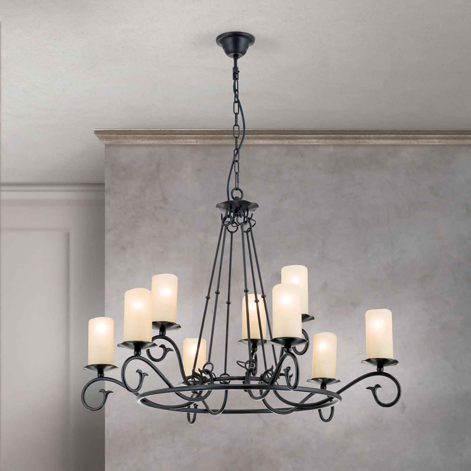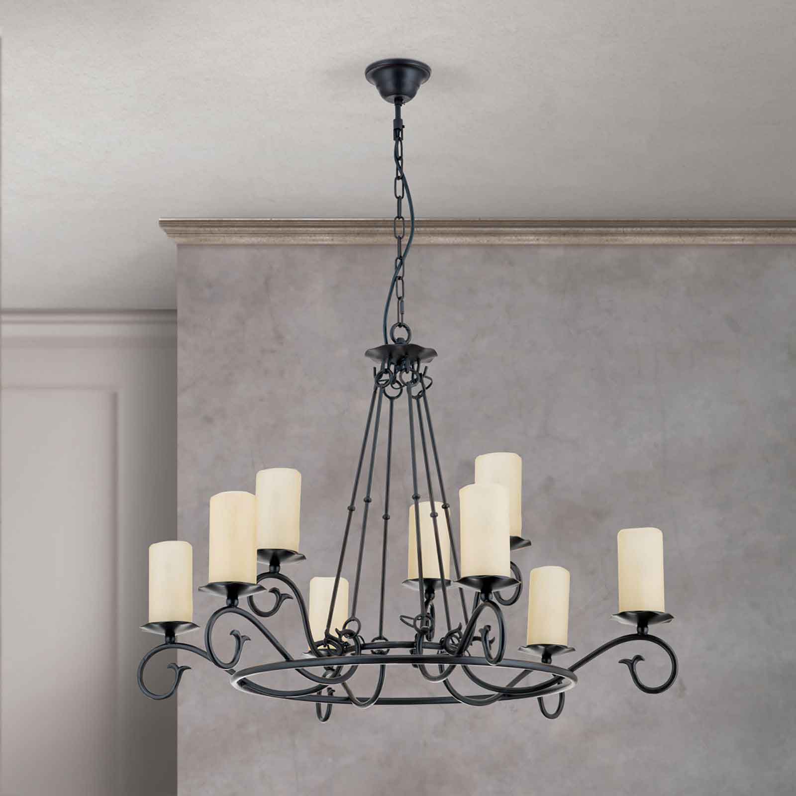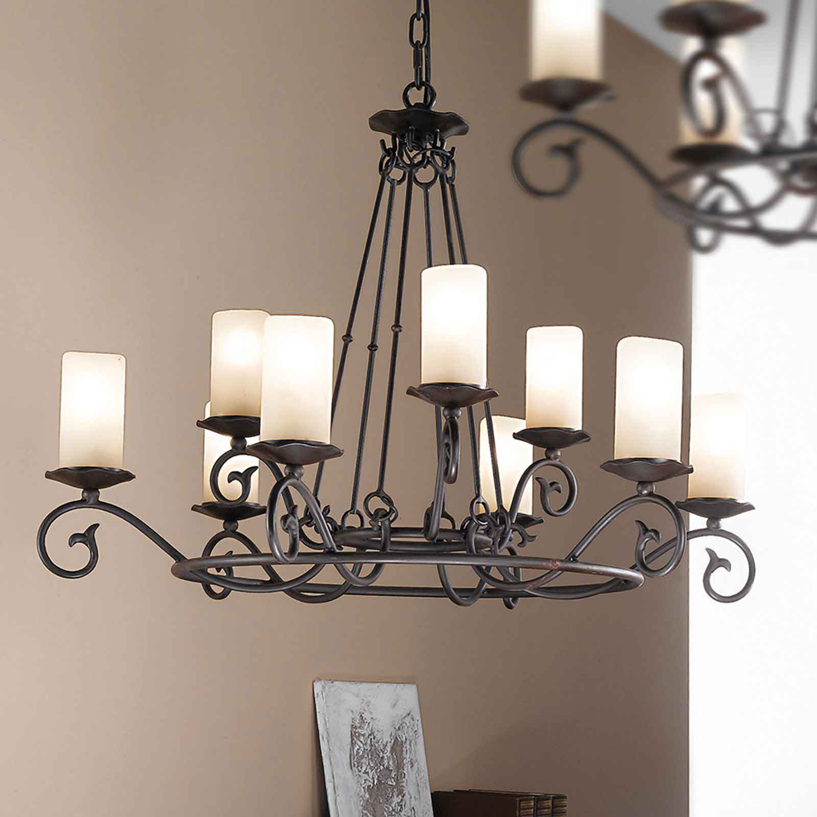Der klassische Kronleuchter Landhausstil aus unserer Modellserie Rustica ist eine klassisch-rustikale Hängelampe aus solidem Stahl mit einem antiken Finish und opalmatten Glasaufsätzen. Die stilvolle 9-flammige Deckenleuchte passt hervorragend zu Einrichtungen im Landhausstil, wo der rustikal gehaltene Kronleuchter im Schmiededesign seine volle Wirkung entfaltet. Auf einem massiven Metallring sind neun gebogene Arme mit elegant geschwungenen Spiralen angebracht, auf denen sich Tropfenfänger befinden. Die an Wachskerzen erinnernden zylindrischen, opalmatten Echtglasaufsätze sorgen für eine blendfreie und angenehme Beleuchtung. In Kombination mit einem Dimmer kann die Helligkeit der dimmbaren Deckenleuchte individuell an die eigenen Bedürfnisse angepasst werden.