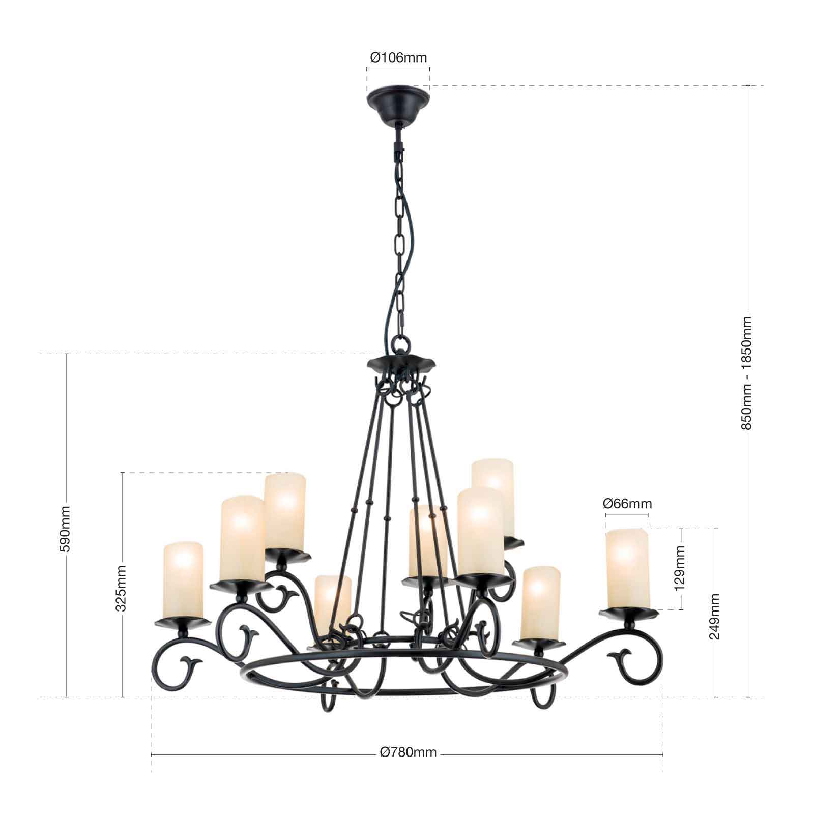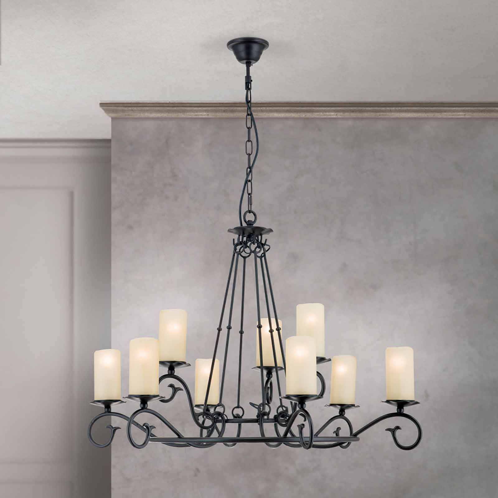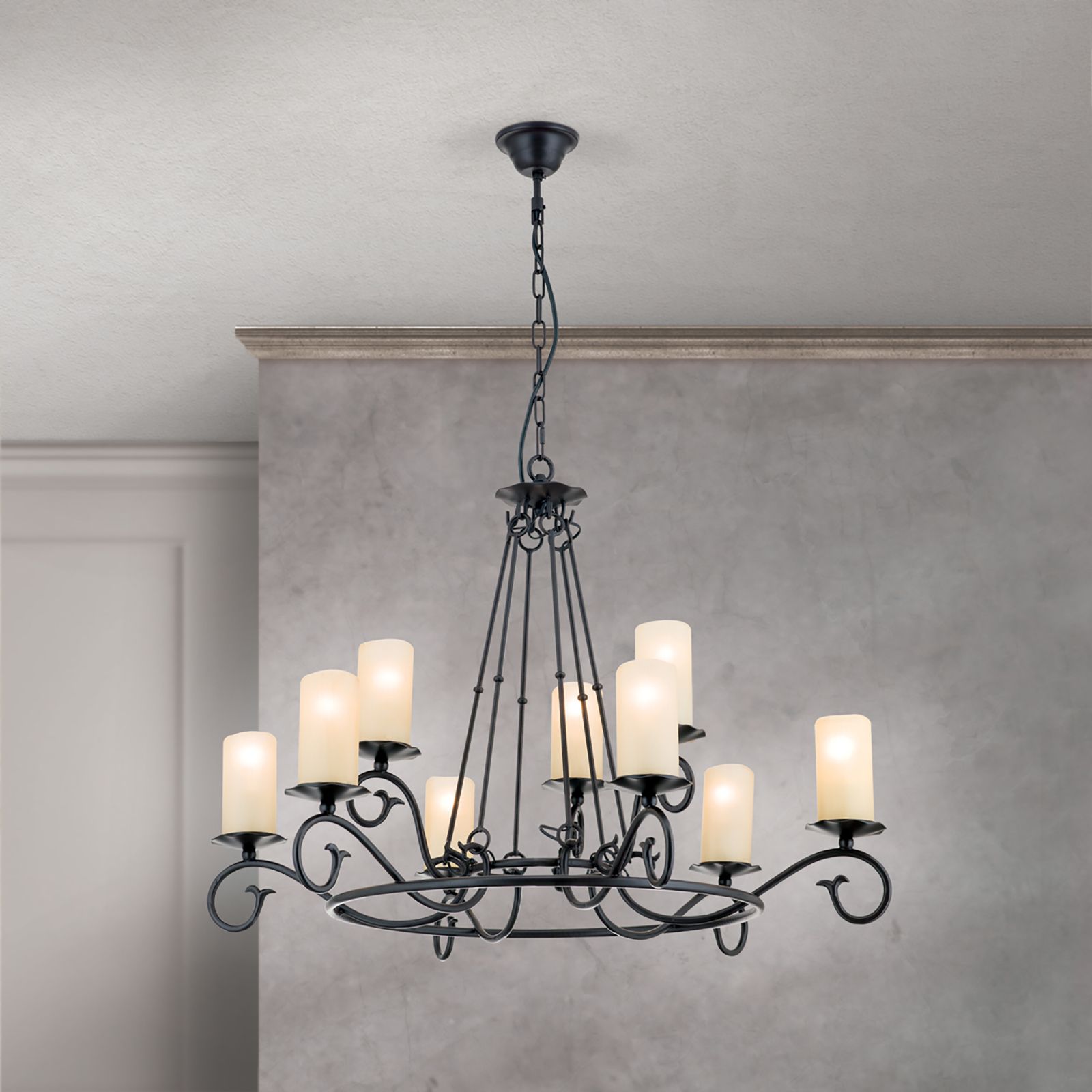 Der klassische Kronleuchter Landhausstil aus unserer Modellserie Rustica ist eine klassisch-rustikale Hängelampe aus solidem Stahl mit einem antiken Finish und opalmatten Glasaufsätzen. Die stilvolle 9-flammige Deckenleuchte passt hervorragend zu Einrichtungen im Landhausstil, wo der rustikal gehaltene Kronleuchter im Schmiededesign seine volle Wirkung entfaltet. Auf einem massiven Metallring sind neun gebogene Arme mit elegant geschwungenen Spiralen angebracht, auf denen sich Tropfenfänger befinden. Die an Wachskerzen erinnernden zylindrischen, opalmatten Echtglasaufsätze sorgen für eine blendfreie und angenehme Beleuchtung. In Kombination mit einem Dimmer kann die Helligkeit der dimmbaren Deckenleuchte individuell an die eigenen Bedürfnisse angepasst werden.