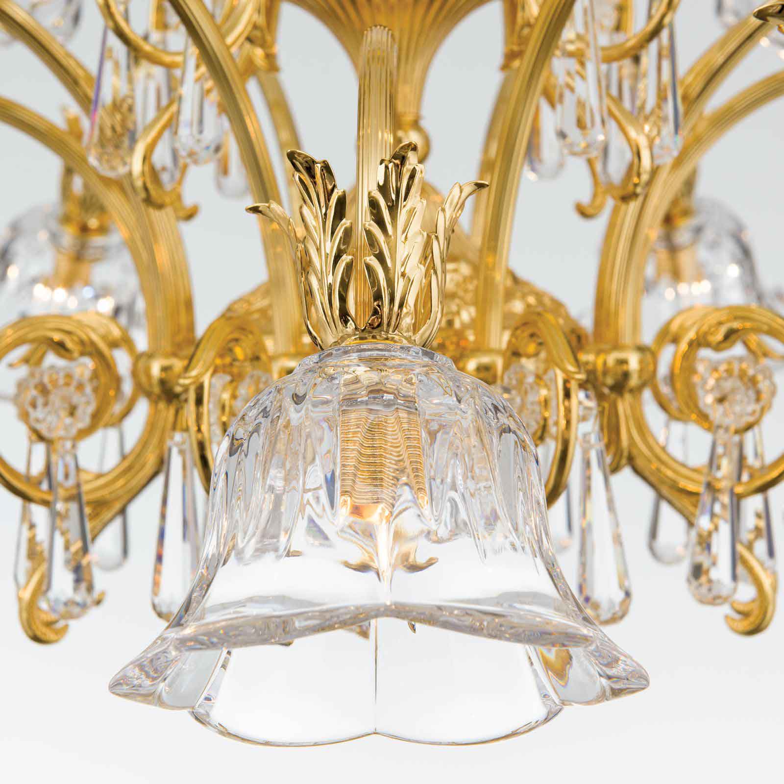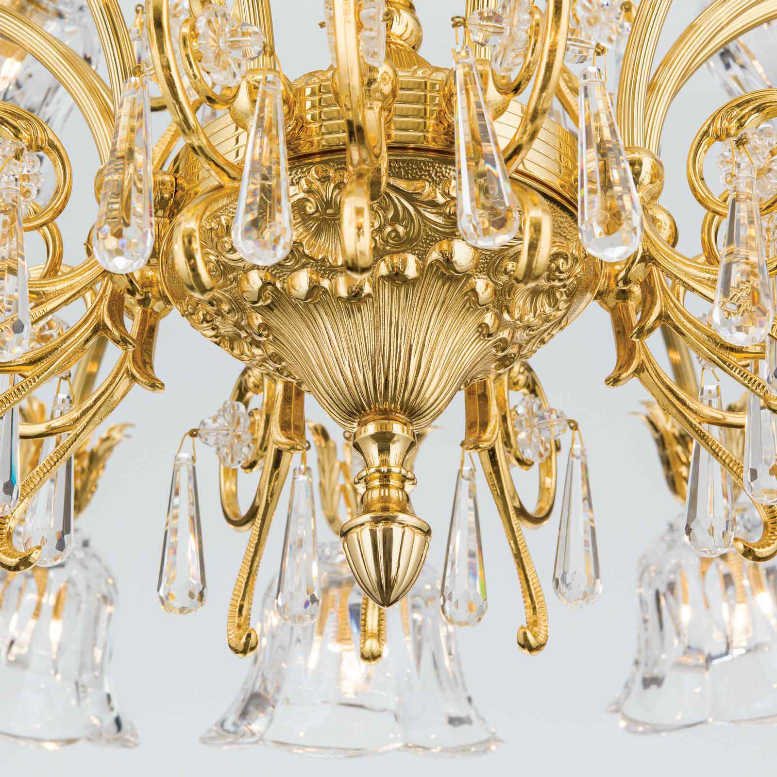Der klassische Kronleuchter gold Modell Bohème ist eine lichtstarke und zugleich klassisch-antike Design-Deckenbeleuchtung aus solidem Messing. Der stilvolle Luster, wie die Österreicher einen Kronleuchter nennen, könnte in einem Wiener Café aufgehängt sein. Die Deckenbeleuchtung im floralem Design verzückt mit einem eher verspielten Antlitz. Mit ihren 16 goldfarbenen detailreich verzierten geschwungenen Armen und den stilvollen Kristall-Leuchtenschirmen steht einer Anbringung in einem großen Eingangsbereich, Besprechungszimmer oder Restaurant nichts im Wege. Die liebevoll gestalteten Details ziehen sich bei der großen Deckenlampe von der Deckenrosette bis hin zu den Kristallschirmen. Das Leuchtengestell besteht aus Vollmessing mit einem Oberflächenfinish in der Farbe Gold. Die kunstvoll verzierte Säule trägt 16 kannelierte Arme mit ihren Kristallschirmen, die sich schwungvoll schräg nach unten biegen, dadurch kann das Licht breit gestreut werden und so zur Grundbeleuchtung eines Raumes beitragen. Die Akanthusblätter, die an den klaren Kristallschirmen angebracht sind, runden das Erscheinungsbild einer Blüte wunderbar ab. Für noch mehr Extravaganz sorgen bei diesem klassischen Kronleuchter gold die zahlreich angebrachten tropfenförmigen 1A Vollschliff-Kristalle.