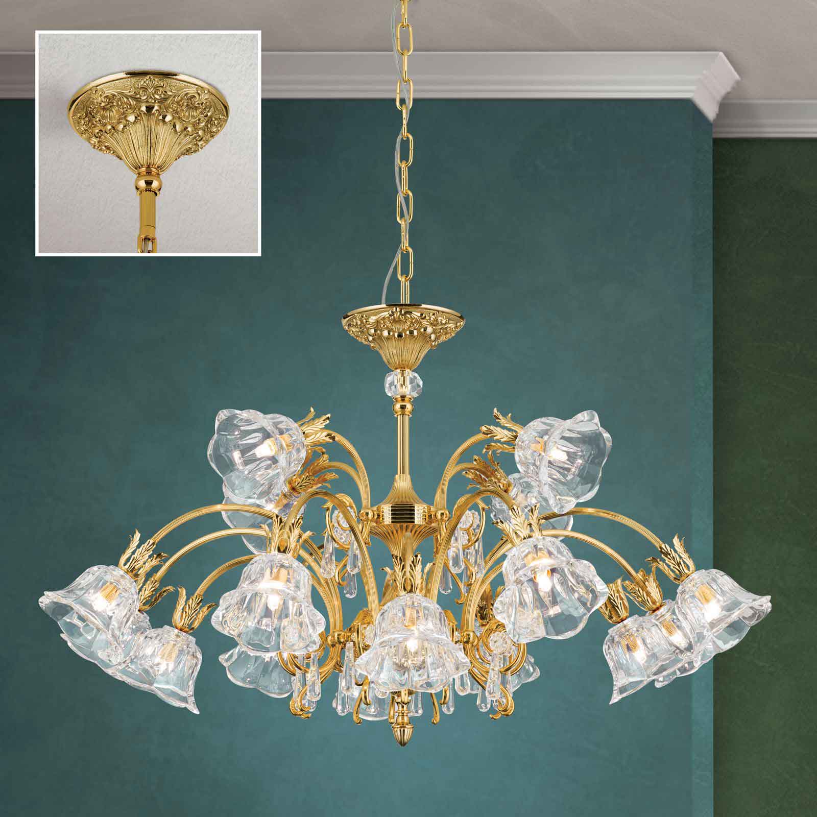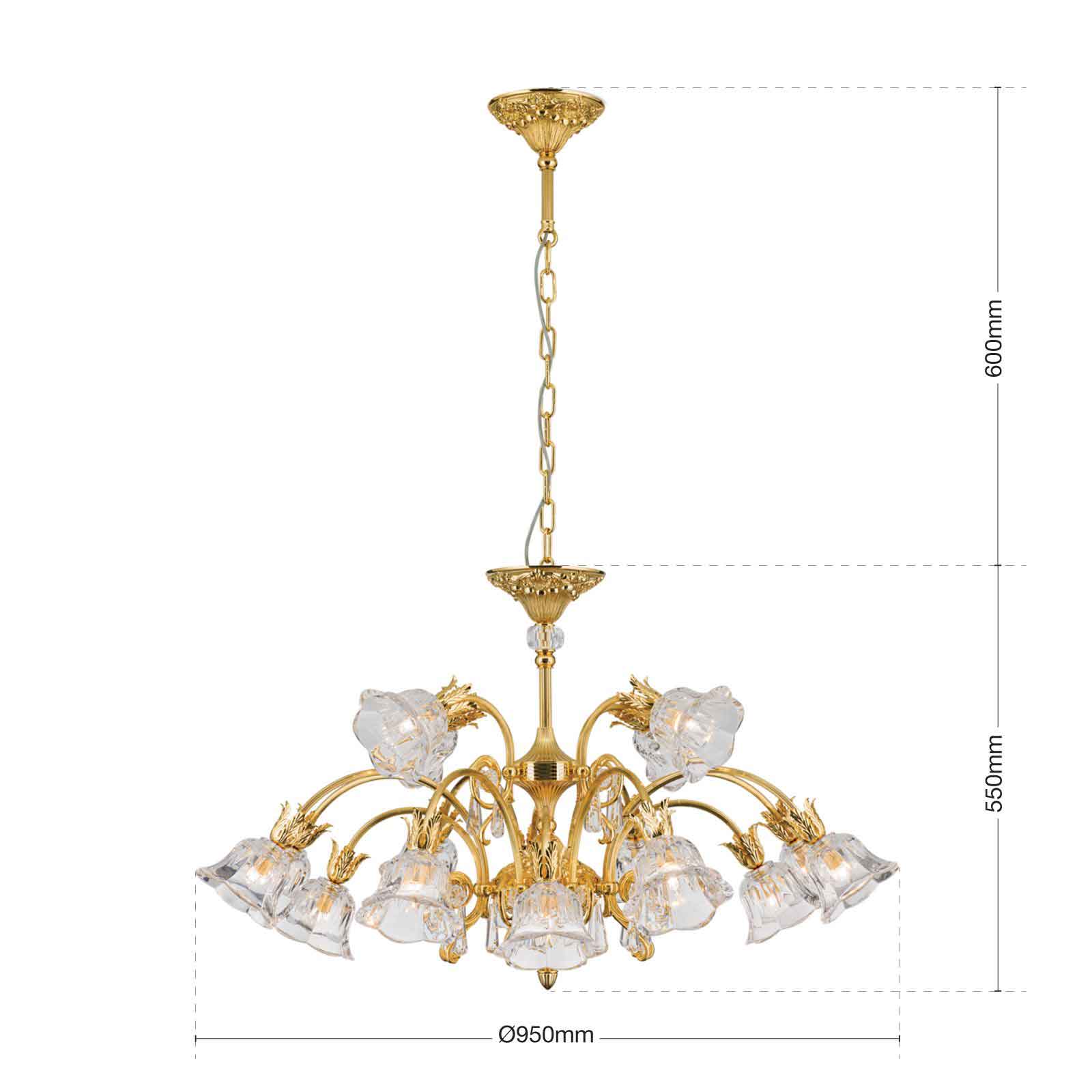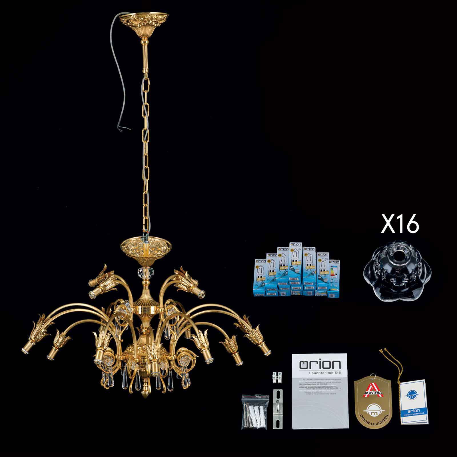 Leuchtmittel sind bei dem klassischen Kronleuchter gold Modell Bohème inklusive. Die klassische Deckenlampe entspricht der Schutzart IP 20 und ist damit ausschließlich für Innenräume als Beleuchtung geeignet. Das Nettogesamtgewicht beträgt der diese Leuchte 20 Kilogramm, was auch bereits ein Zeichen für die hohe Qualität ist. Der klassische Kronleuchter gold Modell Bohème ist eine exklusive Innenbeleuchtung für gehobene Ansprüche. Die dekorative Decken-Hängeleuchte ist auf Anfrage auch in der Oberflächenfarbe Alt-Patina oder Altsilber erhältlich. Alternativ empfehlen wir Ihnen auch unseren 11-flammigen klassischen Kronleuchter Messing.