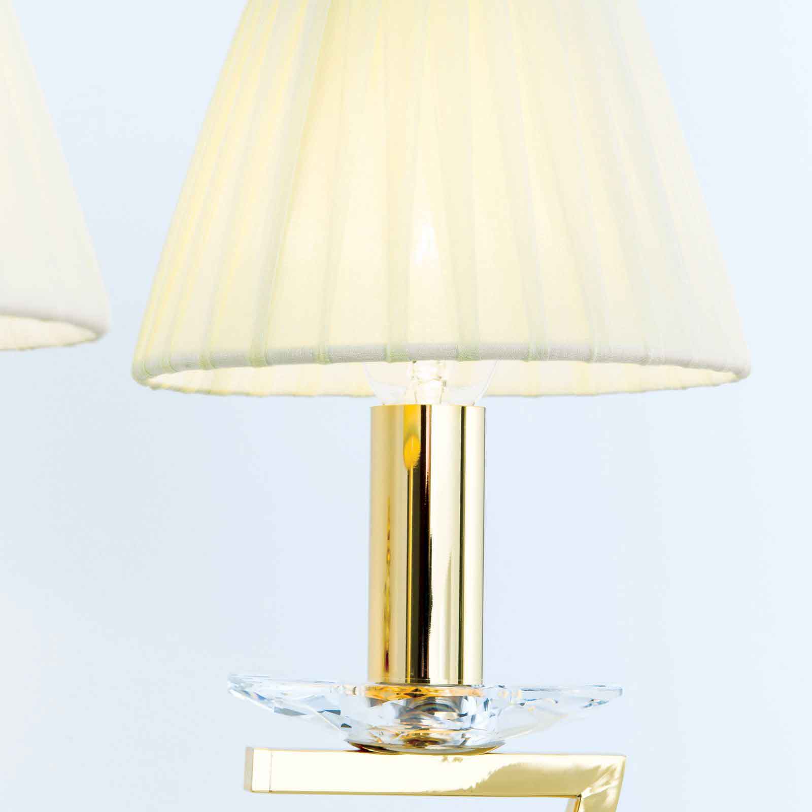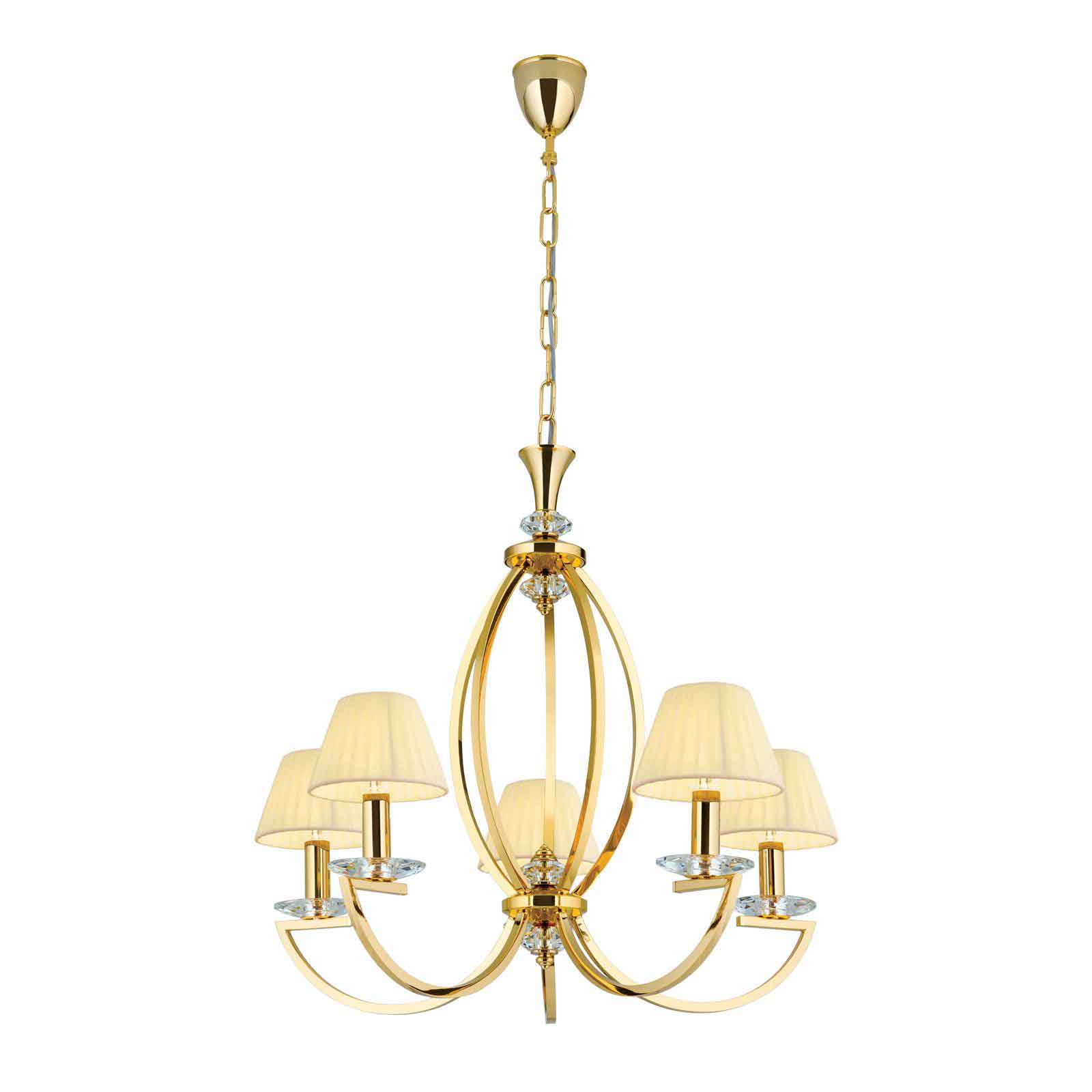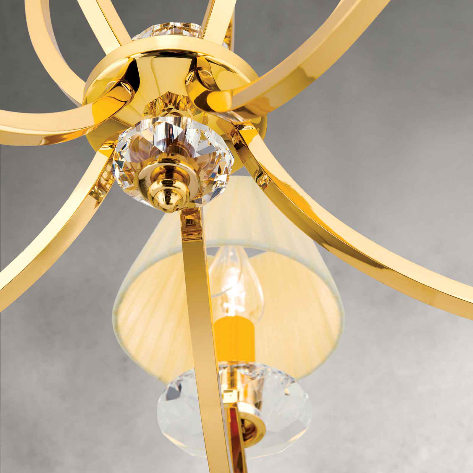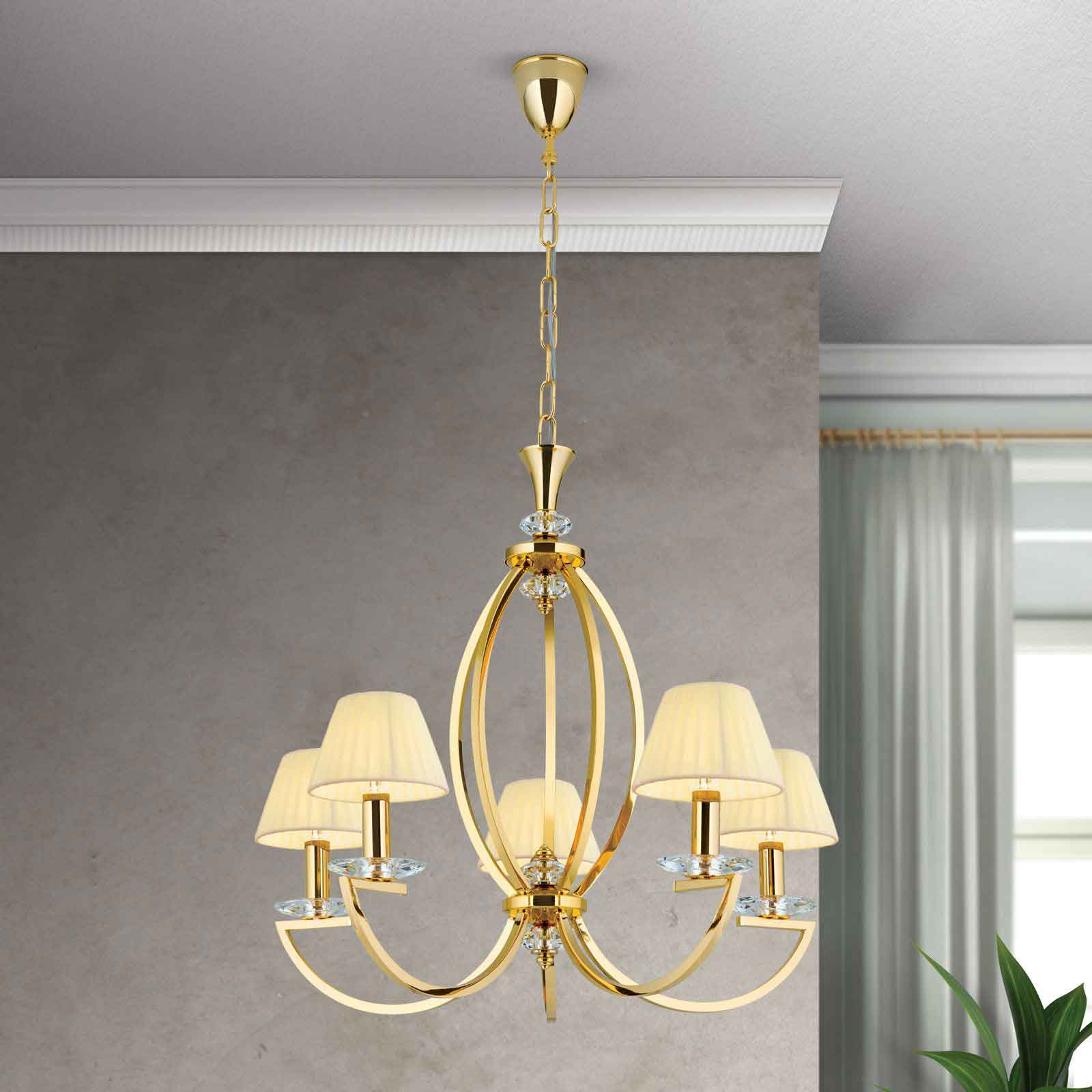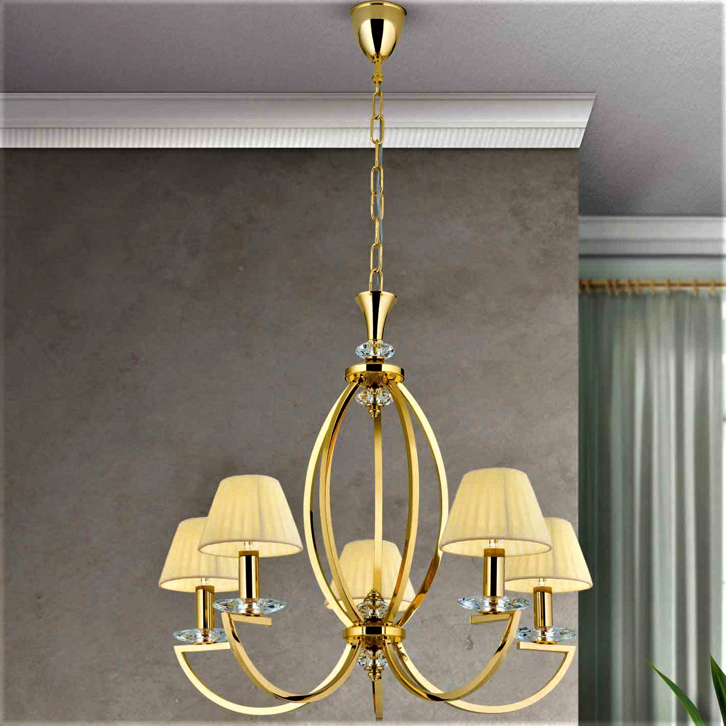Der 5-flammige klassische Kronleuchter mit Schirmen aus unserer Leuchtenserie Adele überzeugt mit Eleganz und Klasse. Der elegante Luster, wie ein Kronleuchter in Österreich auch genannt wird, ist ein Spiel aus verschiedenen Formen, Farben betucht mit goldenem Glanz. Vollmessingrohre mit quadratischem Querschnitt bilden in verspielten Bögen die eindrucksvollen Leuchtenarme des klassischen Kronleuchters mit Schirmen und erinnern dabei an prunkvolle Kutschen vergangener Epochen. Die stilvolle Deckenbeleuchtung ist 58 cm hoch und misst einen Durchmesser von 63 cm. Die Länge der Abhängung beträgt 70 cm. Eine klare Linienführung sorgt bei der stilvollen Deckenleuchte für den modernen Charakter und wird dank der Oberflächenveredelung mit 24 Karat Gold zu einem ganz besonderen Blickfang. Ein weiteres Highlight sind die dezent eingesetzten STRASS® Swarovski® Kristalle, die als Tassen unterhalb der Kerzenlampen oder als Knäufe im mittleren Aufbau das Auge des Betrachters buchstäblich faszinieren. Bestückt mit klaren LED-Kerzenlampen lässt sich das unverwechselbare Kaleidoskop hervorragend bewundern und verbreitet im Raum sofort ein angenehm positives Lebensgefühl. Für die E 14-Fassungen werden Leuchtmittel bis zu 40 Watt verwendet. Wir möchten, daß Ihre neue Deckenleuchte sofort bei Installation einsatzbereit ist und fügen Ihrer Lieferung daher kostenfrei und inklusive 5 LED-Kerzenlampen in matt (4,5 Watt) bei. Die fünf E14-Lampenfassungen werden von farblich abgestimmten Stoff-Textilschirmen in der Farbe Champagne ummantelt und prägen beim klassischen Kronleuchter mit Schirmen den gemütlich atmosphärischen Schein des Lusters. Wir haben für unsere Kunden einige Tipps zur Berechnung der richtigen Leuchtengröße aufgeführt. Schauen Sie gern unter dem folgenden Link Kronleuchter für weitere Infomationen. Denn schließlich sollte die Größe Ihrer neuen Deckenbeleuchtung zu der Raumgröße und Umgebung passen. Setzen Sie mit der richtigen Beleuchtung tolle Lichtakzente und untermalen Sie die Schönheit Ihrer Innenräume.