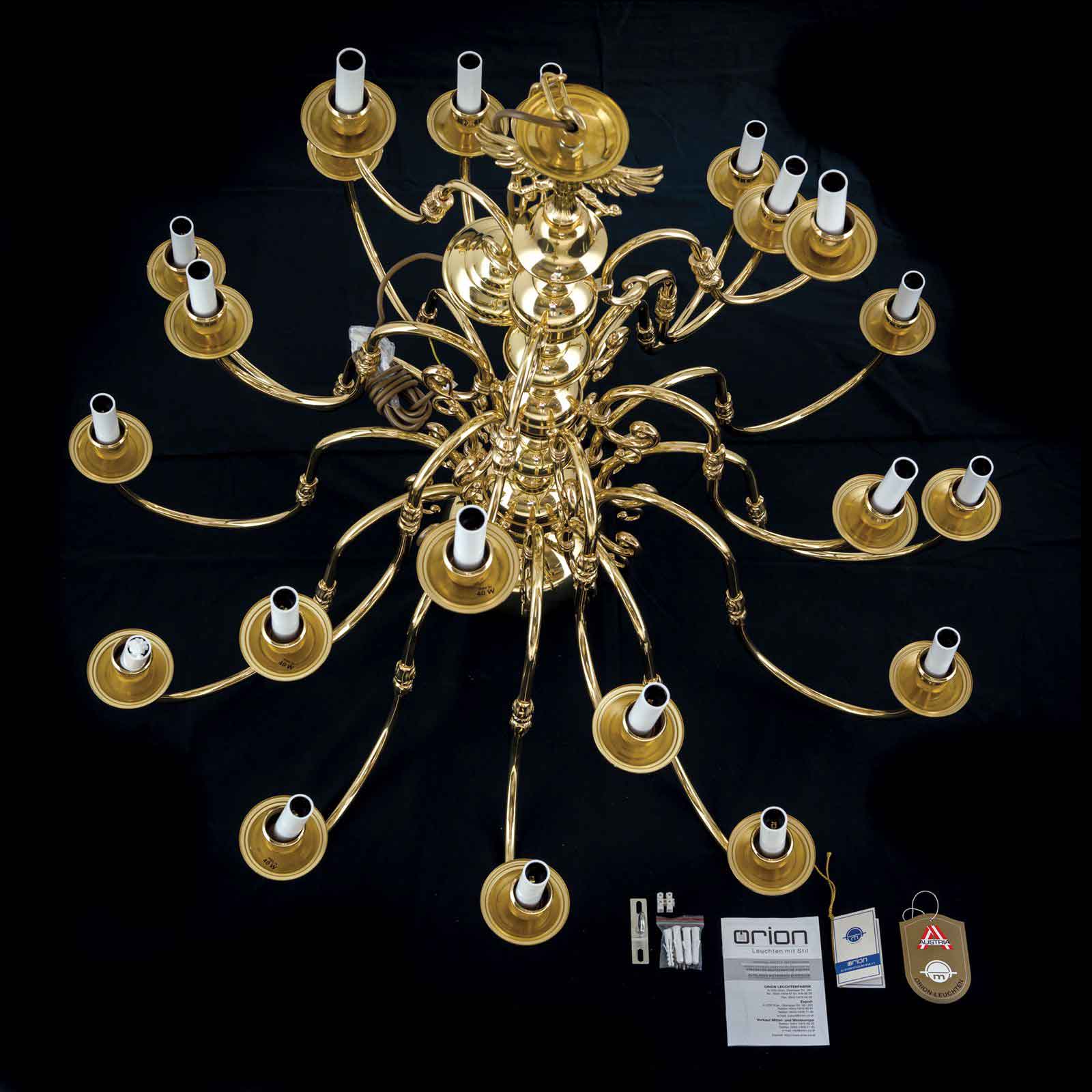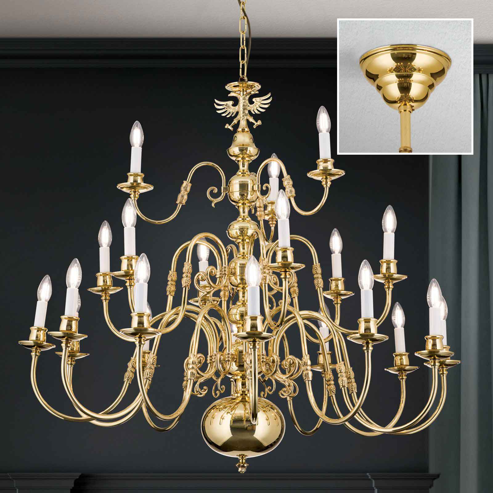 Der 21-flammige klassische Kronleuchter Gracia verzaubert Ihr Foyer, Ihren Eingangsbereich oder eine größere Empfangshalle mit einem Hauch von Nostalgie und feudaler Eleganz. Die von ihren Maßen ausladende Innenleuchte überzeugt mit zahlreichen Stilelementen. Die in Österreich auch als Luster bekannte Deckenleuchte wird hier in der Ausführung glänzendes Messing angeboten. Das Leuchtengestell wird fachmännisch und sehr hochwertig aus Messing gefertigt. Der klassische Kronleuchter Modell Gracia spendet auf drei Leuchtenebenen mit 12+ 6+ 3 Kerzenlampen viel Helligkeit in Ihren Innenräumen. Die besonders stilvolle 3-stöckige Deckenleuchte ist von ihren Maßen bei einem Durchmesser von 106 Zentimetern allein 96 cm hoch. Die Länge der Abhängung beträgt dazu 70 cm. Damit hängt die Deckenleuchte als absoluter Eye-Catcher insgesamt 1,66 Meter unter der Raumdecke. Setzen Sie mit diesem Stilluster unseres österreichischen Herstellers einmalige Lichtakzente mit imposantem Ausmaß. Der klassische Kronleuchter Gracia ist dimmbar. Die maximale Bestückung pro Lampenfassung beträgt 40 Watt Leistung. Sie bekommen den hochwertigen im Design klassischen Kronleuchter bei uns inklusive 22 Kerzenlampen in matt, 4,5 Watt Leistung in der Lichtfarbe Warmweiß (2700 Kelvin) mit einer Lichthelligkeit von jeweils 470 Lumen geliefert. Wir möchten schließlich, daß Sie sich nach erfolgter Installation auch sofort an dem hellen Licht erfreuen können. Ein zusätzliches Leuchtmittel fügen wir daher als Reserve zusätzlich bei. Diese Decken-Hängeleuchte ist geeignet, einen 60 qm-großen Raum mit ausreichend Licht zu versorgen. Wir haben für unsere Kunden einige Tipps zur Berechnung der richtigen Leuchtengröße aufgeführt. Schauen Sie gern unter dem folgenden Link Kronleuchter für weitere Infomationen. Denn schließlich sollte die Größe Ihrer neuen Deckenbeleuchtung zu der Raumgröße und Umgebung passen.