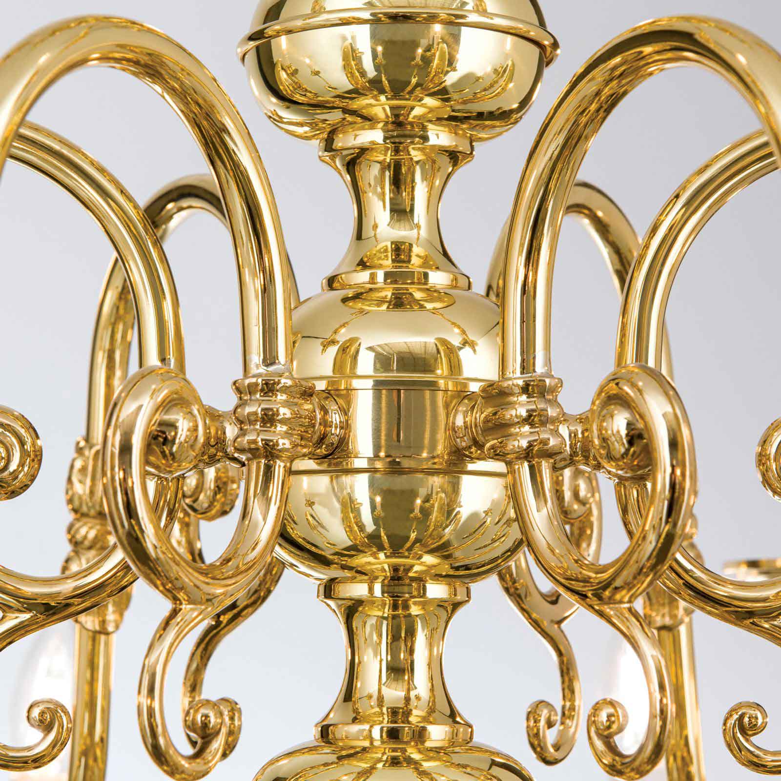 Der klassische Kronleuchter Gracia überzeugt im Design mit zahlreichen Bögen, formschönen Kerzenhaltern, einem Messing-Adler am unteren Ende der Abhängung, Voluten und Ranken. Letztere kennt man aus der alten Renaissance. Die spiralförmigen Einrollungen wurden architektonisch bereits früher an den ionischen Säulen und Giebeln als Schmuckelement verwendet. Setzen Sie stilvoll und dekorativ und gleichzeitig auch absolut funktional beeindruckende Lichtakzente in Ihren Räumlichkeiten. Die hohe Hängeleuchte Gracia entspricht der Schutzart IP 20. Eine exklusive Hotel-Deckenleuchte für hohe Ansprüche-dafür steht diese glitzernde außergewöhnliche Innenbeleuchtung.