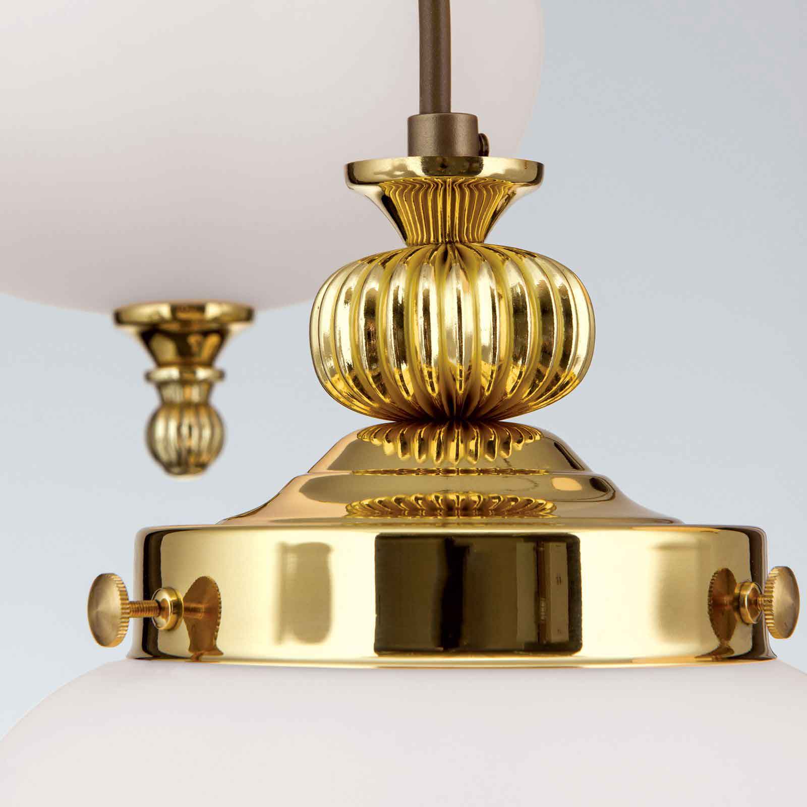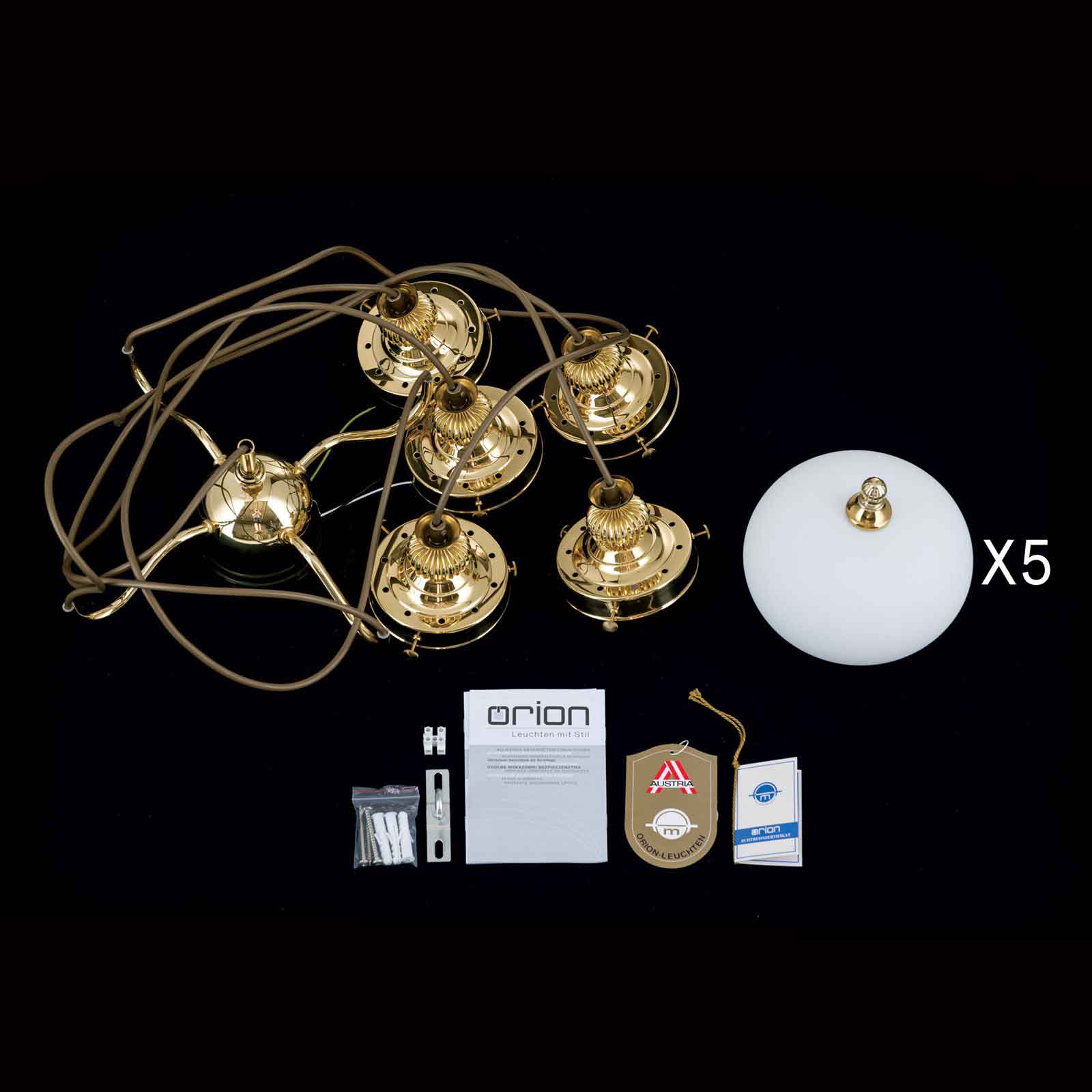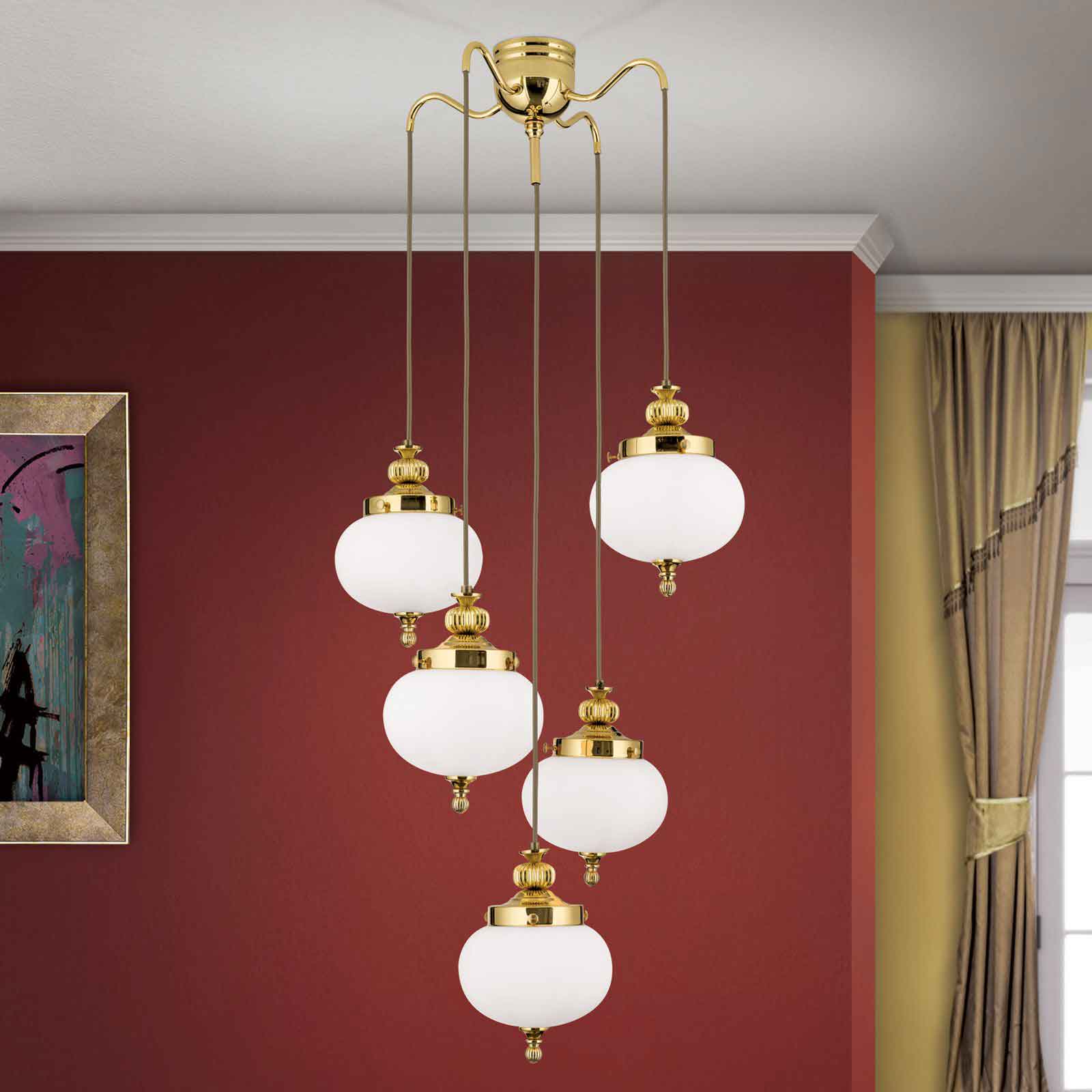 Der 5-flammige dimmbare klassische Messing-Kronleuchter aus der Leuchtenserie Belvedere überrascht mit fünf zueinander in der Höhe versetzten opalmatten Kugelleuchten, die aus edlen Messingröhren entspringen. Es ergibt sich durch die Kompaktheit der Komposition ein leuchtstarkes Lichtgebilde. Geräumige Wohnzimmer oder Hotelfoyers mit hohen Decken eignen sich besonders aufgrund der großzügigen Kabellänge. Die dekorative Deckenbeleuchtung schmückt mit ihrem glänzenden Messing aber auch einen repräsentativen Eingangsbereich mit hoher Decke. Auch ein großzügig bemessener Salon wäre dafür eine adäquate Räumlichkeit, die dieser nostalgisch-klassischen Deckenbeleuchtung genügend Raum verschafft. Die stiltypischen Zierelemente der Einfassungen und an den Schirmunterseiten ergänzen und unterstreichen bei diesem klassischen Kronleuchter Messing geschmackvoll ein antikes Interieure. Die stilvolle Kugel-Deckenleuchte verfügt über fünf E27-Fassungen zu je maximal 60 Watt. Sie erhalten bei uns 5 LED-Leuchtmittel entsprechend der Empfehlung des Herstellers bei der Lieferung inklusive. Wir haben für ein eher stimmungsvolles Licht die Lichtfarbe Warmweiß (2700 Kelvin) gewählt. Die 8 Watt starken LED-Leuchtmittel sind selbstverständlich später austauschbar.