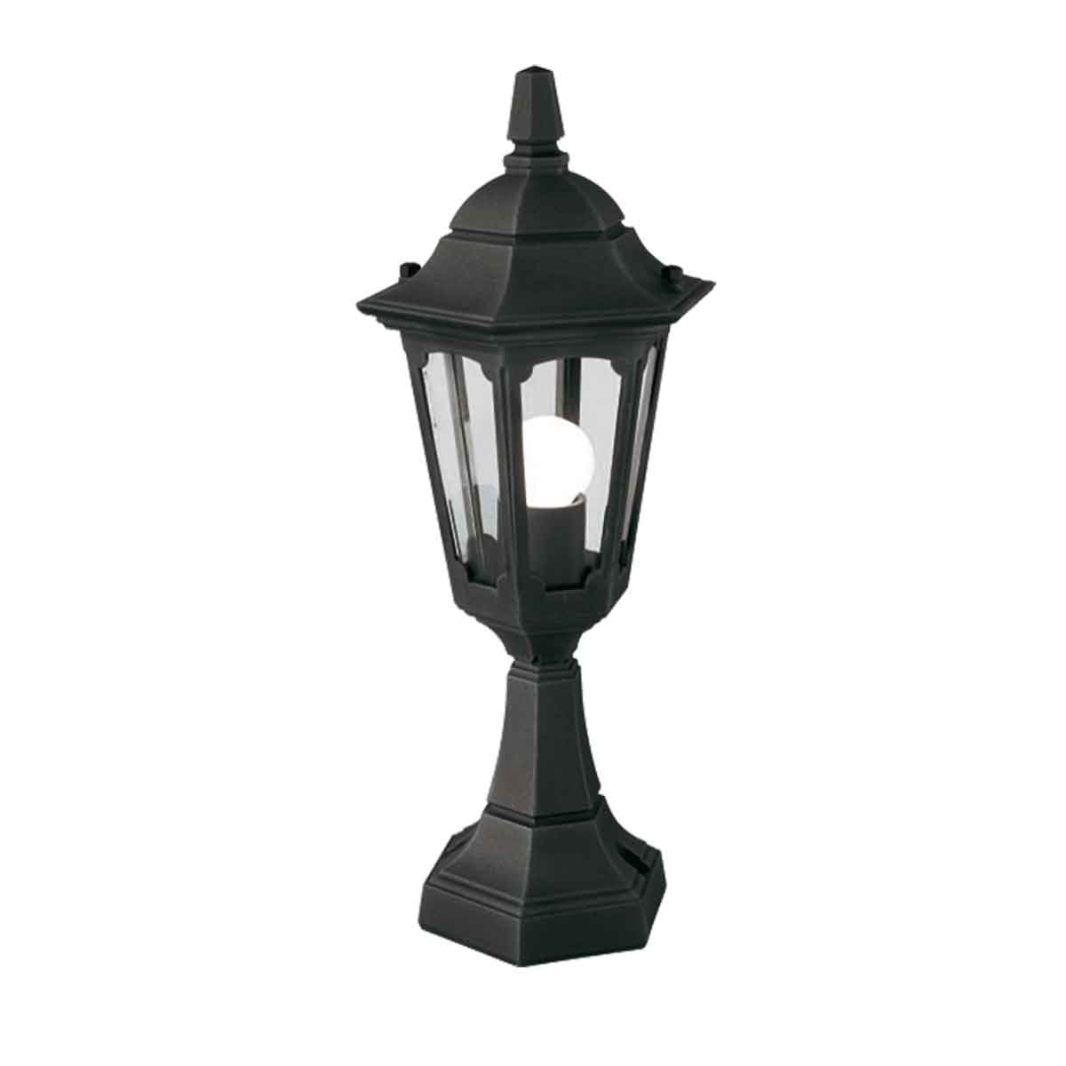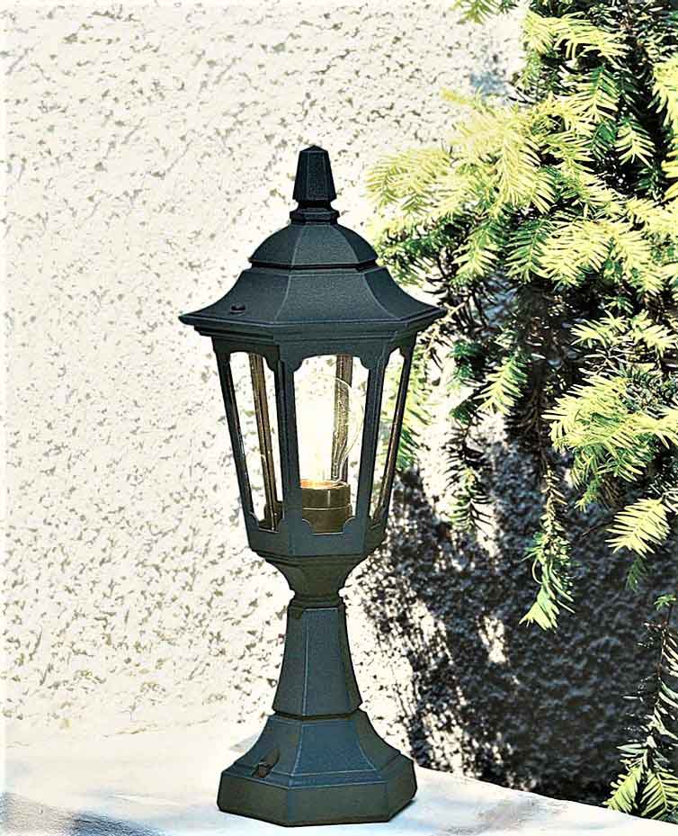 Sie sind auf der Suche nach einer eher kleineren Außenleuchte für vorhandene Pfähle, Mauerabsätze oder einem bereits vorhandenen Sockel? Die kleine Sockellampe rustikal aus unserer Modellserie Canterbury-Mini bringt mit ihrem antik-rustikalem Design geschmackvoll Licht in dunkle Ecken. Beleuchten Sie damit Wege, Treppenaufgänge, Zaunpfosten oder montieren Sie die Sockelleuchte auf festem Untergrund im Bodenbereich. Die dekorative Garten-Sockelleuchte Canterbury-Mini ist von ihren Maßen 45 cm hoch und 18 cm breit. Die wetterfeste Aussenbeleuchtung überzeugt mit langlebigen Materialien und einem zeitlosen Oberflächen-Finish in der Farbe Schwarz. Die sechseckige Außenleuchte wird in England fachmännisch im Alu-Druckguss-Verfahren gefertigt. Das Gussmetall steht für eine hohe Korrosions- und Witterungsbeständigkeit. Die sechs Fenstereinsätze werden bei der kleinen Sockellampe rustikal aus Klarglas gefertigt. Die Sockelleuchte rustikal gibt es bei uns auch als dekorative Wandlaterne mit aufwärts oder abwärts gerichtetem Laternenkorpus. Die Leuchtenserie Canterbury-Mini bietet zur Ergänzung für eine einheitliche Lichtgestaltung Ihres Außenbereichs auch eine Wegbeleuchtung mit ebenfalls sechseckigem Sockelfuß und einer Gesamthöhe von 95 Zentimetern. Wer noch gern eine höhere Mastleuchte oder einen mehrflammigen Kandelaber dazu kombinieren möchte, findet bei uns weitere dazu perfekt passende Außenleuchten in unserer Modellserie Canterbury mit größeren Leuchtenhauben im gleichen Design.