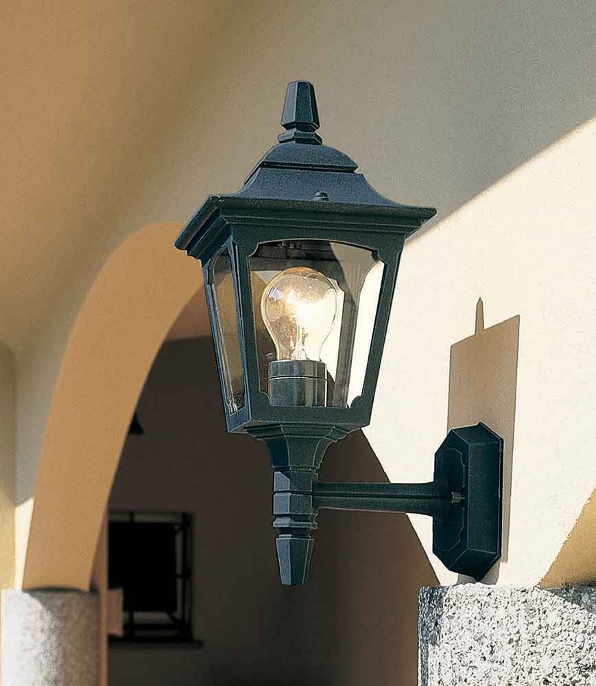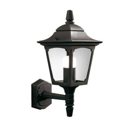 Die kleine Wandlaterne rustikal aus unserer Modellserie Chapel-Mini ist an einem optisch passendem dekorativen Wandarm aus massivem Aludruckguss befestigt. Die wetterfeste Aussenbeleuchtung überzeugt mit klaren Linien und langlebigen Materialien. Die Outdoor-Wandleuchte wird in England gefertigt und besteht aus Aluminium-Druckguss. Das Metall steht für eine hohe Korrosions- und Witterungsbeständigkeit. Die vier Fenstereinsätze werden bei der kleinen Wandlaterne rustikal aus Klarglas gefertigt. Die stilvolle Aussenleuchte ist von ihren Maßen 38 cm hoch, 17 cm breit und hat insgesamt einen Wandabstand von 24 cm. Die Leuchtenserie bietet zur Ergänzung für eine einheitliche Lichtgestaltung Ihres Außenbereichs diverse weitere Leuchtenarten an; Sockelleuchte, Mastleuchte, Wegbeleuchtung bis zum 2-flammigen Kandelaber mit einer Gesamthöhe von 2,27 Meter. Damit lässt sich Ihr Extérieure geschmackvoll im einheitlichen Design planen. Die kleine Wandlaterne rustikal Modell Chapel-Mini passt im Design natürlich ebenso zu der Modellserie Chapel mit größerem Leuchtenkorpus.