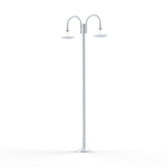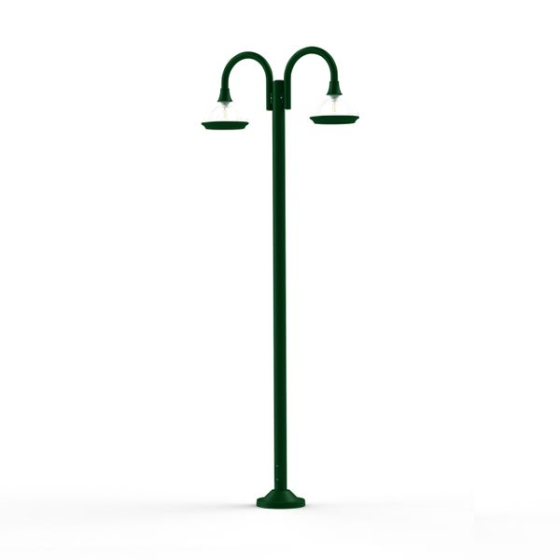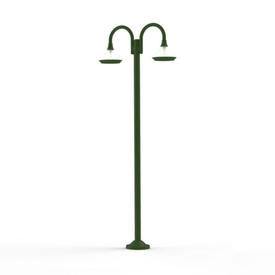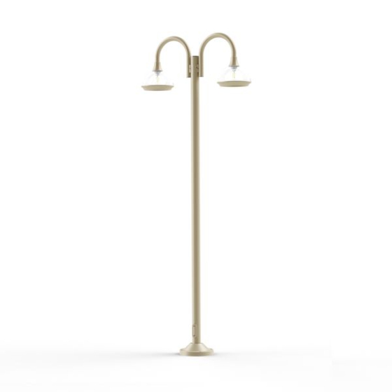 Unsere mediterrane Aussenleuchte 2-flammig ist eine Outdoor-Stehleuchte mit zwei Lampenschirmen. Stilvoll und authentisch zeigt sich unsere Leuchtenserie Bolero. Unsere im Design mediterrane Mastleuchte Bolero bringt nicht nur Licht in Ihren Außenbereich, sondern setzt auch ein beeindruckendes Statement in puncto Stil. Diese rundförmige Außenbeleuchtung mit zwei Lampenschirmen präsentiert sich mit einem in der gleichen Farbe behandelten Mast und u-förmig geschwungenen Leuchtenarmen, welcher die dekorativen Lampenschirme robust nach unten gerichtet stilvoll tragen. Die v Bolero vereint spanische Eleganz mit innovativem Design und verleiht Ihrem Außenbereich einen Hauch von besonderem Charme. Mit einer Höhe von 234,5 cm, einer Breite von 90,4 cm und einer Tiefe von 25 Zentimetern wird die Designer Aussenleuchte Bolero zum stilvollen Blickfang in Ihrem Vorgarten, in Ihrer Auffahrt oder auch im Ihre Immobilie weitläufig umgebenden Außenbereich. Die mediterrane Aussenleuchte 2-flammig ist jeweils mit einer E27-Fassung ausgestattet und wird pro Seite mit bis zu 105 Watt bestückt. Leuchtmittel sind bei der Lieferung nicht enthalten. Das prismatisierte Klarglas erzeugt ein faszinierendes Lichtspiel und verleiht Ihrem Außenbereich eine warme und ganz eigene Lichtatmosphäre. Wählen Sie bei der mediterrane Aussenleuchte 2-flammig Modell Bolero zwischen den Farben stahlblau (RAL 5011), weiß, schwarz, schiefergrau, farngrün (RAL 6025), tannengrün (RAL 6009), dunkelgrün (RAL 6009) und beige (sandfarben). Das Aluminiummaterial garantiert nicht nur Langlebigkeit, sondern verleiht der hohen Gartenleuchte auch eine moderne Note. Der untere Kragen besteht bei den beiden Lampenschirmen ebenfalls aus Aluminium, was auch für eine zusätzliche Stabilität sorgt; schließlich ist eine Außenleuchte Wind und Wetter ausgesetzt. Der französischer Hersteller ist bekannt für seine erstklassige Handwerkskunst und wegweisende Designs. Die mediterrane Aussenleuchte 2-flammig Modell Bolero kommt mit einer 25-jährigen Antikorrosionsgarantie, die Ihnen langanhaltende Freude an dieser zweiflammigen Außenleuchte garantiert. Tauchen Sie Ihren Außenbereich in ein zauberhaftes Lichtermeer und setzen Sie mit unserer rundförmigen Designer Aussenleuchte Bolero ein Statement der Eleganz. Wir empfehlen Ihnen dazu passend auch die mediterrane Hängelampe Bolero als Beleuchtung unter Mauervorständen oder als dekorative Deckenleuchte im Outdoorbereich oder Wintergarten.