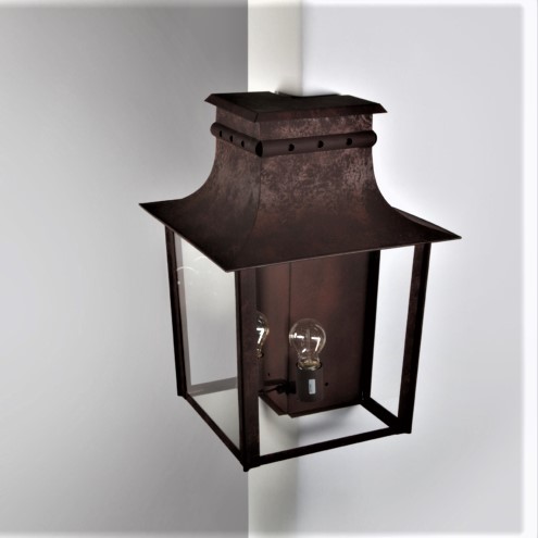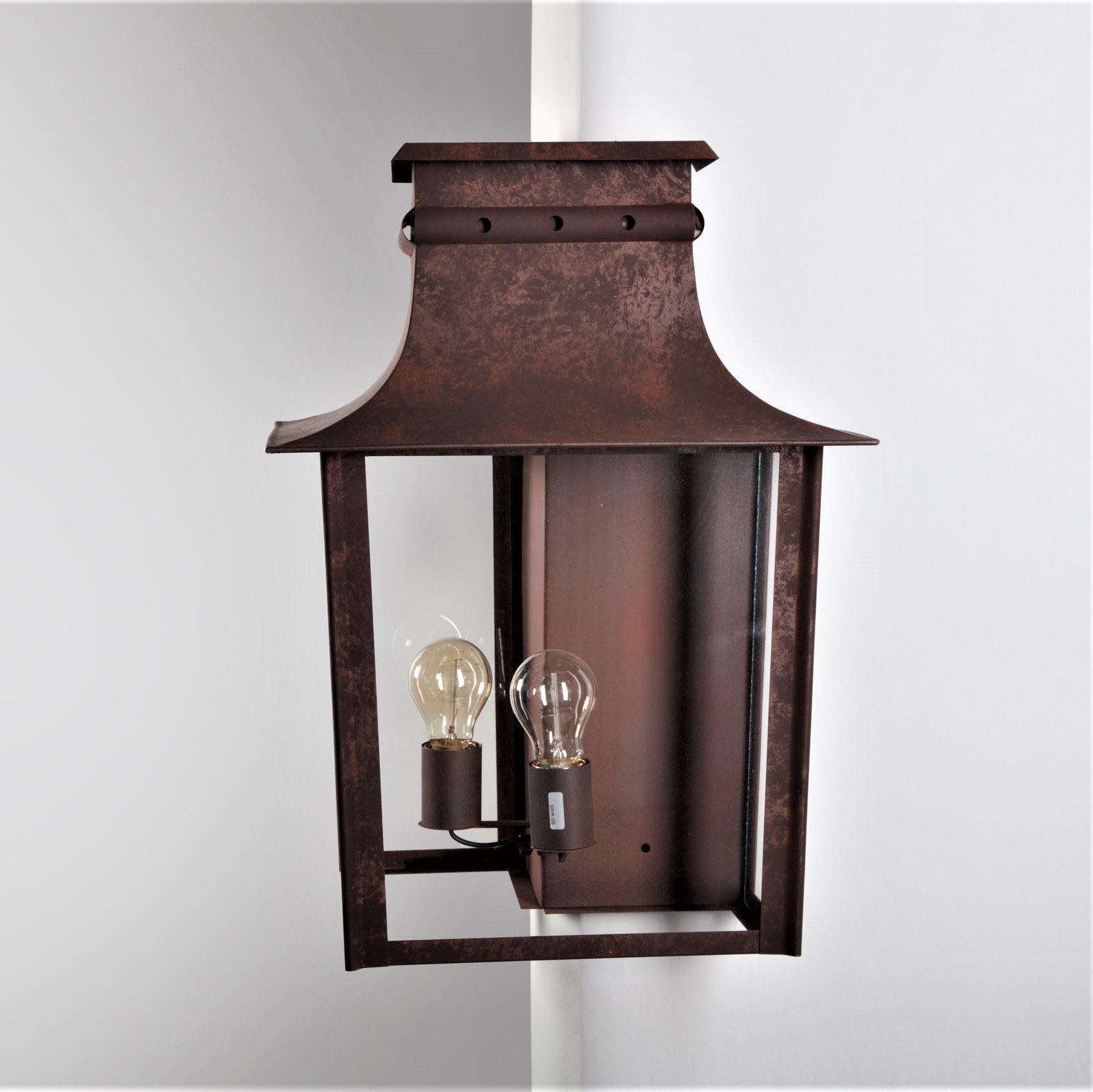 Die stilvolle nostalgische Eck-Aussenleuchte Modell Morzine ist insgesamt 54 cm hoch, 38 cm breit und 23 cm tief. Die in traditioneller Handwerkstechnik gefertigte exklusive Eckleuchte für Außen wird als Unikat aus Messing hergestellt. Die Oberfläche wird fachmännisch behandelt und zeigt das Finish Rost. Die klassisch-antike Aussenleuchte entspricht der Schutzart IP 23 und kommt damit als Lichtquelle eher für etwas geschütztere Außenbereiche in Frage. Die in Design und Verarbeitung besondere Leuchte aus der französischen Manufaktur Lumart zieht sicherlich so manchen Blick auf sich. Wir empfehlen für eine noch schönere Optik moderne Retro-Leuchtmittel. Wer es eher etwas stimmungsvoller von der Beleuchtung mag, sollte die zwei E 27-Lampenfassungen mit Leuchtmitteln in der Lichtfarbe Warm-weiß bestücken. Leuchtmittel sind bei der Lieferung der besonders hochwertig verarbeiteten Außenleuchte Ecke Modell Morzine nicht enthalten. Sie verwenden bei der Außeneck-Beleuchtung Morzine herkömmliche Leuchtmittel bis 60 Watt Leistung. Energiesparlampen oder LED-Lampen sind bei vielen Brennstunden empfehlenswert. Moderne Retrolampen mit rundförmigenm Glaskörper geben der Leuchte optisch ein perfektes Flair. Die besondere Materialgüte und Verarbeitungsqualität machen die Aussen-Eckleuchte zu etwas ganz Besonderem.