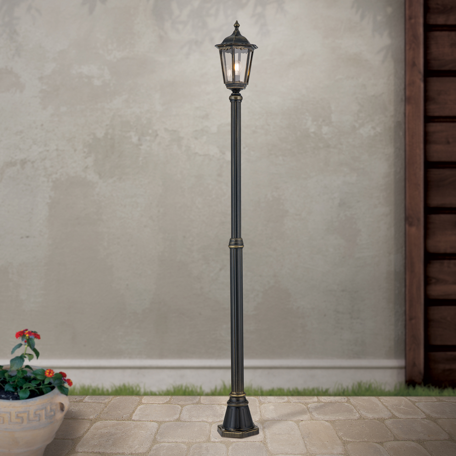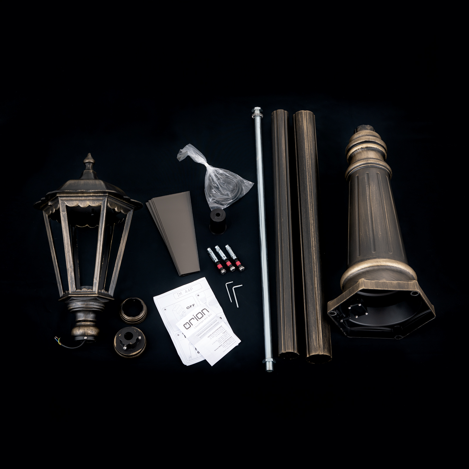 Die rustikale Aussenleuchte 249cm aus unserer Leuchtenserie Kaprun ist insgesamt 2,49 Meter hoch. Die Laternenhaube ist 28 cm breit. Die dekorative Gartenlaterne wird aus Siluminguss hergestellt, einer besonders widerstandsfähigen Aluminiumgusslegierung aus Aluguss in Verbindung mit Silicium. Silicium wird z.B. auch im KfZ- und Flugzeugbau als Material verwendet. Die Fenstereinsätze des sechseckigen Laternenkorpusses werden aus hochwertigem Rauchglas gefertigt. Rauchglas erfreute sich schon bereits in den sechziger Jahren in der Beleuchtung großer Beliebtheit und besticht in seiner Lichtwirkung mit eher weichen Linien. Die rustikale Aussenleuchte gehört zu unserer rustikalen Leuchtenserie Kaprun. Die stilvolle Gartenbeleuchtung kommt vom österreichischen Hersteller Orion-Leuchten und hat ein Gesamtgewicht von 10,3 Kilogramm. Das dekorative Leuchtendach überzeugt das Auge des Betrachters mit seiner extravaganten Form. Die schwarz-goldene Außenleuchte eignet sich als dekorative Wegbeleuchtung, als Terrassenbeleuchtung oder auch als Lichtquelle in den Beeten. Die Gartenlaterne Kaprun eignet sich mit der Schutzart IP 43 eher für etwas geschütztere Standorte. Wir empfehlen die dekorative Aussenleuchte auch als Außenbeleuchtung Gastro für Restaurantbetriebe oder andere Gewerbe als stilvolle Außenbeleuchtung.