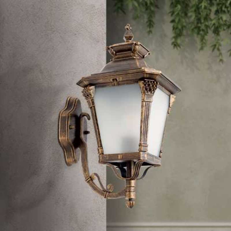 Die rustikale Aussenwandleuchte Modell Bregenz ist von den Maßen 47 cm hoch, 23 cm breit und 29 cm tief. Setzen Sie mit der aufwärts ausgerichteten Wandlaterne Ihren Hauseingangsbereich oder auch Nebengelasse stilvoll in Szene. Die klassisch-nostalgische Optik entsteht bei der rustikalen Aussenwandleuchte durch verschiedene Verzierungen und die klassische Laternenform. Die Laterne ist hierbei auf einer dekorativen Montageplatte zur Wandbefestigung montiert. Die antik-messingfarbene Wandlaterne ist Teil unserer Außenleuchtenserie Bregenz. Charakteristisch ist für diese Leuchtenserie ihr Schmiede-Designs mit filigranen Zierelementen und kannelierter Montur. Die viereckige Laterne wird von einem ebenso verziertem geschwungenem Wandarm getragen. Eine einbrennlackierte, handgewischte Patinafarbe veredelt den Siluminguss, der besonders korrosionsbeständig ist und verleiht ihr ein antikes Aussehen. Die rustikale Aussenwandleuchte ist mit weiß satiniertem Echtglas versehen. Das satinierte weiße Glas bewirkt dazu eine absolut blendfreie Außenbeleuchtung. Mit einer Höhe von knapp einem halben Meter eignet sie sich für den Einsatz repräsentativer Eingänge und Terrassen. Die antik rustikale Wandlampe Bregenz sollte mit der Schutzart IP 23 eher an etwas geschützteren Orten angebracht werden, zum Beispiel als Beleuchtung im vorderen Hauseingangsbereich unter dem Dachkasten. Die Wandlaterne Bregenz ist mit einer E27-Fassung mit einer maximalen Leistung von 60 Watt ausgestattet. Je nach Bestimmungsort und Erforderlichkeit wählen Sie die für Sie passenden Leuchtmittel. Ob LED-Leuchtmittel oder auch Energiesparlampe, ob warmweißes Licht für eine stimmungsvolle Beleuchtung oder lieber eher kaltweißes Licht (höhere Kelvinzahl) für mehr Helligkeit, Sie bestimmen mit der Leuchtmittelwahl die Lichtwirkung Ihrer neuen Außenbeleuchtung. Leuchtmittel sind bei der Lieferung daher nicht enthalten.